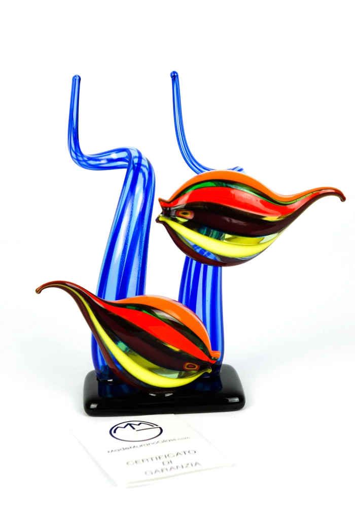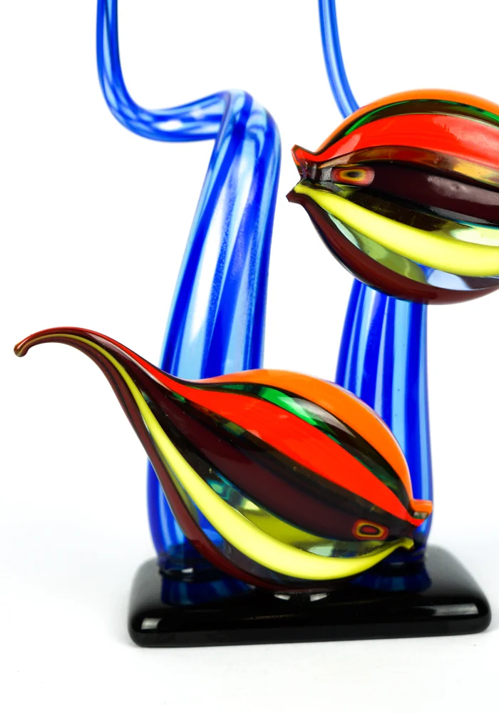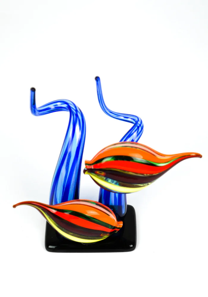 Scultura acquario con 2 Pesci Tropicali in vetro soffiato di Murano con lavorazione in “bacchette” di vetro multicolore e alghe blu.