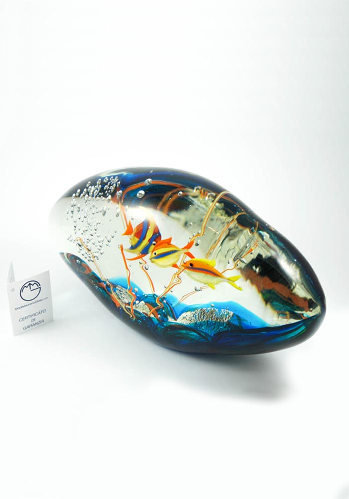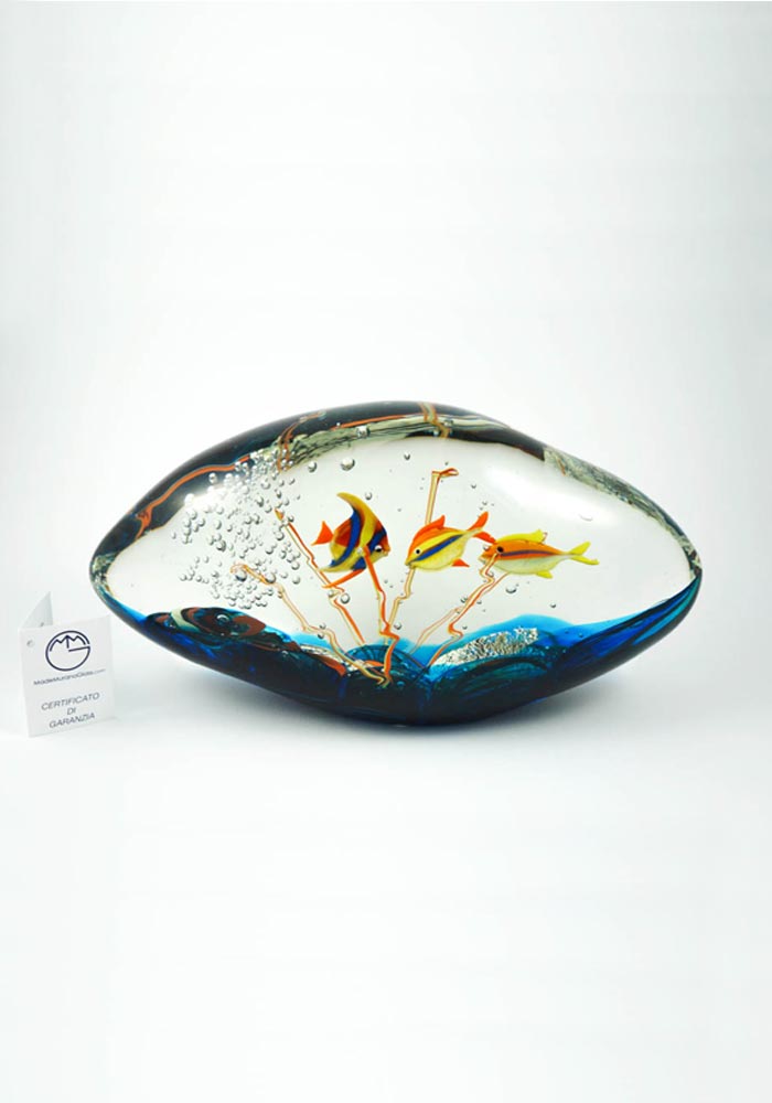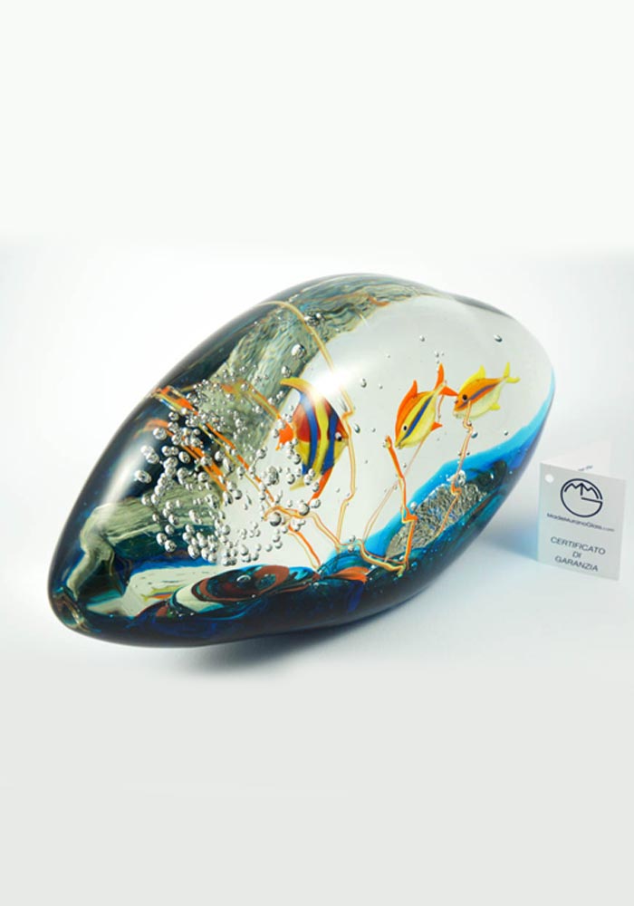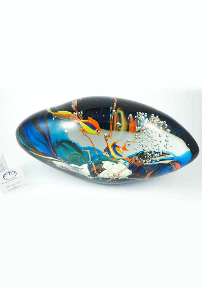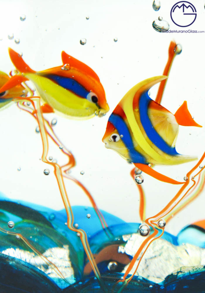 Per eseguire questa sorprendente opera i nostri Maestri vetrai Murano collaborano tra di loro con due tecniche di lavoro: la lavorazione del vetro a lume e la lavorazione vetro sommerso, la prima per eseguire i pesci e la seconda per sommergerli in una cascata di vetro fuso, rendendo il tutto unico e inimitabile.