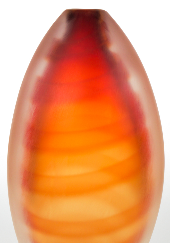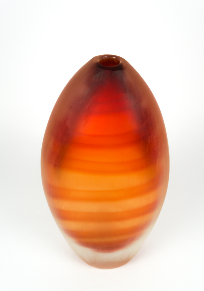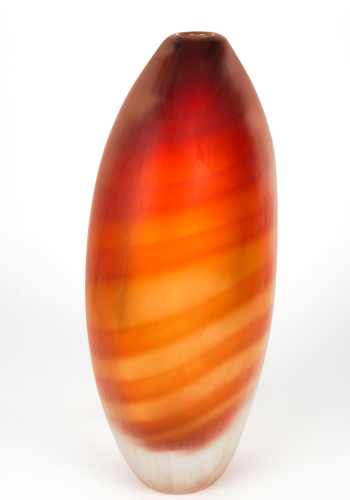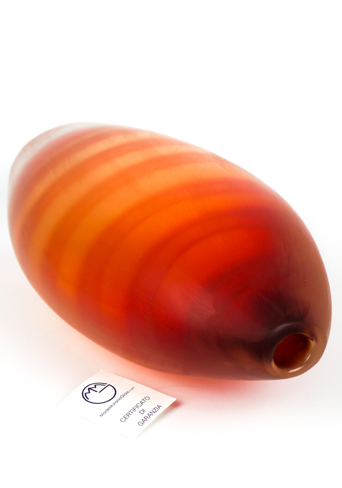 Alba è un fantastico vaso di grosso spessore in vetro di Murano lavorato a mano colore rosso con decorazione a fasce rosse e riflessi ambra. Opera unica ed esclusiva creata dal nostro maestro vetraio Roberto e firmata con incisione a freddo dall’artista. È un vaso moderno ideale per decorare elegantemente l’arredamento di ogni stanza della tua casa.