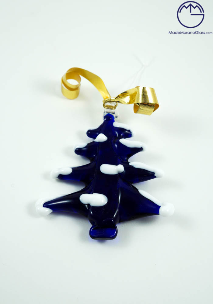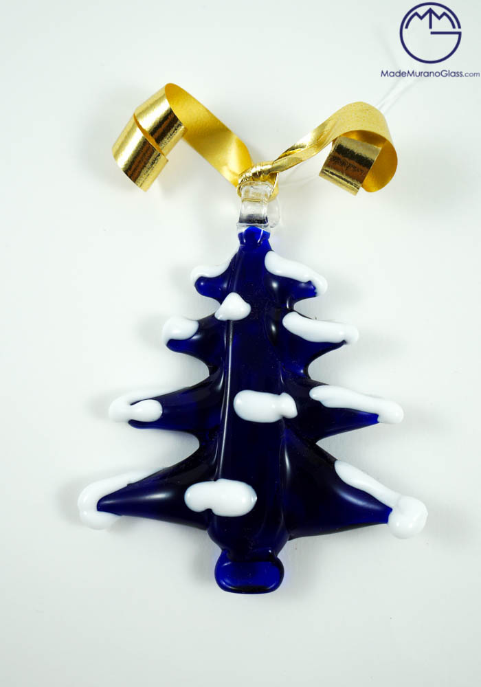 Albero di Natale in vetro di Murano colore blue con decorazioni bianche, eseguito con la tecnica della lavorazione del vetro a “lume” dal nostro Maestro vetraio Simone. Questi simpatici oggetti in vetro si possono appendere con un spago dove volete, così da avere una fantastica atmosfera natalizia unica e colorata.