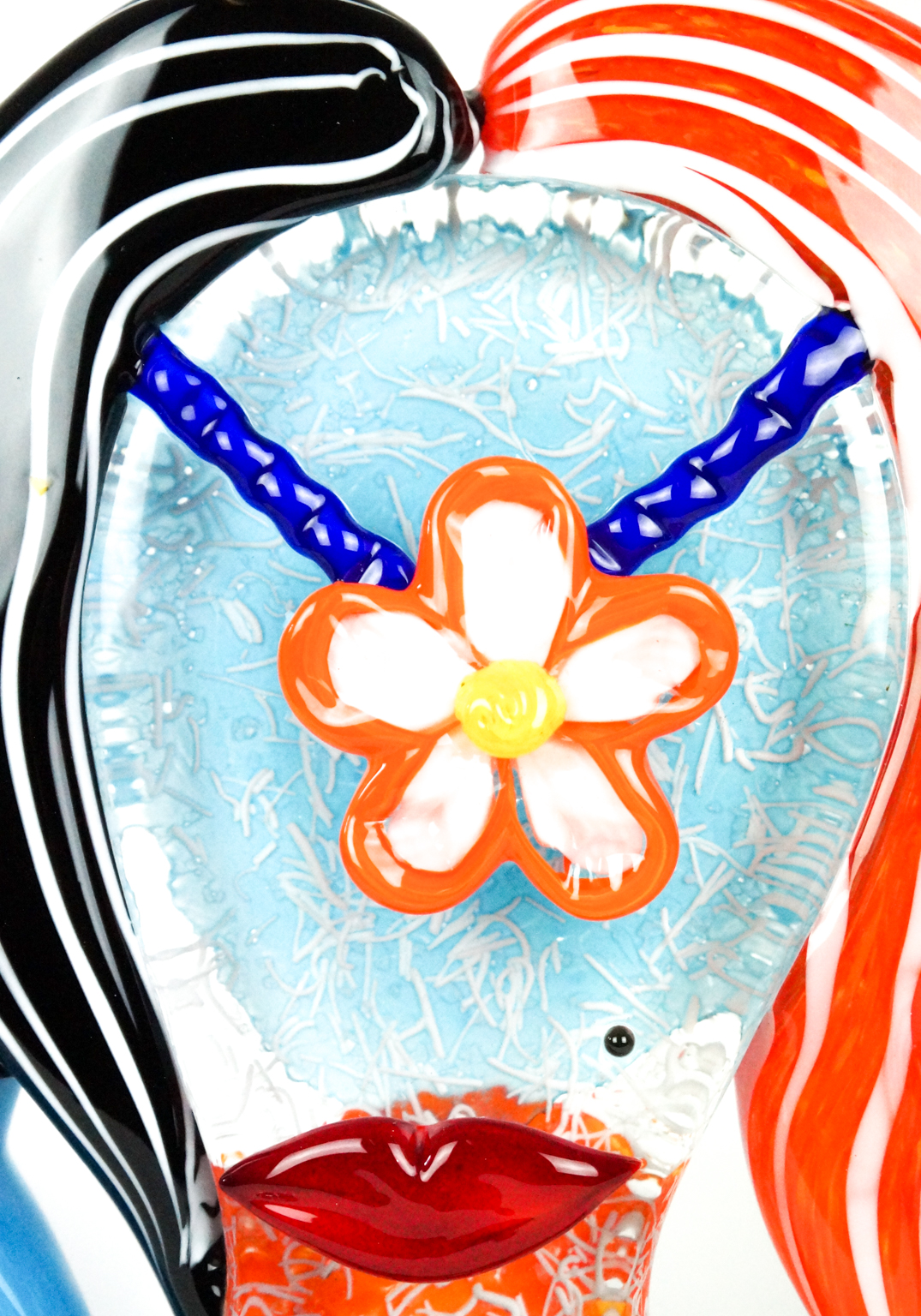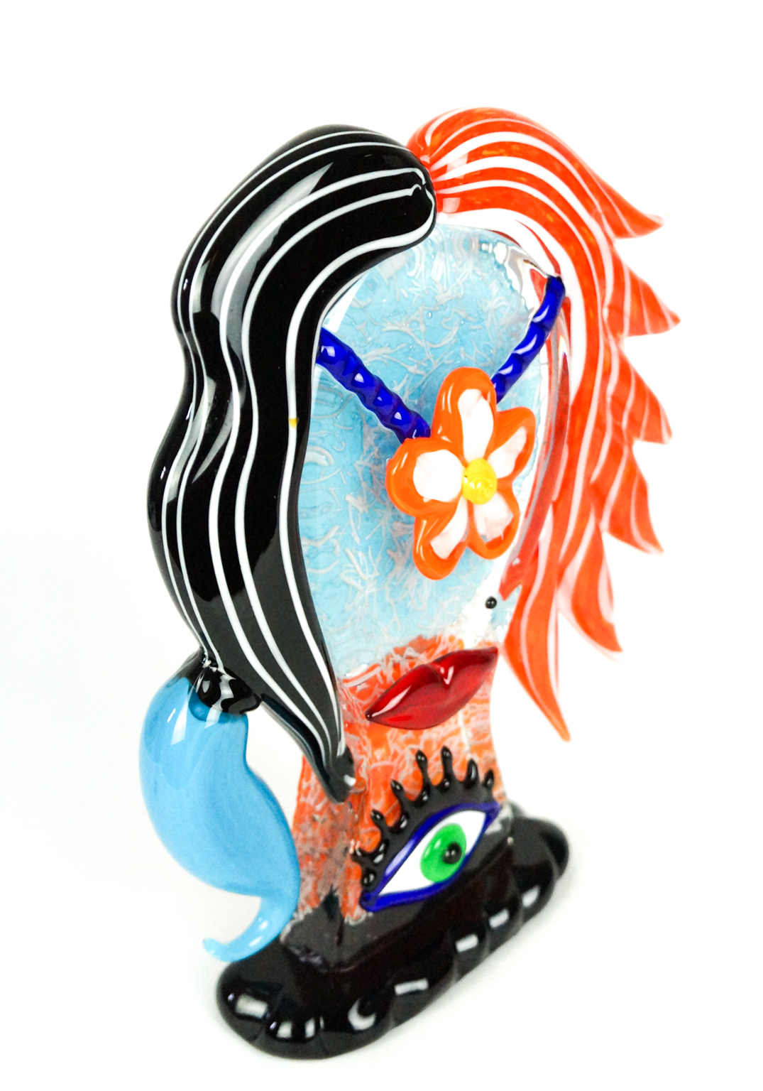 Testa di donna “Alice” in vetro di Murano eseguita dai nostri Maestri vetrai dell’isola di Venezia. Opera unica di rara bellezza ricca di sfumature di colori, completamente eseguita a mano in vetro massiccio e firmata con incisione a freddo dal Maestro vetraio. Pezzi unici eseguiti su disegno dalla nostra collaboratrice S.Lira in esclusiva solo per MadeMuranoGlass. Ogni singolo dettaglio è lavorato con molta cura e precisione. Non c’e’ opera d’arte più affascinante di una scultura in vetro di Murano: dagli elementi primari come sabbia e metalli nasce l’idea di un maestro che forgia gli elementi con il fuoco… un procedimento sublime e unico.