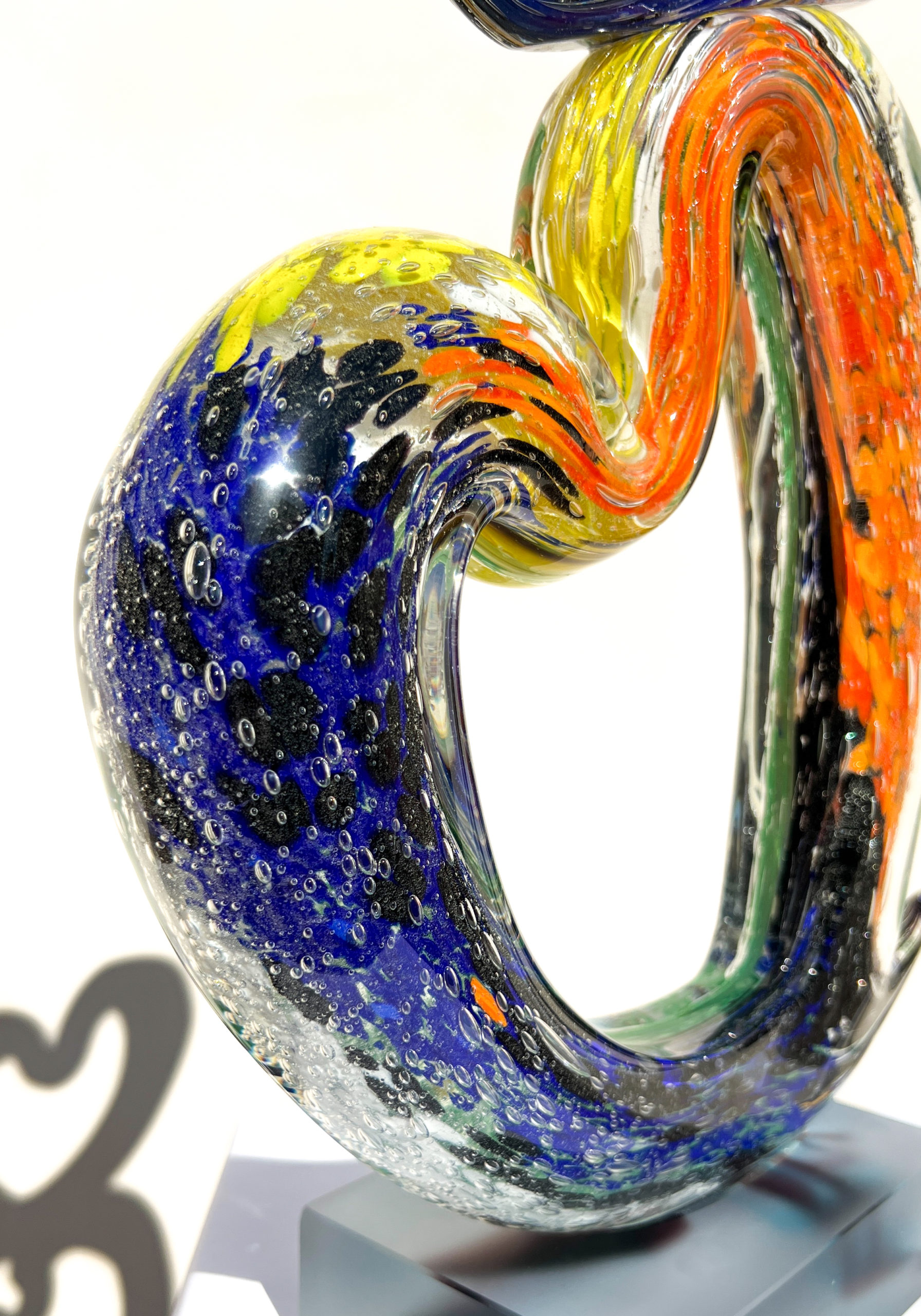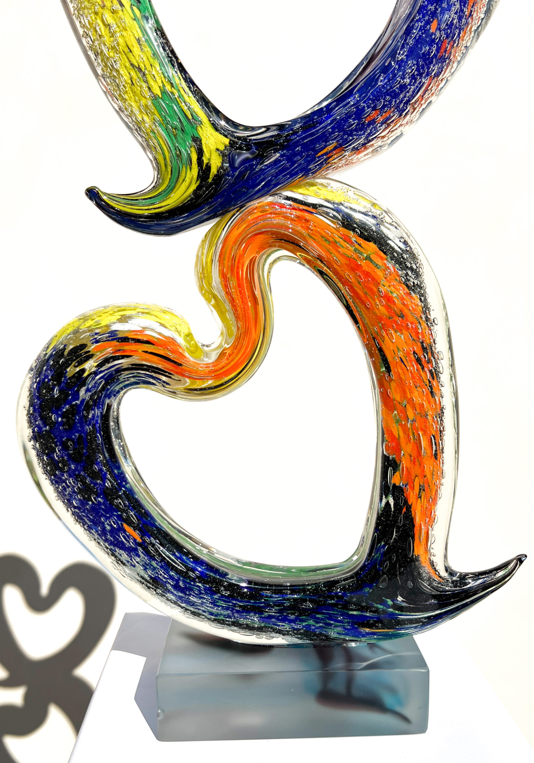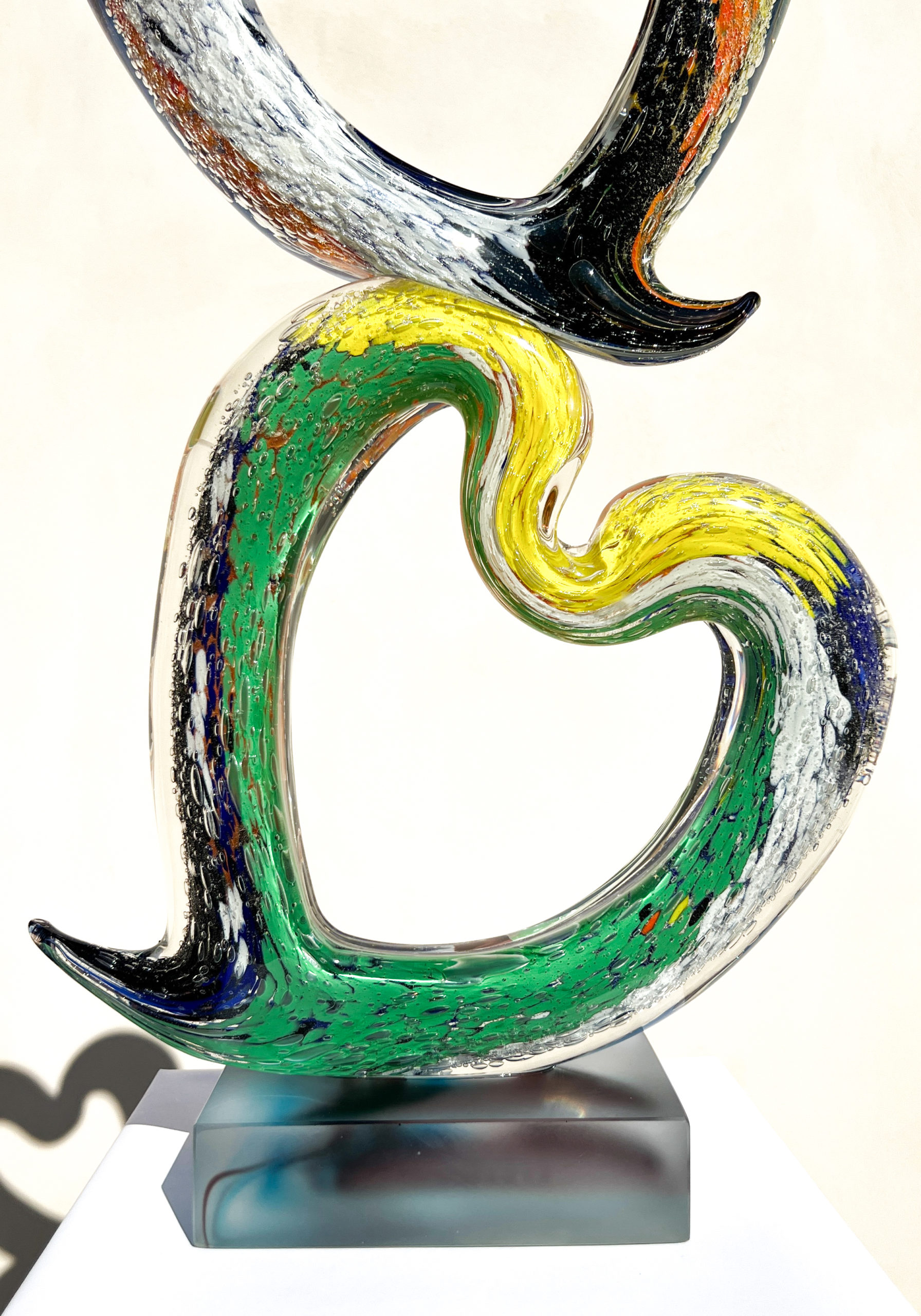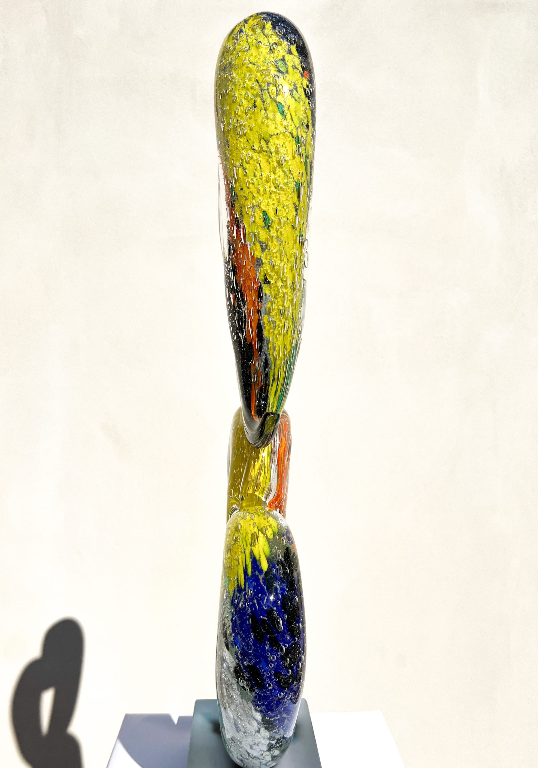 Scultura realizzata a mano in vetro massiccio con decoro interno multicolore e base satinata.