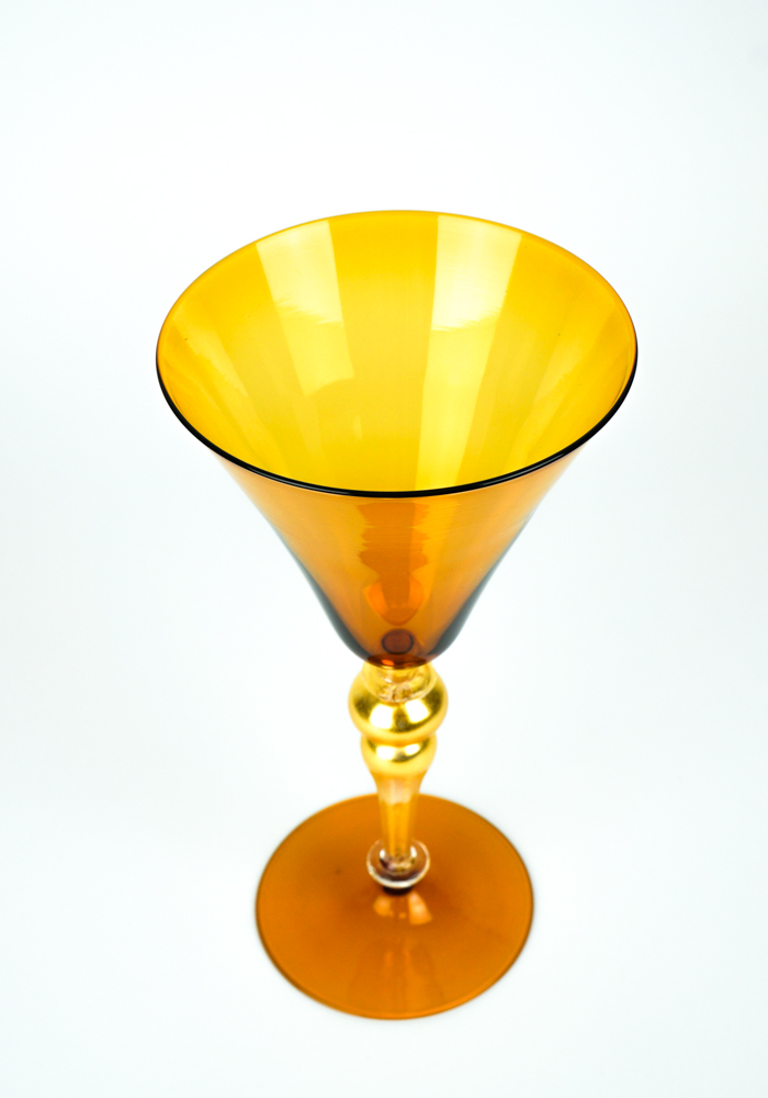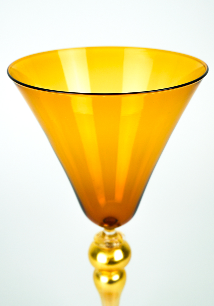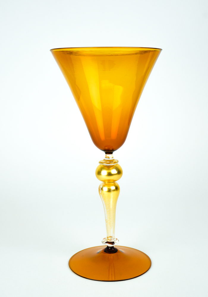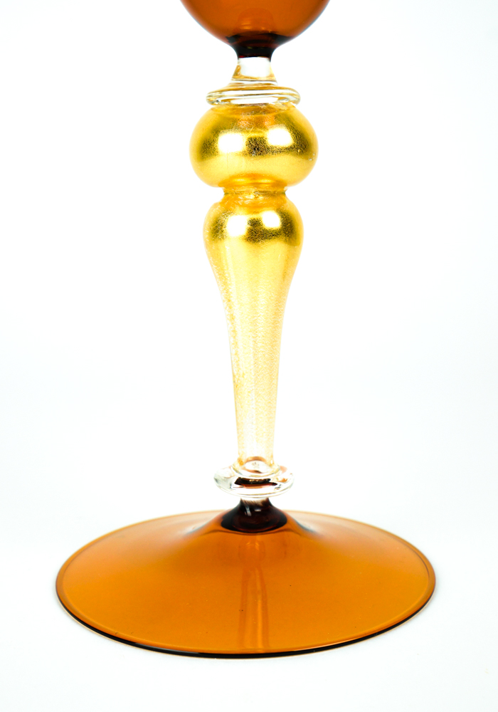 Arena è un calice di colore ambra con gambo in foglia oro 24 kt, eseguito interamente a mano con la tecnica della lavorazione del vetro soffiato di Murano.