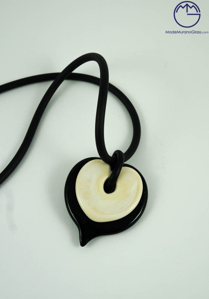 Le nostre collane in vetro di Murano sono interamente fatte a mano con la tecnica della lavorazione del vetro a “Lume” , come questo fantastico gioiello a forma di cuore bianco e nero in vetro di Murano, eseguito dal nostro Maestro vetraio Muranese.