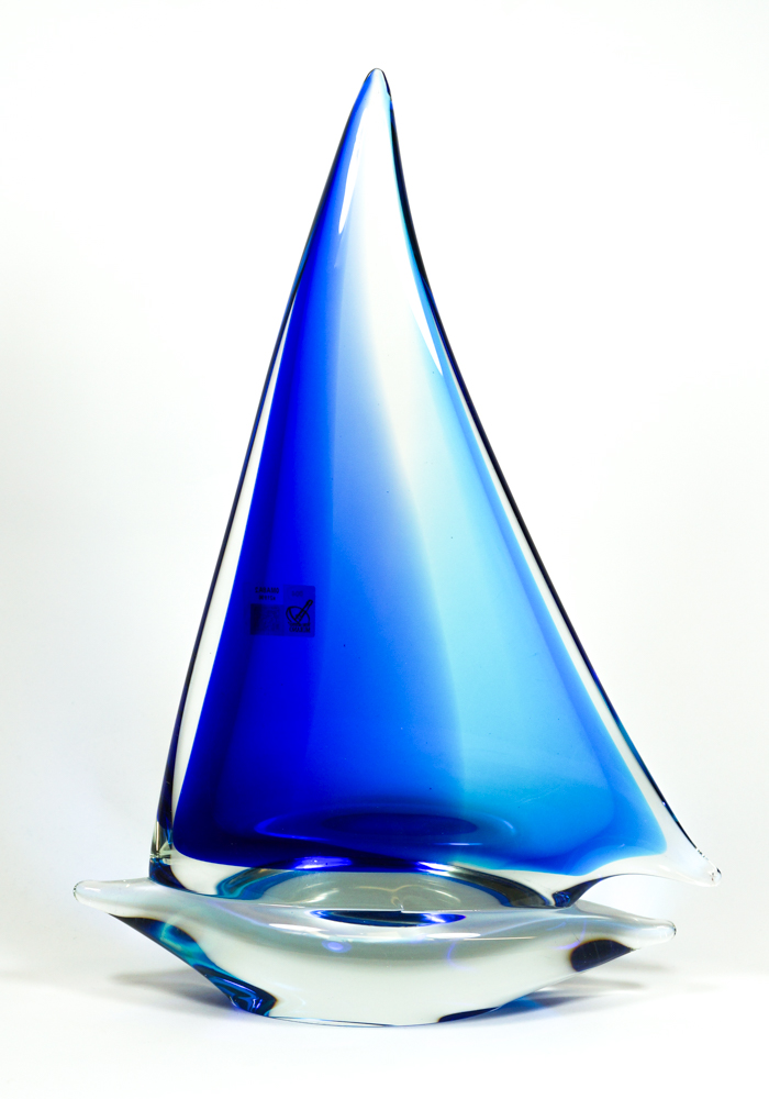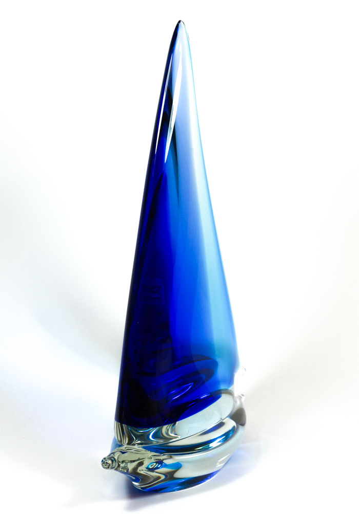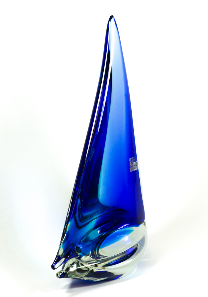 Scultura Barca a vela Sommersa in vetro di Murano eseguita interamente a mano con vela bicolore blu/acquamare e scafo in vetro cristallo trasparente.