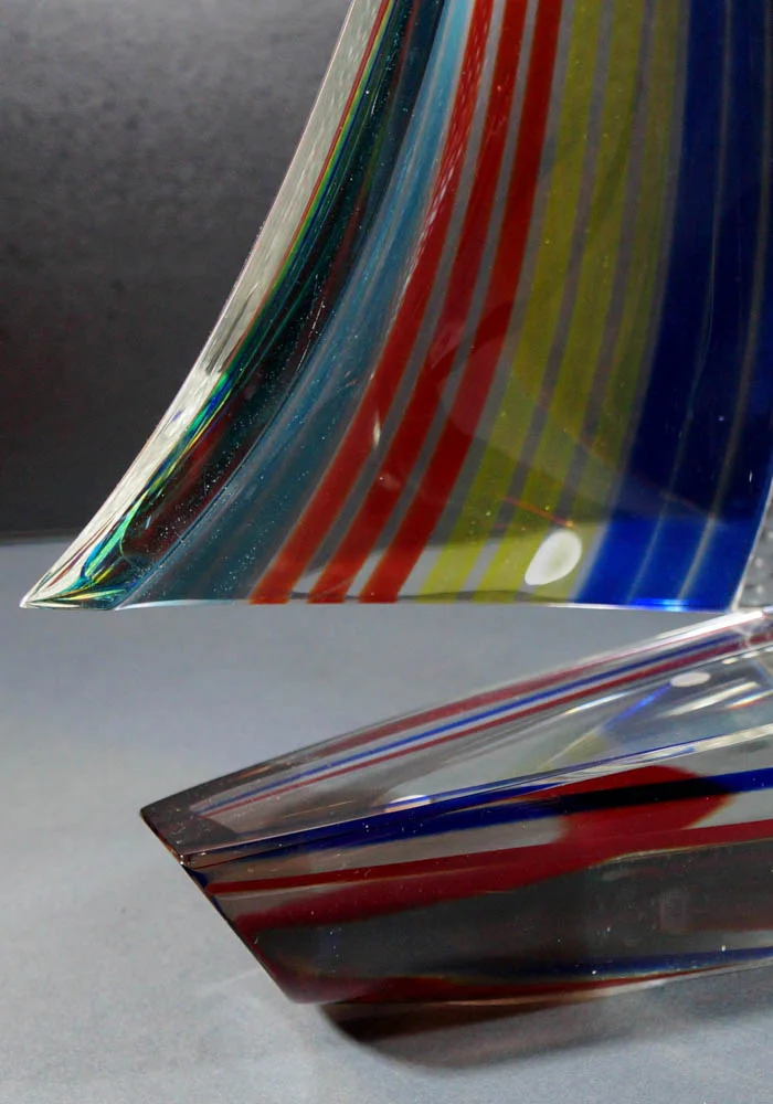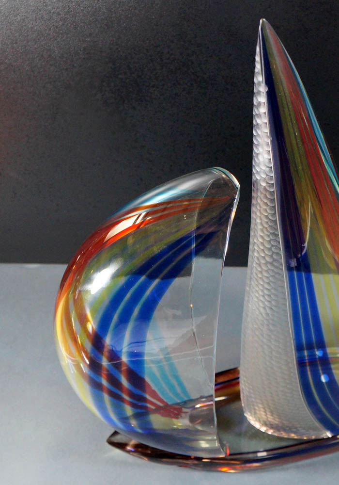 La lavorazione del vetro Murano rappresentata in una fantastica scultura di barca a vela con decorazioni in canna blue, gialla, rossa e acqua marina. Per eseguire quest’opera i Maestri vetrai Murano usano tre tecniche di lavorazione: la vela in vetro soffiato e incisa a freddo in moleria, la barca e la base in vetro molato. Per completare l’unicità l’artista incide a freddo la propria firma, rendendo questa magnifica scultura inimitabile.