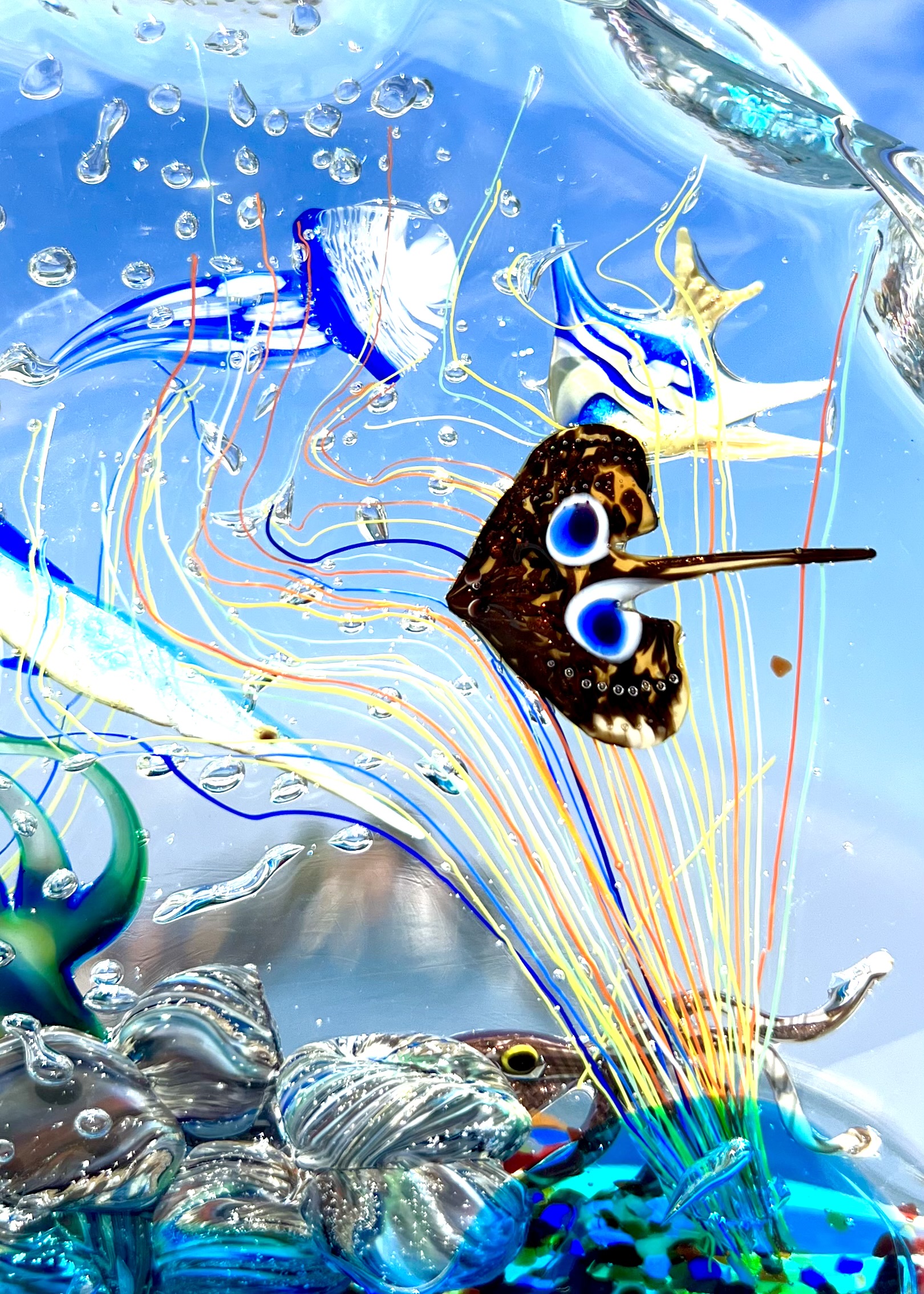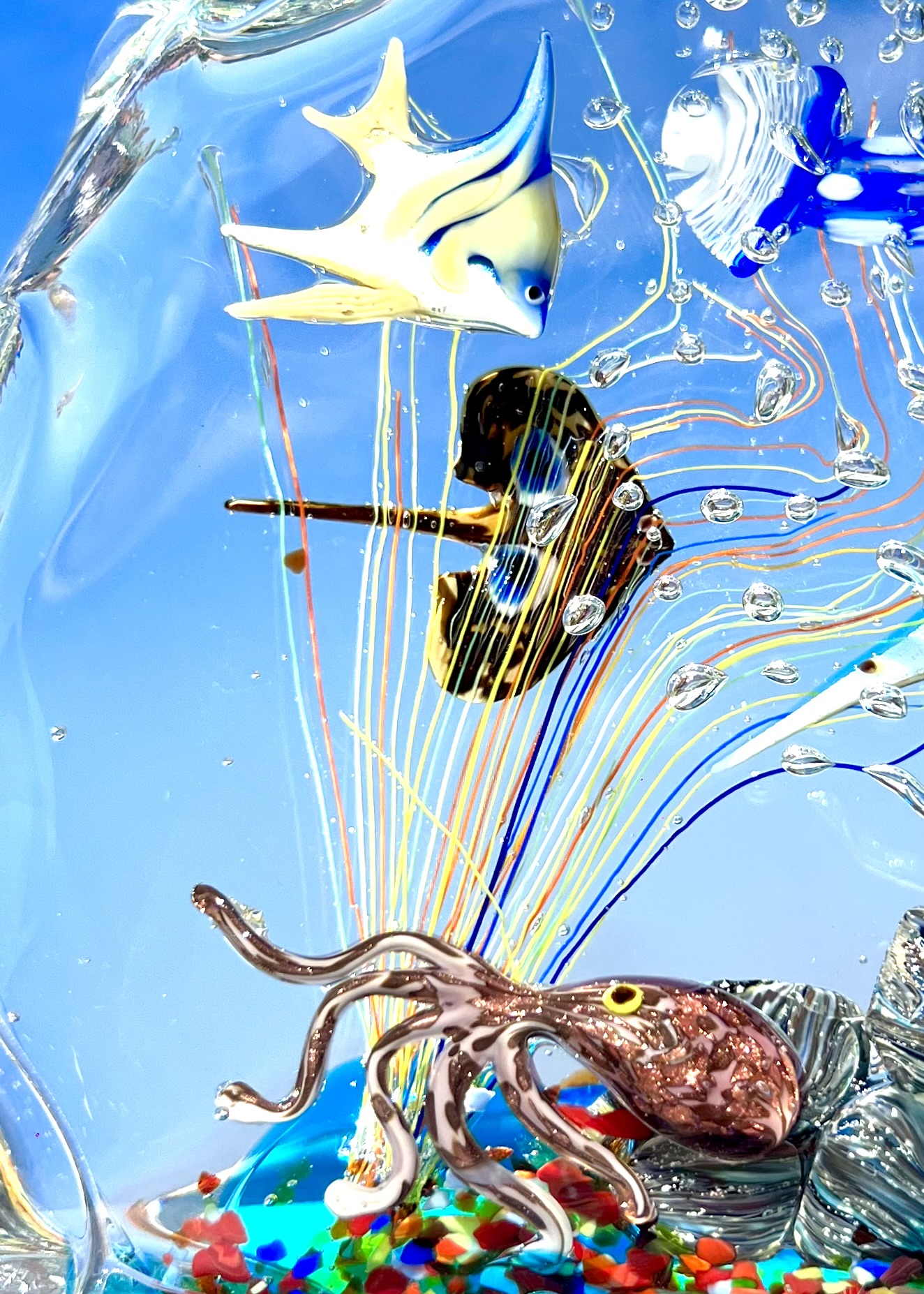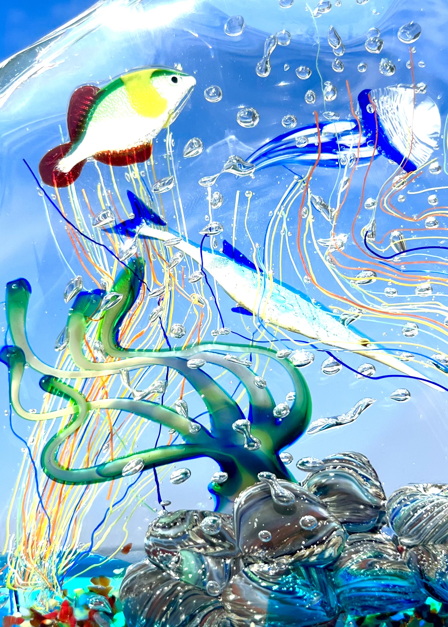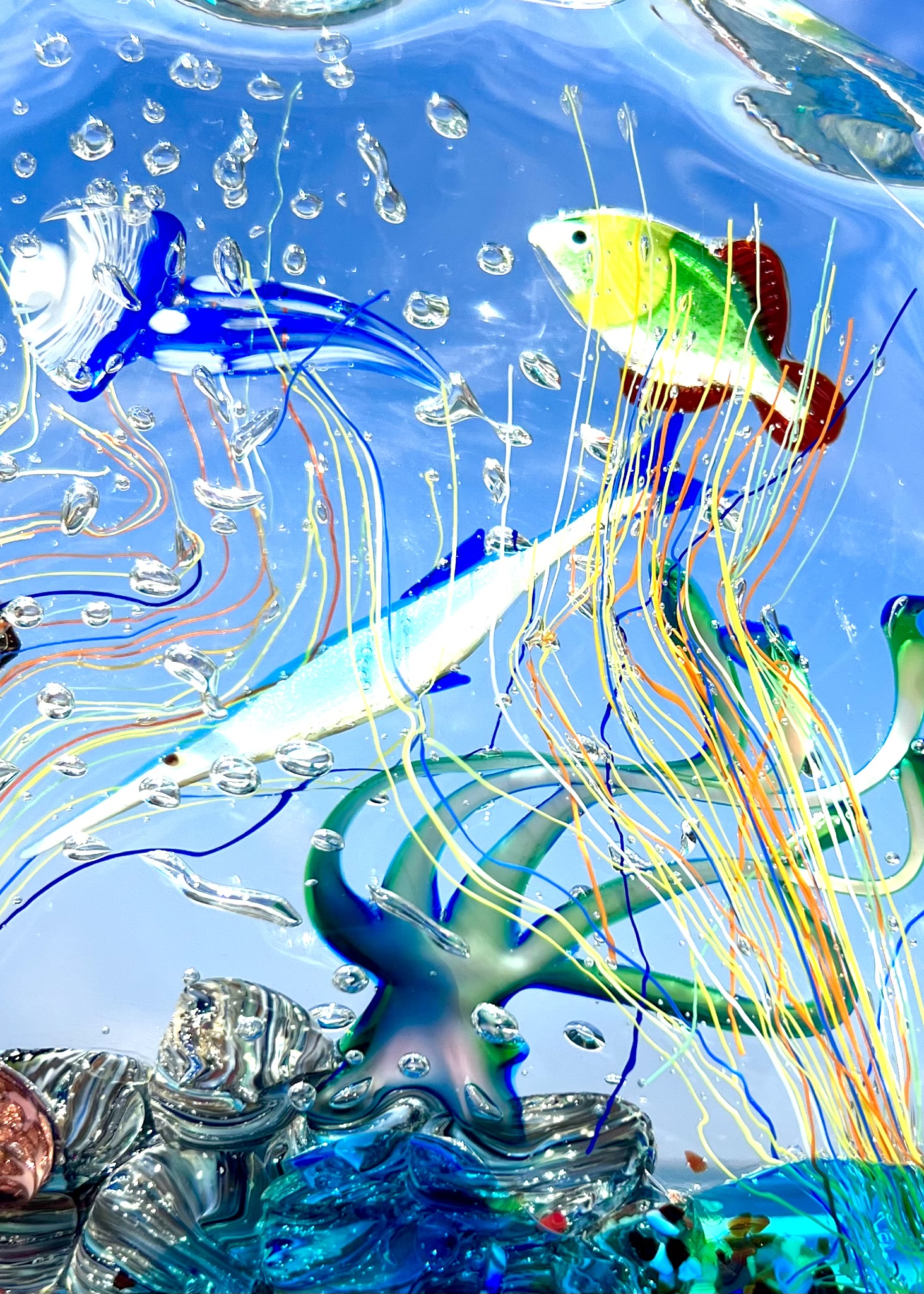 la lavorazione del vetro a lume e la lavorazione vetro sommerso, la prima per eseguire i pesci e la seconda per sommergerli in una cascata di vetro fuso, rendendo il tutto unico e inimitabile.