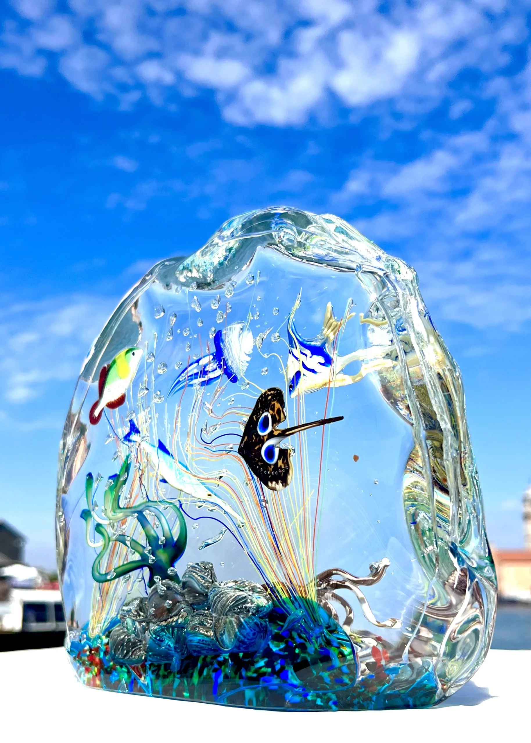 L’opera contiene 1 polpo, 1 razza, 1 medusa, 1 pesce ago, 2 pesci tropicali, 1 anemone di mare, 1 scogliera e decorazioni marine varie.
