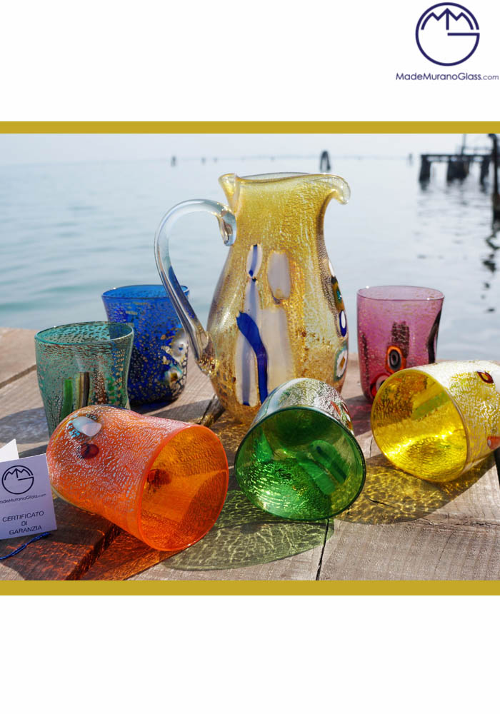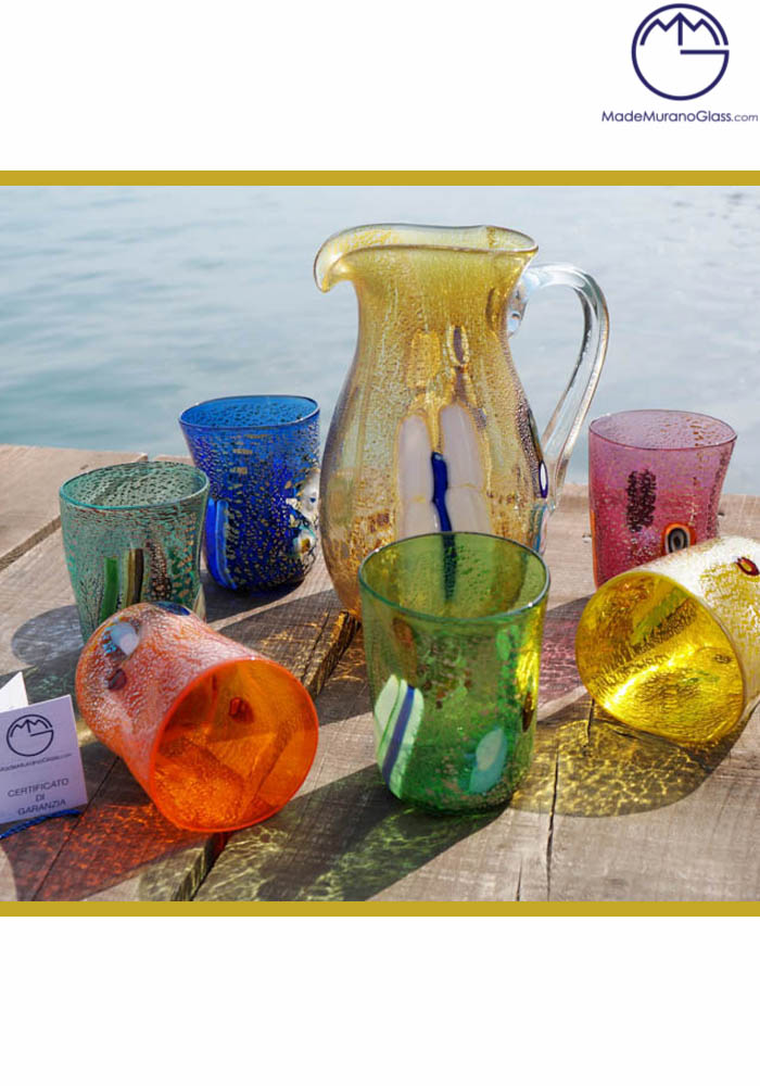 Il set comprende sei Bicchieri e una Brocca in Vetro Soffiato di Murano con decorazione in Murrina millefiori e bacchette di vetro.