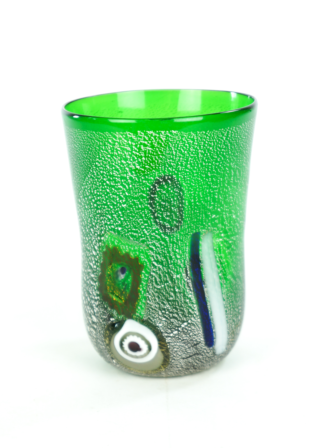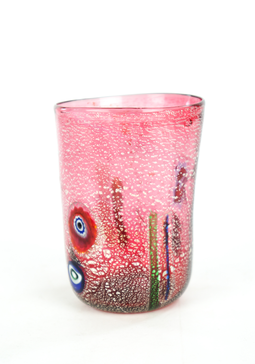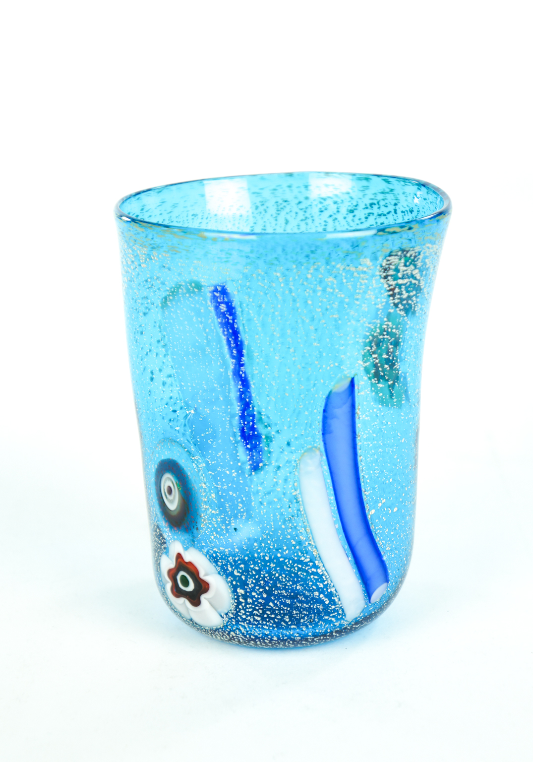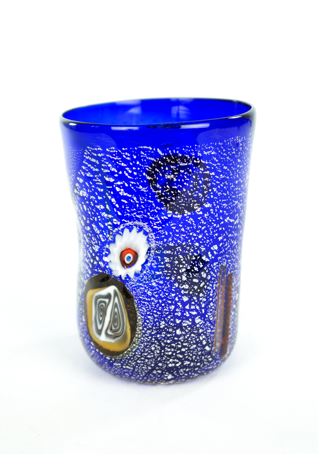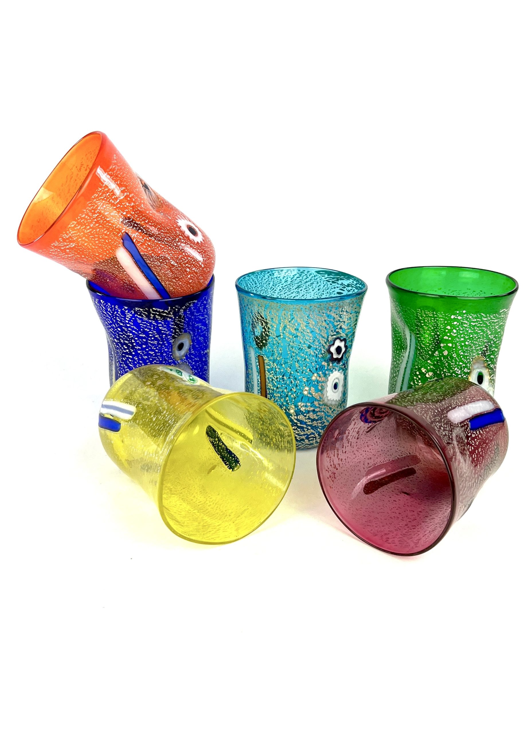 Il set comprende 6 bicchieri da tavola in vetro di Murano Multicolore con decoro in Murrina Millefiori e vera foglia Argento.
