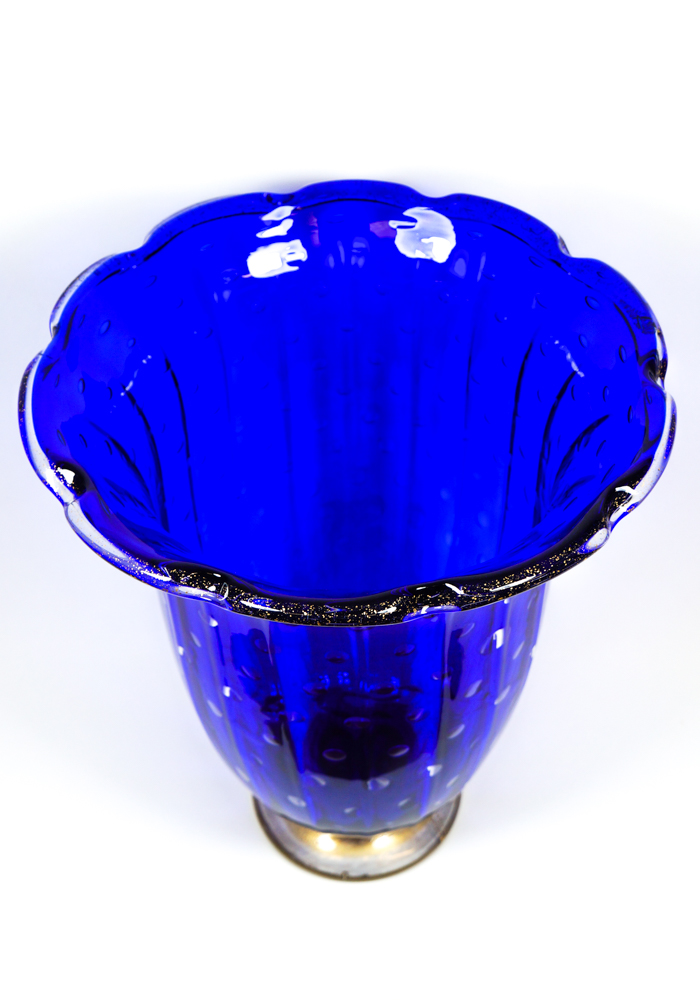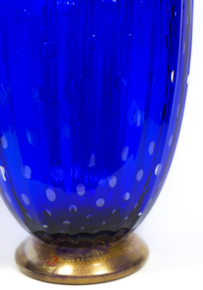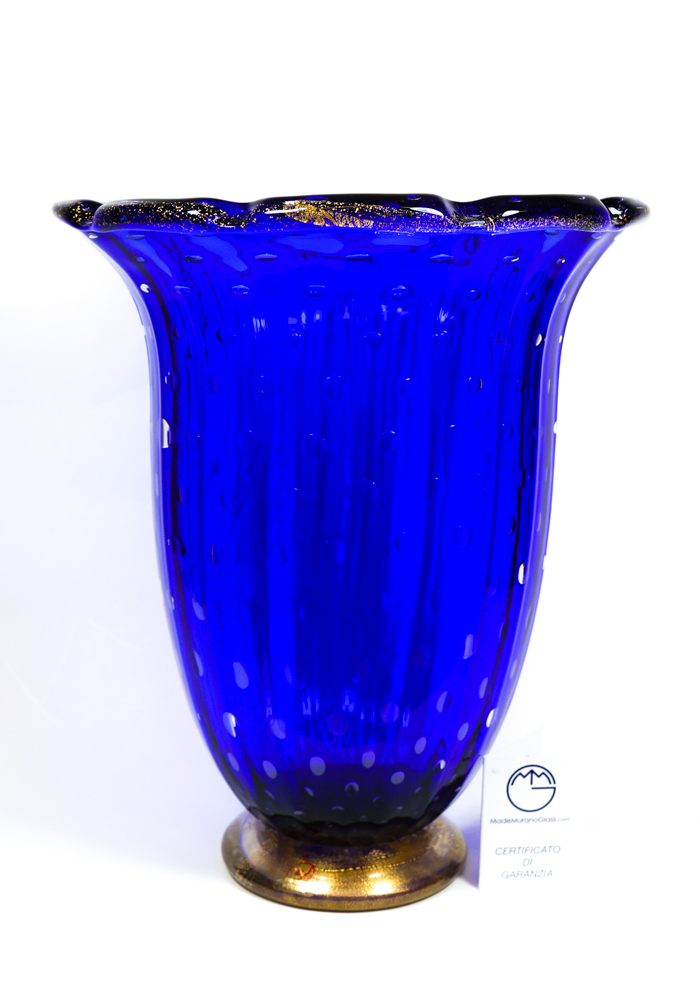 Vaso a balloton in vetro soffiato di Murano colore blu con decorazioni in foglia oro 24kt. Opera eseguita dai Maestri vetrai di Murano Imperio Rossi e Costantini Mario. Vaso firmato con incisione a freddo dall’artista (I. Rossi). Etichetta Vetro Artistico® Murano.