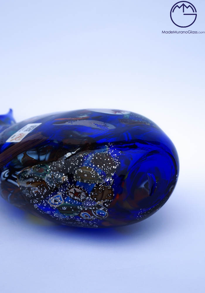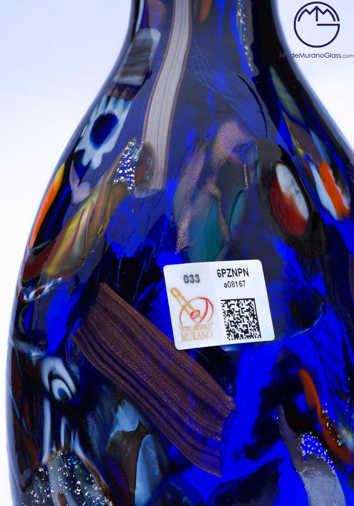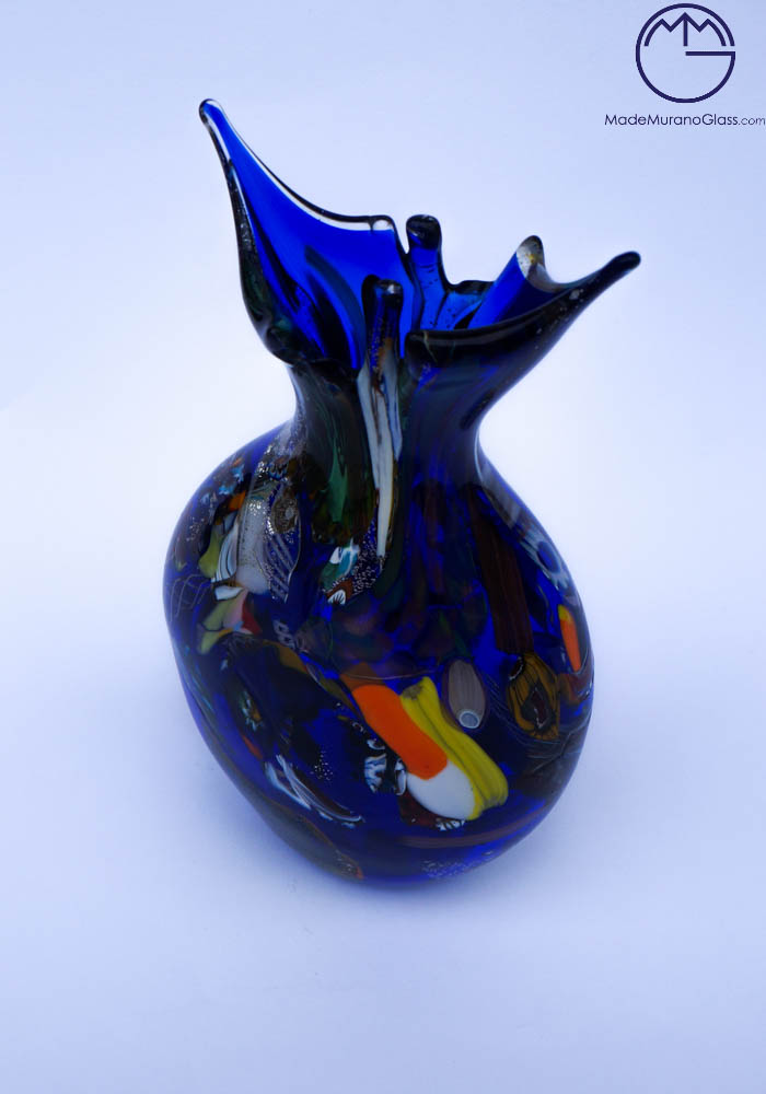Brasilia è un vaso esclusivo in vetro soffiato di Murano colore blu con decorazioni assortite di filigrana, murrine, avventurina, “mace” e argento. Il Maestro vetraio di Murano “Imperio Rossi” mescola questi colori di volta in volta in maniera sempre differente, rendendo così le sue opere uniche e inimitabili. Opera firmata con incisione a freddo dall’artista (I. Rossi). Etichetta Vetro Artistico® Murano. Vedi foto dettagli.