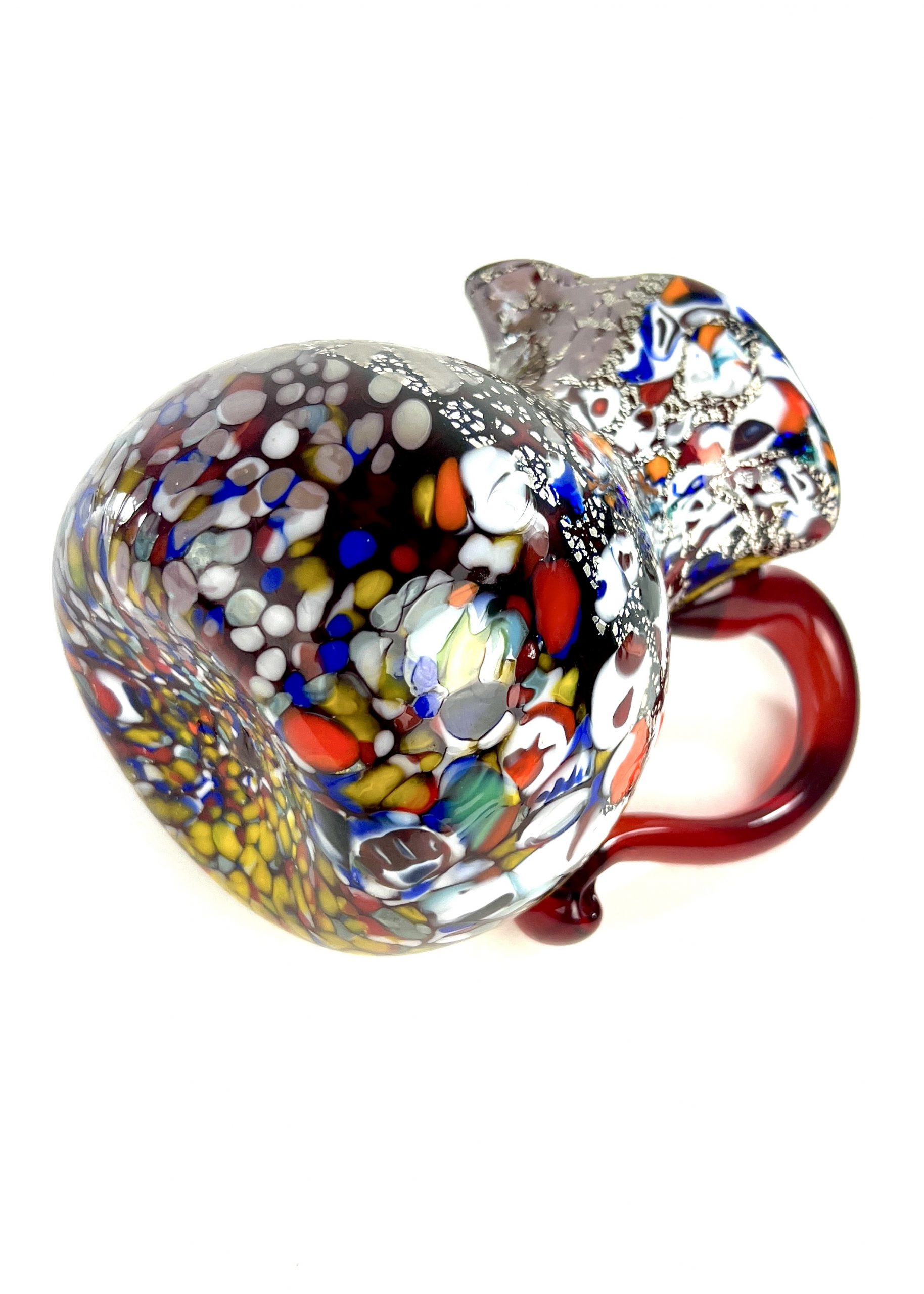Caraffa in vetro soffiato di Murano colore rosso con decorazioni assortite di filigrana, Murrine, avventurina, “Mace” e argento.