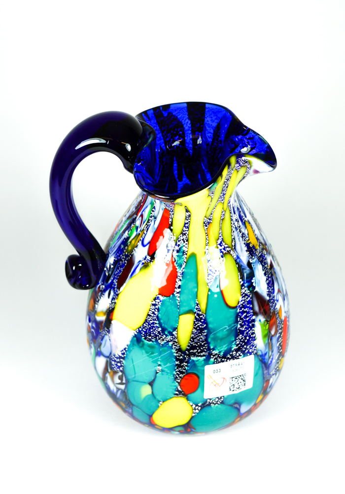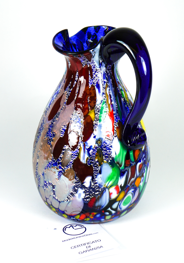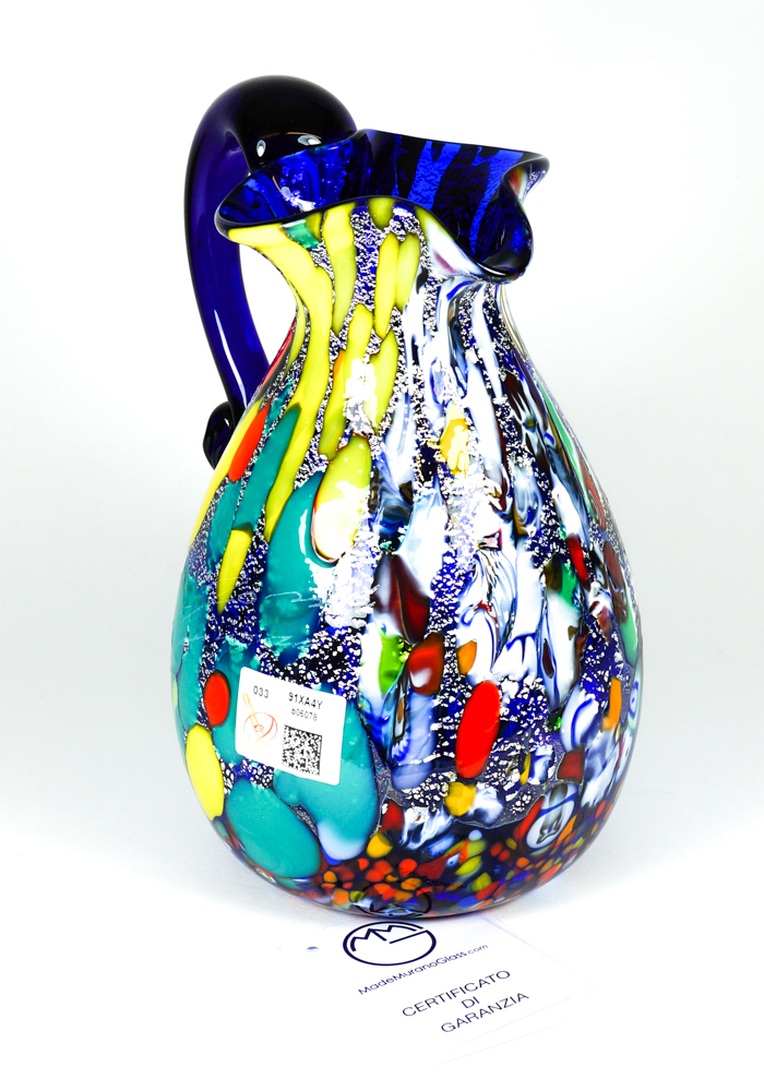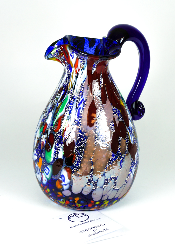 Brocca in vetro soffiato di Murano colore blu con decorazioni assortite di filigrana, Murrine, avventurina, “Mace” e argento. Il Maestro vetraio di Murano “Imperio Rossi” mescola questi colori di volta in volta in maniera sempre differente, rendendo così le sue opere uniche e inimitabili. Opera firmata con incisione a freddo dall’artista (I. Rossi). Etichetta Vetro Artistico® Murano.