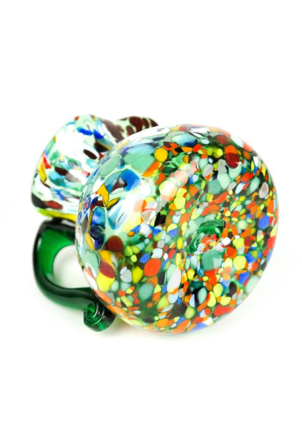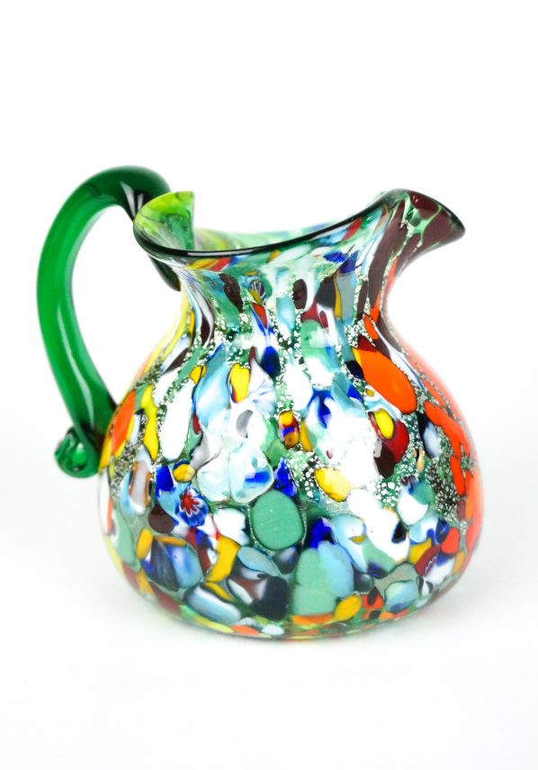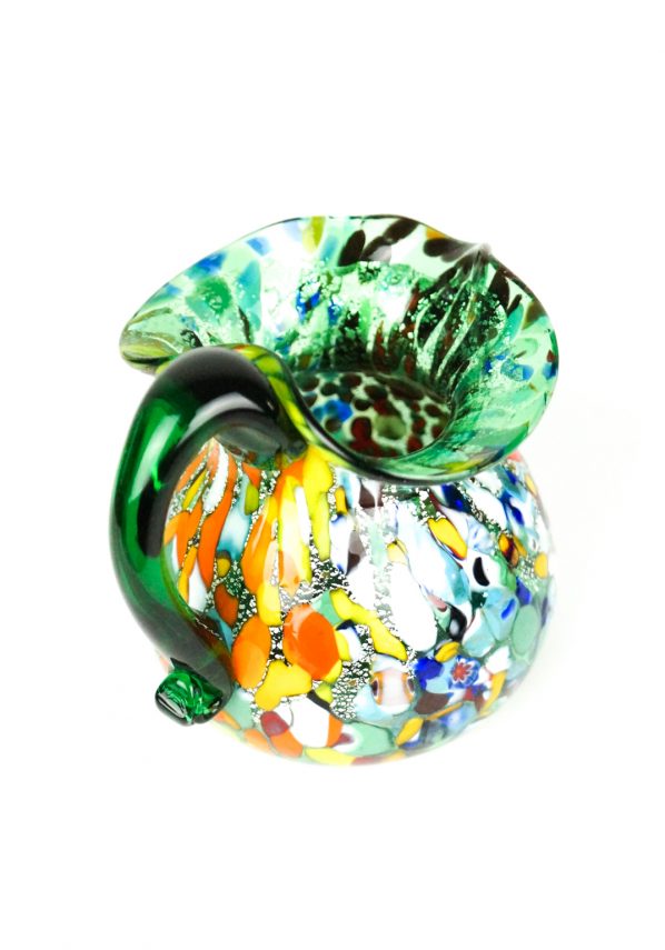 Brocca in vetro soffiato di Murano colore verde con decorazioni assortite di filigrana, Murrine, avventurina, “Mace” e argento.