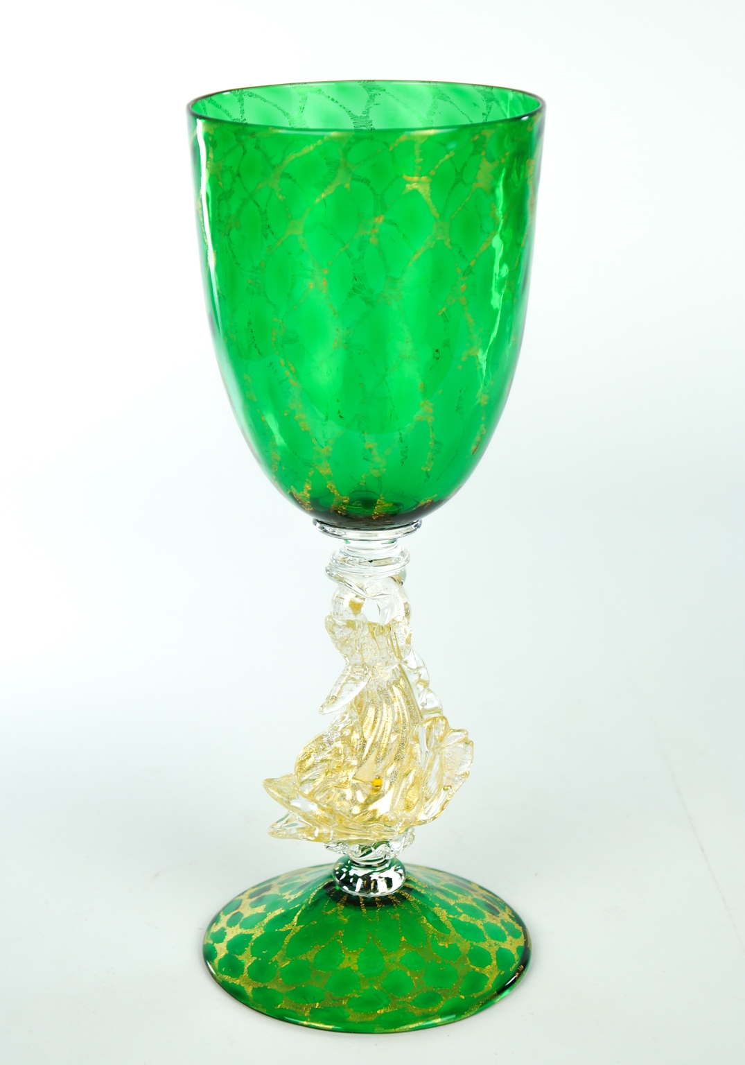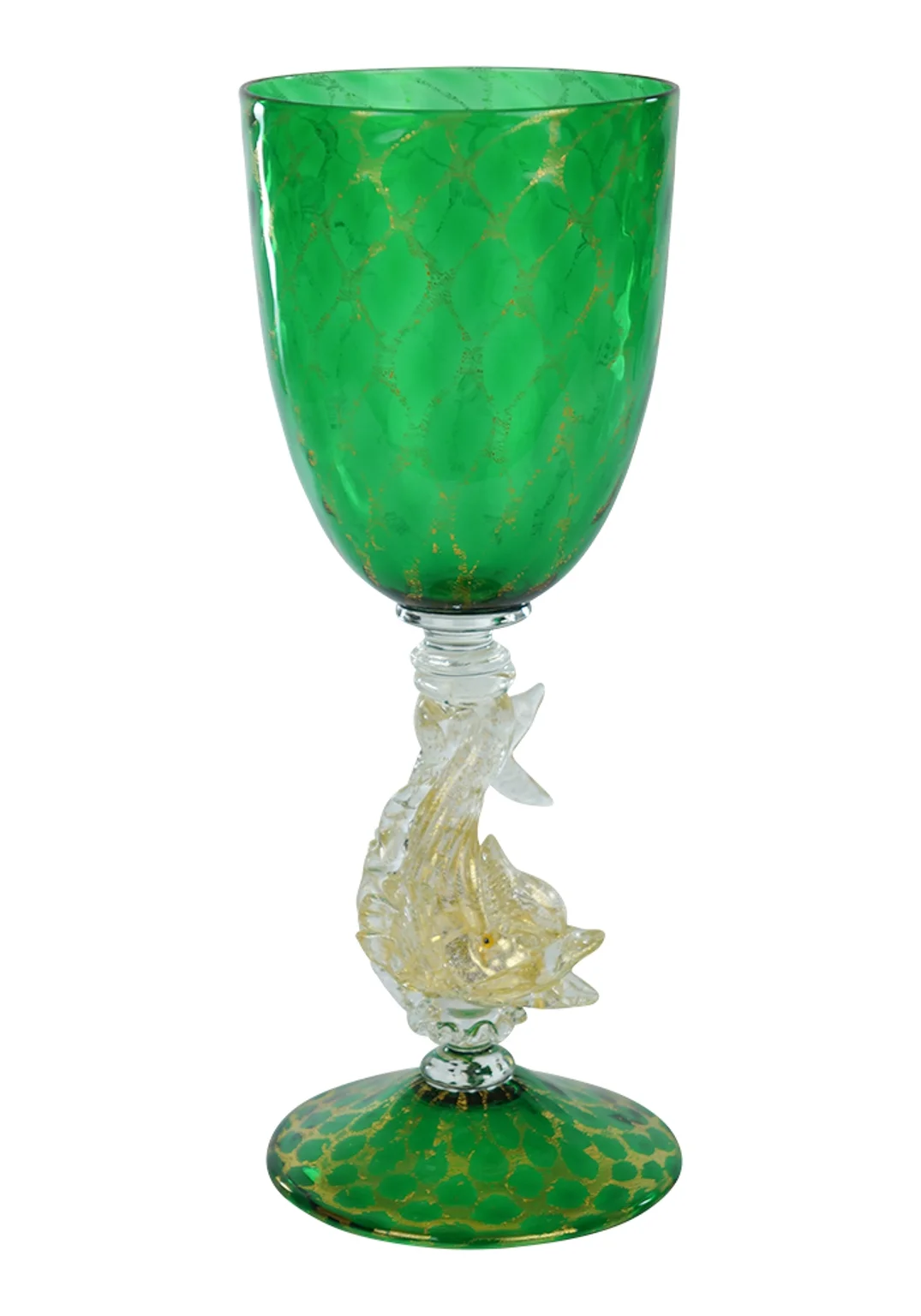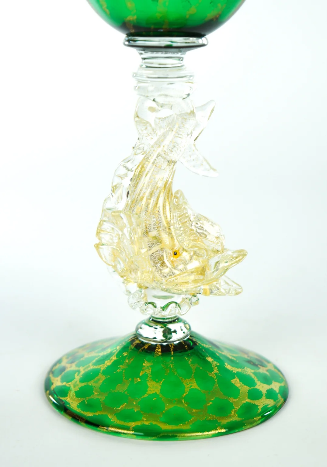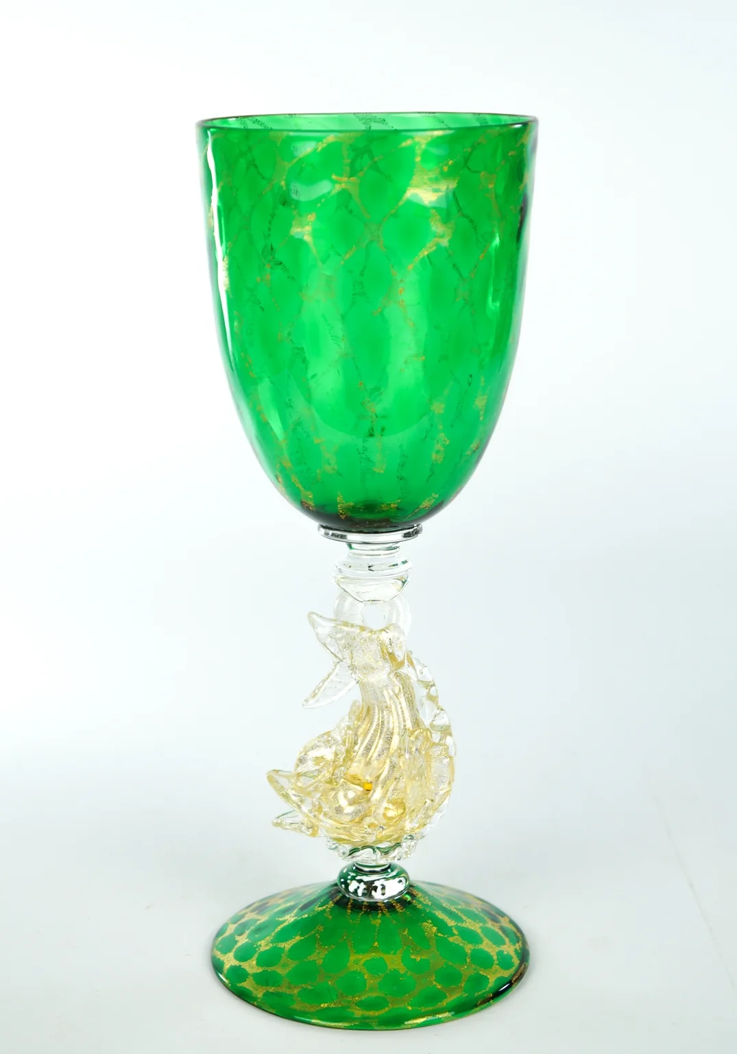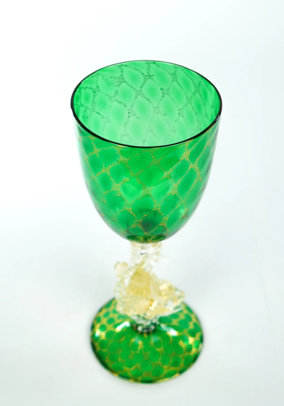 Calice Per Vino e Champagne in vetro soffiato di Murano colore verde con decorazioni nel gambo in vera foglia oro 24kt.