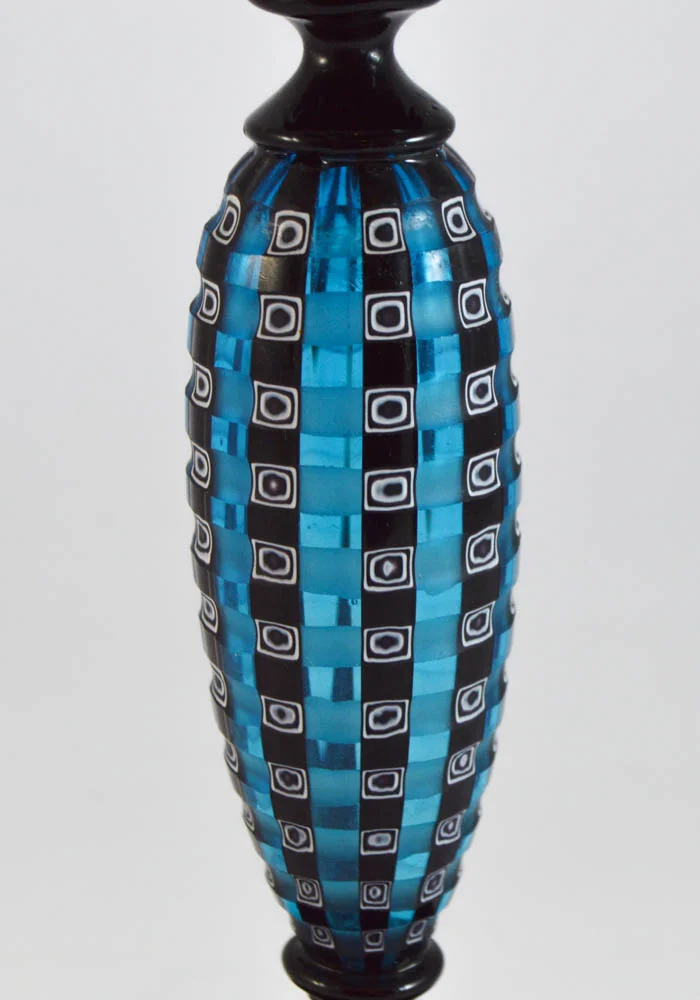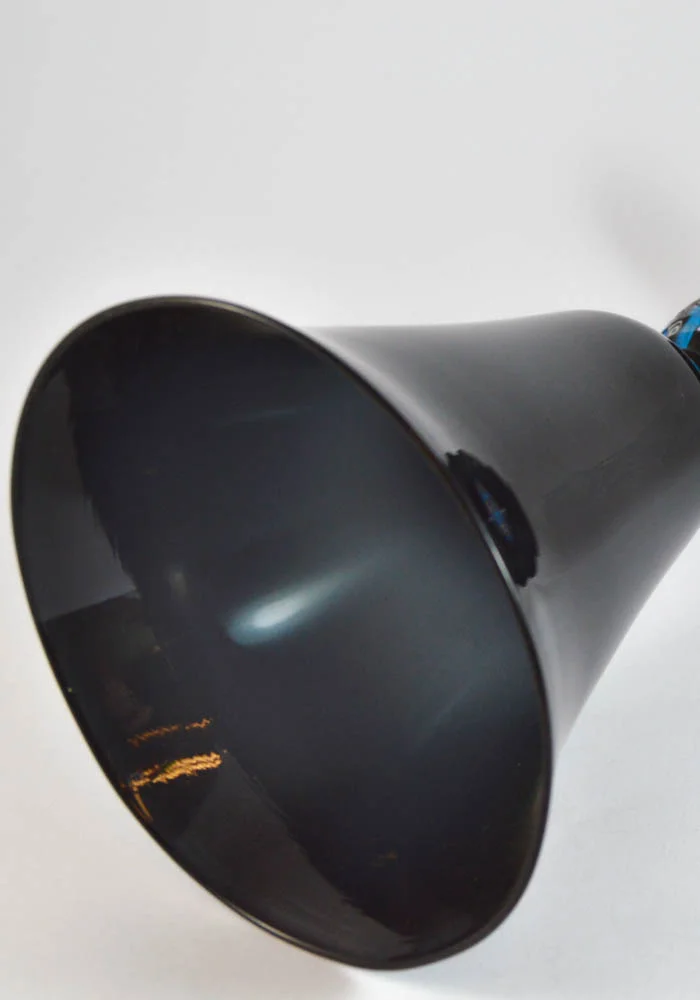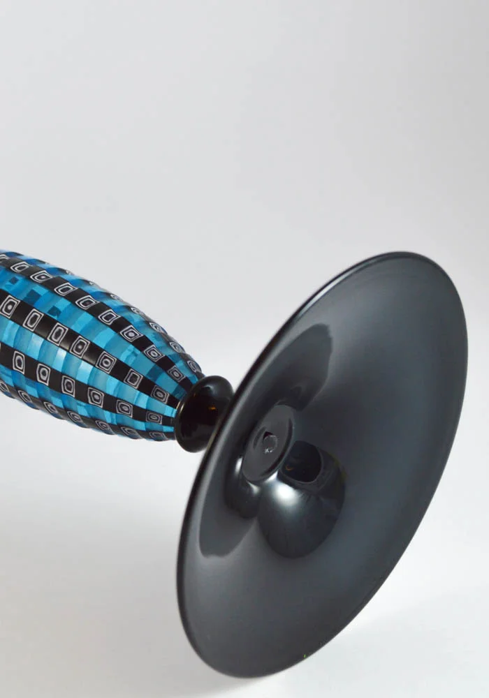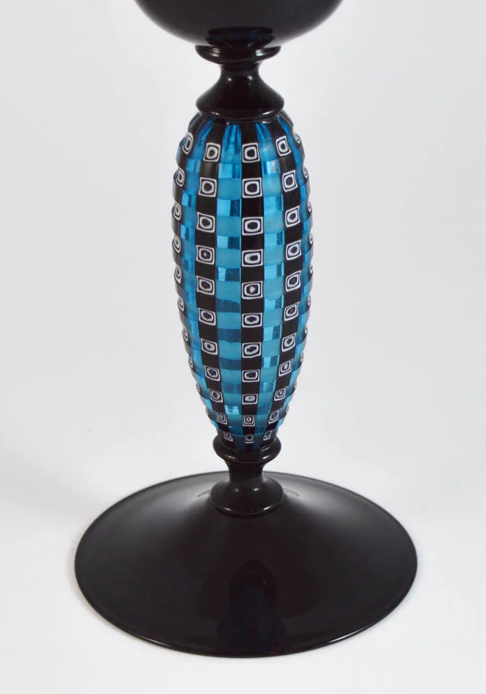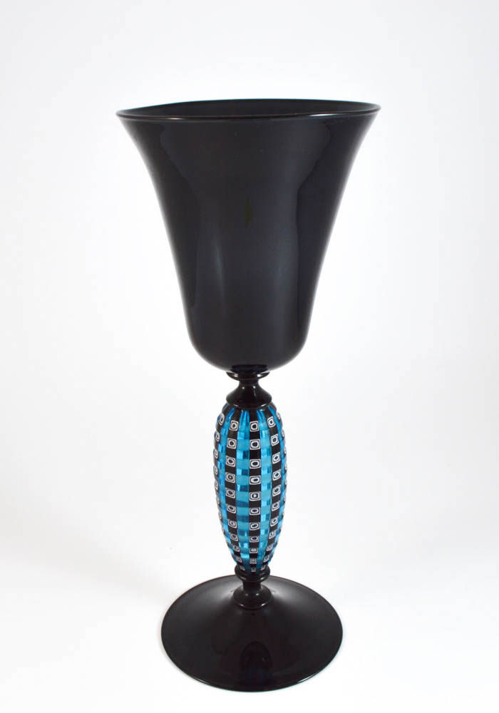 Elegantissimo calice in vetro Murano color nero e battuto (inciso) a freddo nel gambo blue con murrine. La lavorazione del vetro battuto viene eseguita da artisti dell’incisione a freddo, procedimento molto lungo e meticoloso. Pezzo di alta qualità unico nel suo genere. L’opera viene firmata dal Maestro.