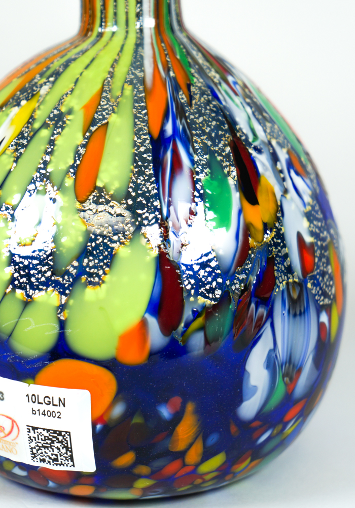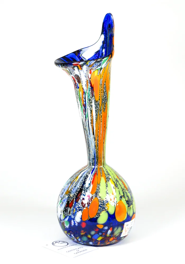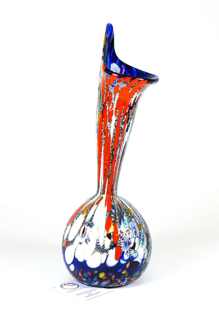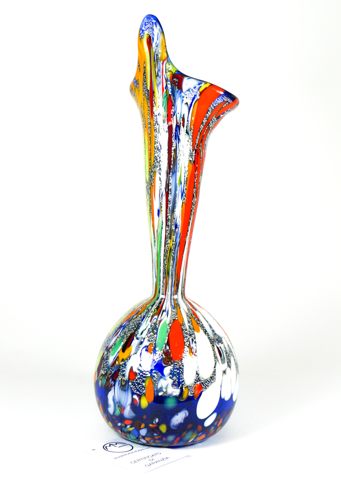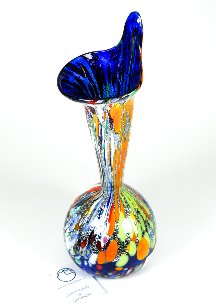 Vaso in vetro soffiato di Murano con decorazioni assortite di murrina millefiori, mace e vera foglia argento.