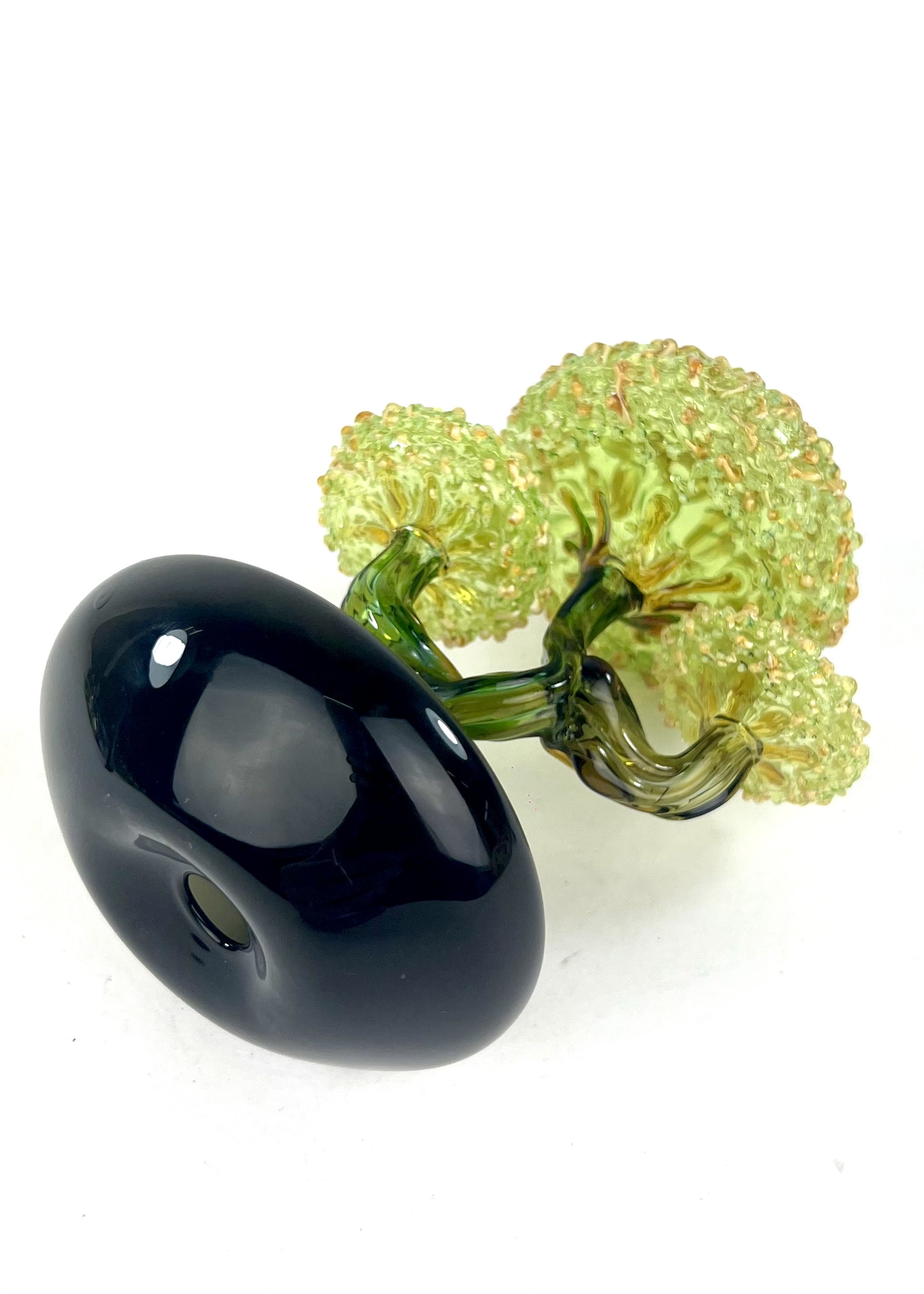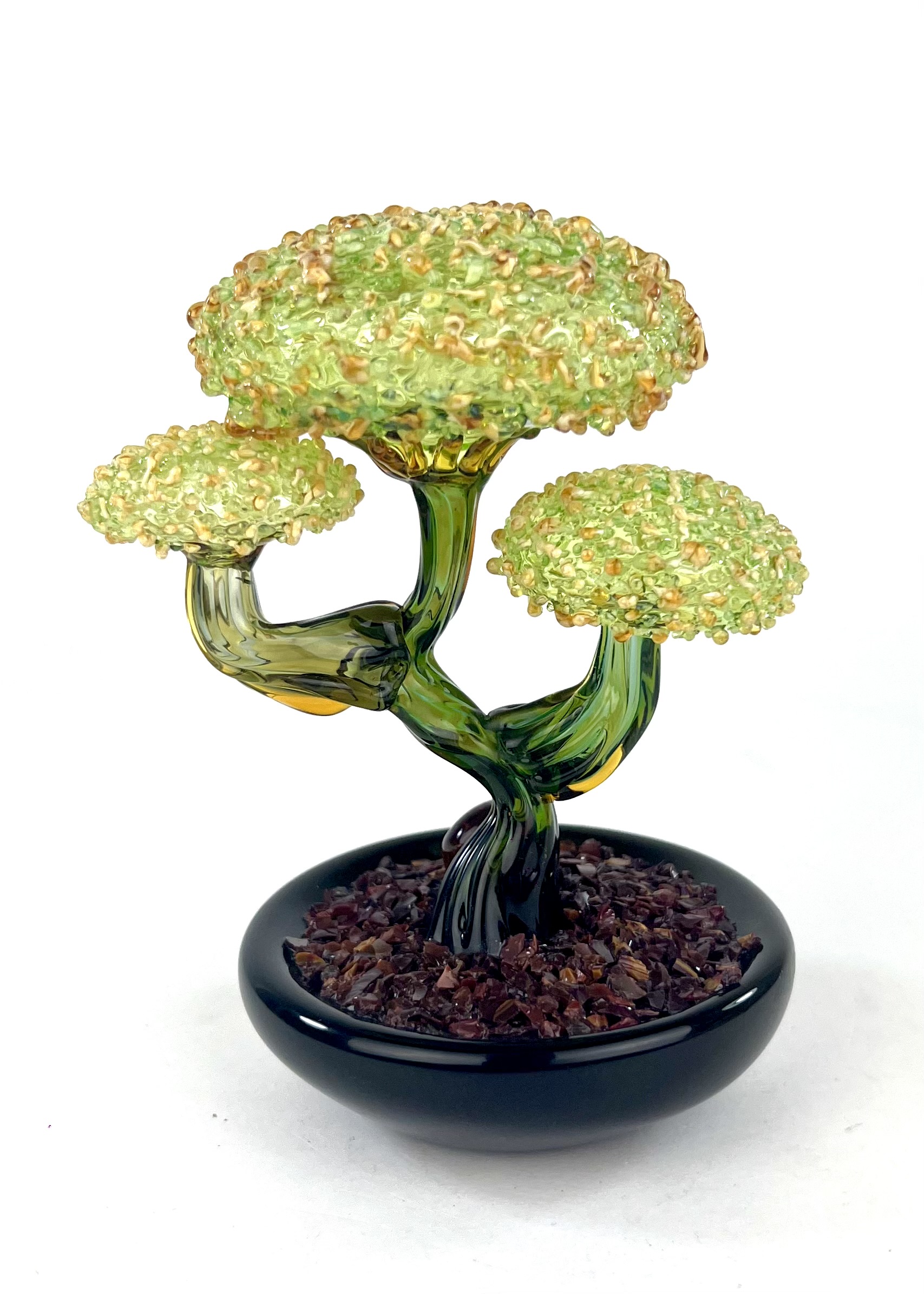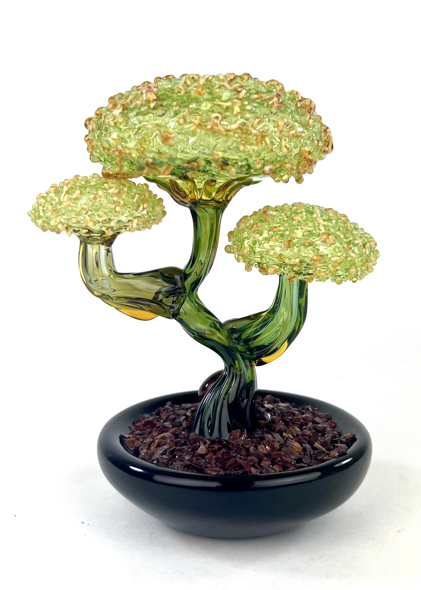 Il bonsai ha un vaso in vetro nero con all’interno mace (sono frammenti di vetro di Murano).