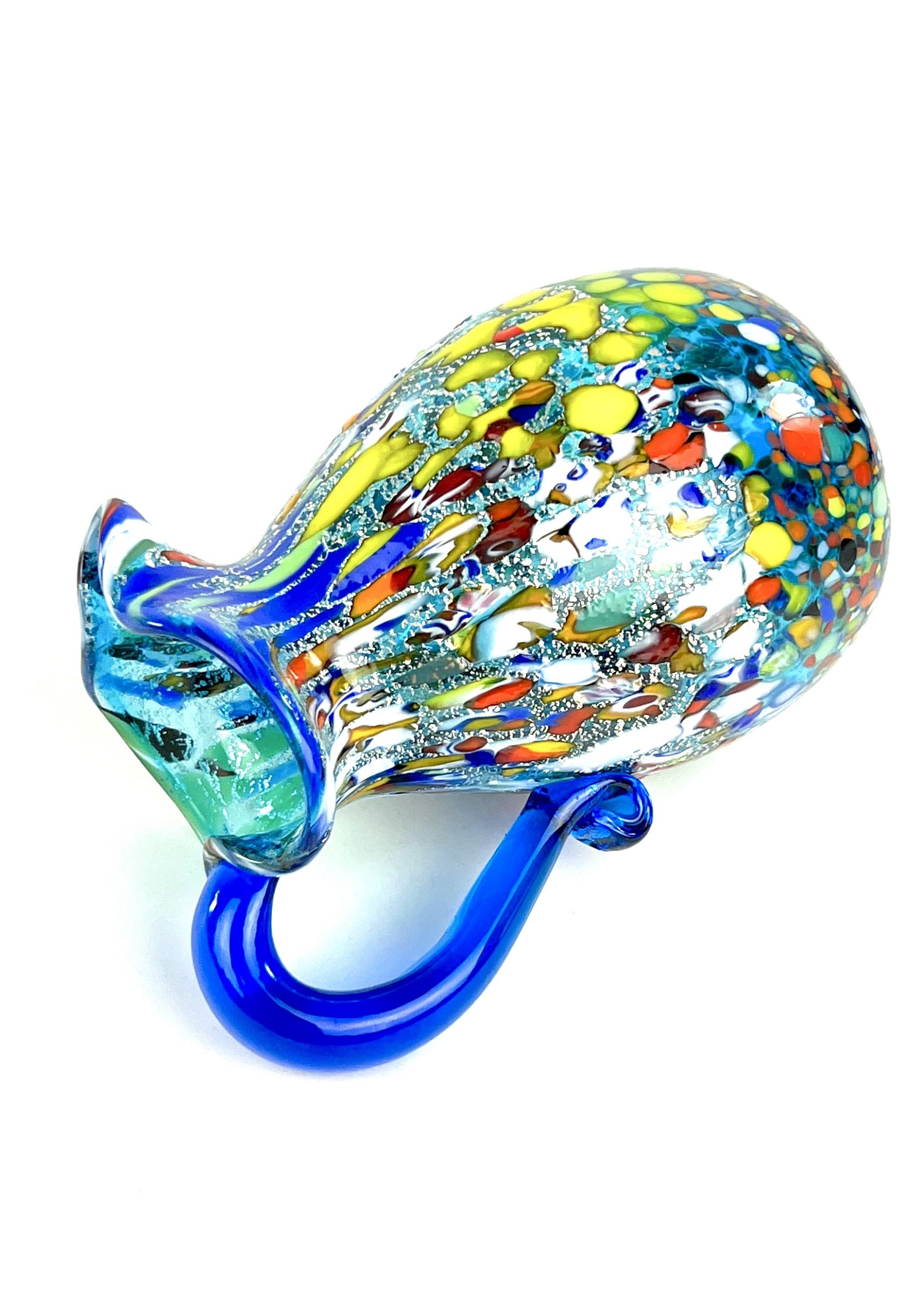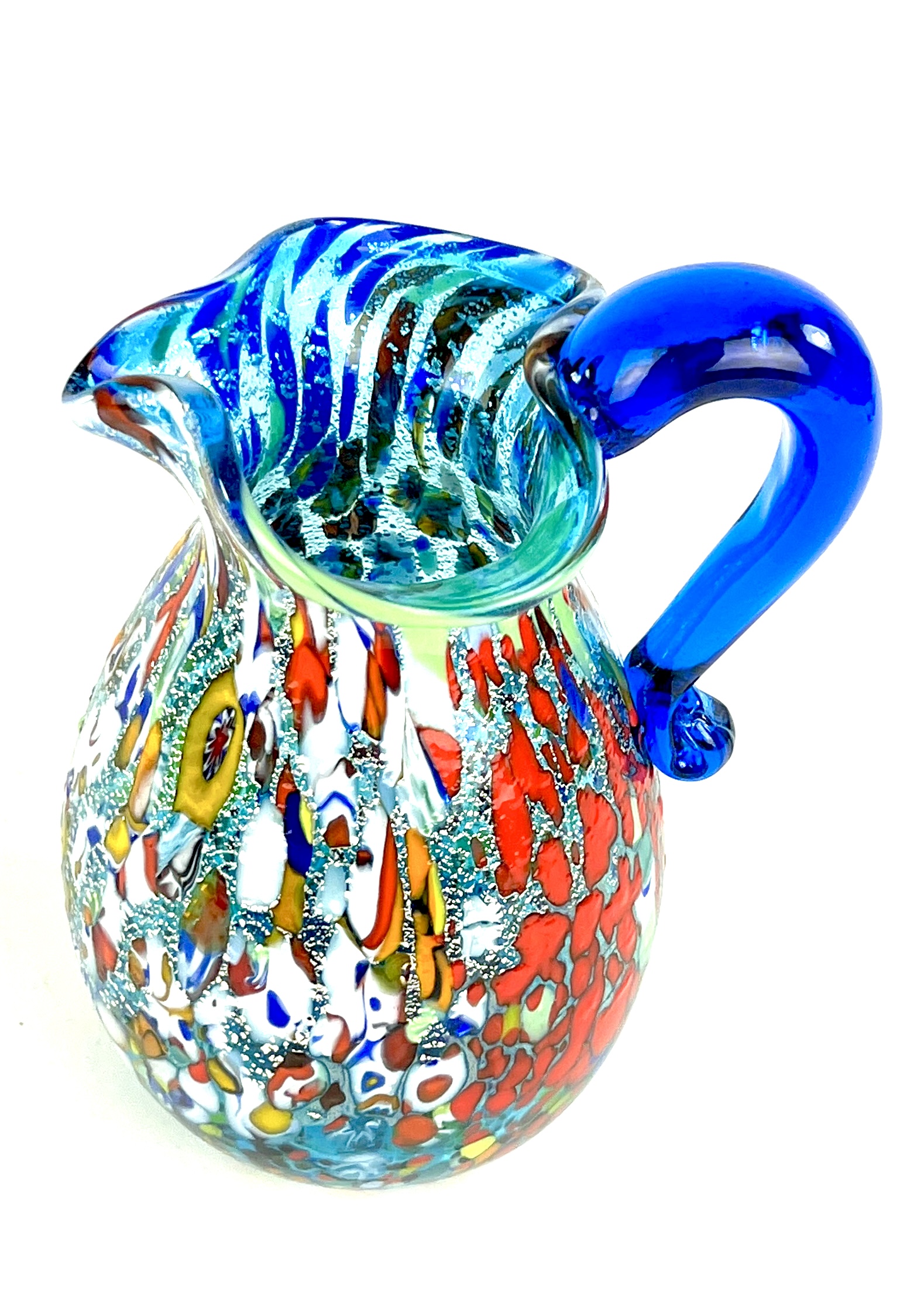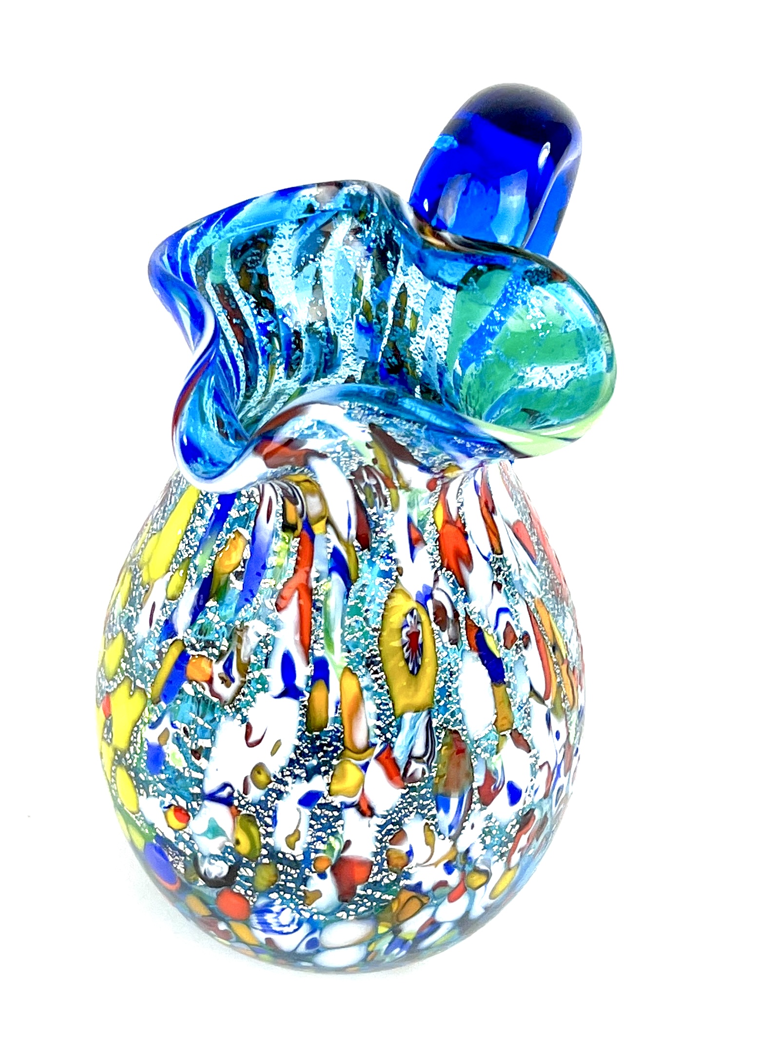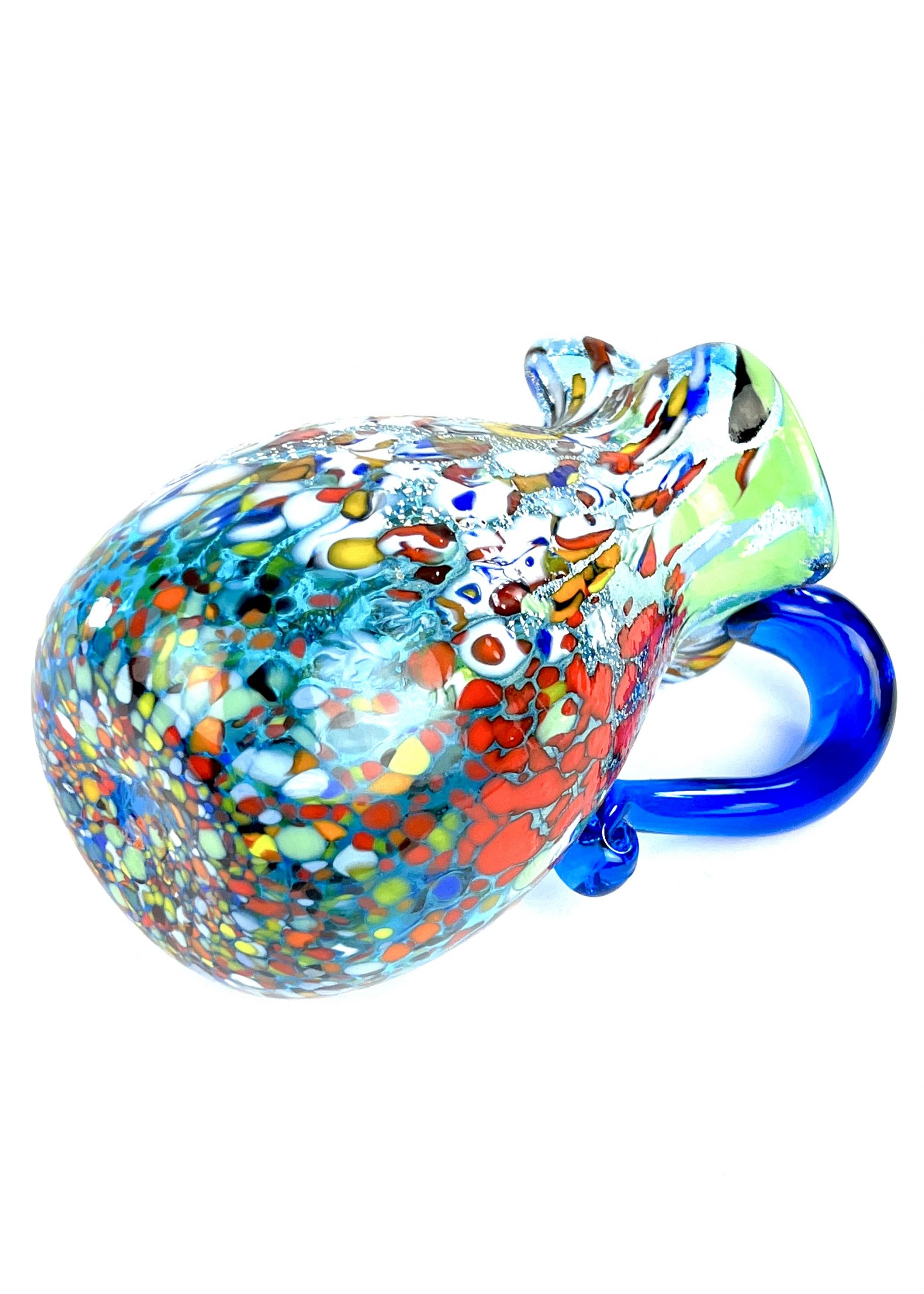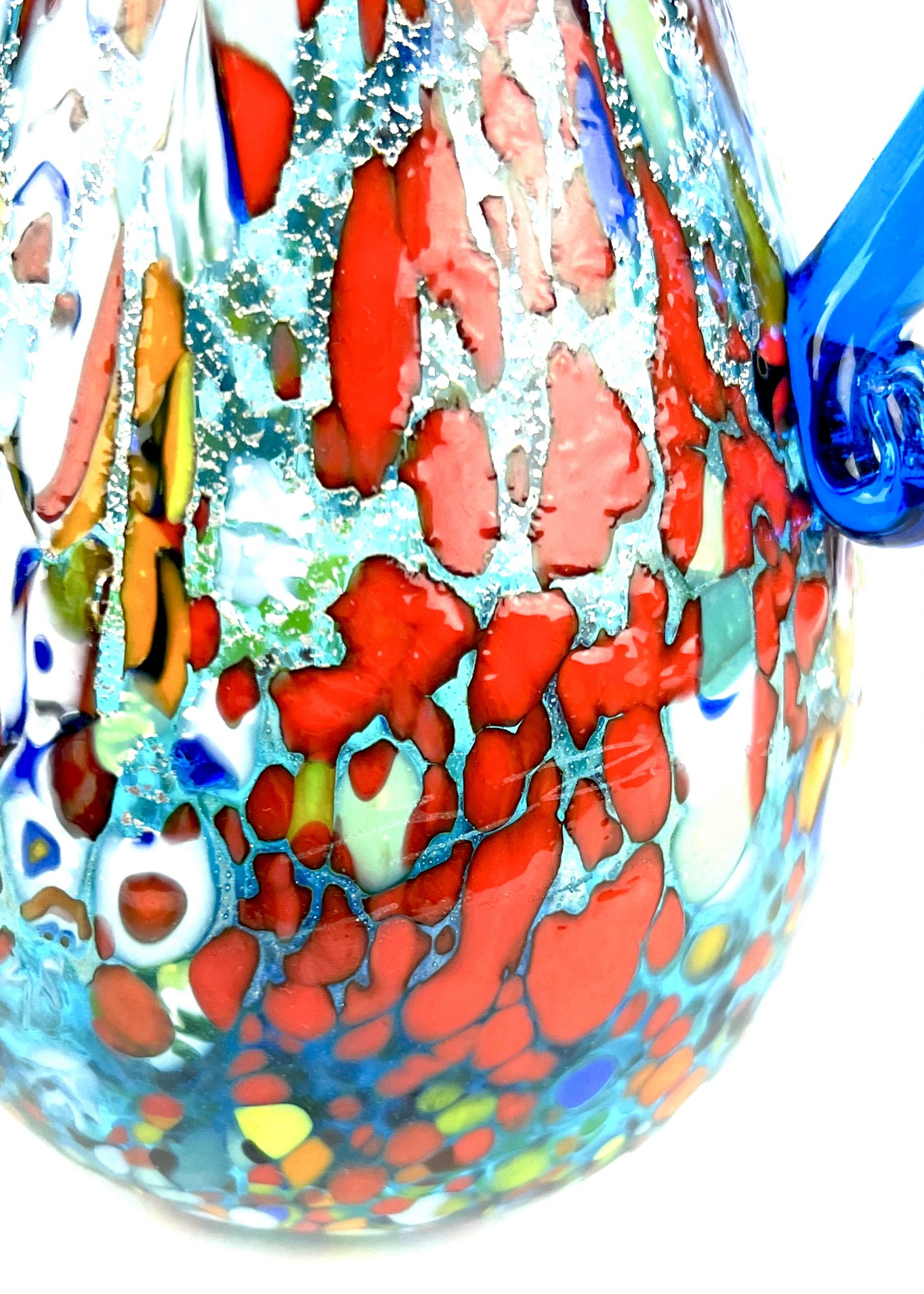 Caraffa in vetro soffiato di Murano colore acquamarina con decorazioni assortite di filigrana, murrine, avventurina, “mace” e argento.