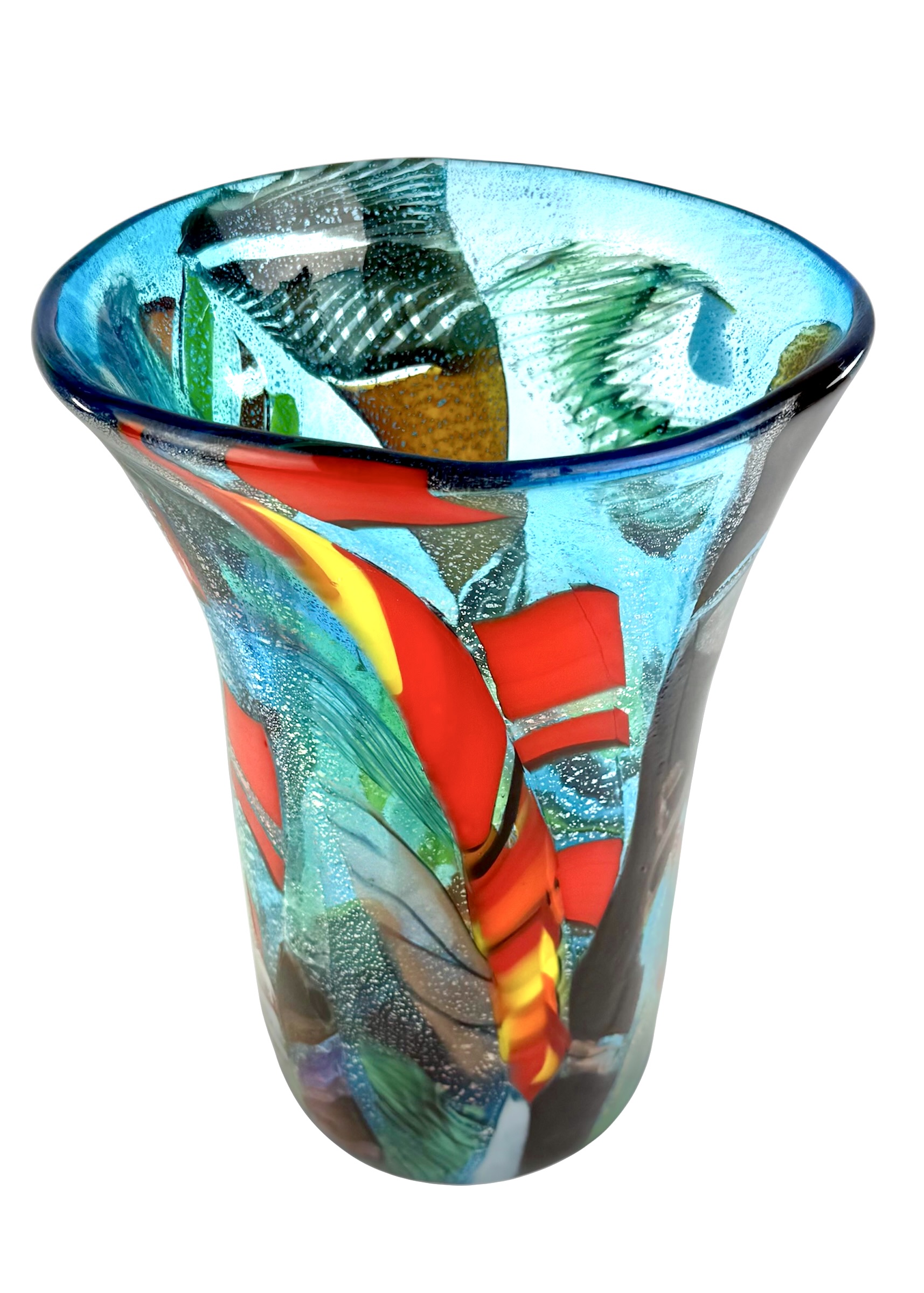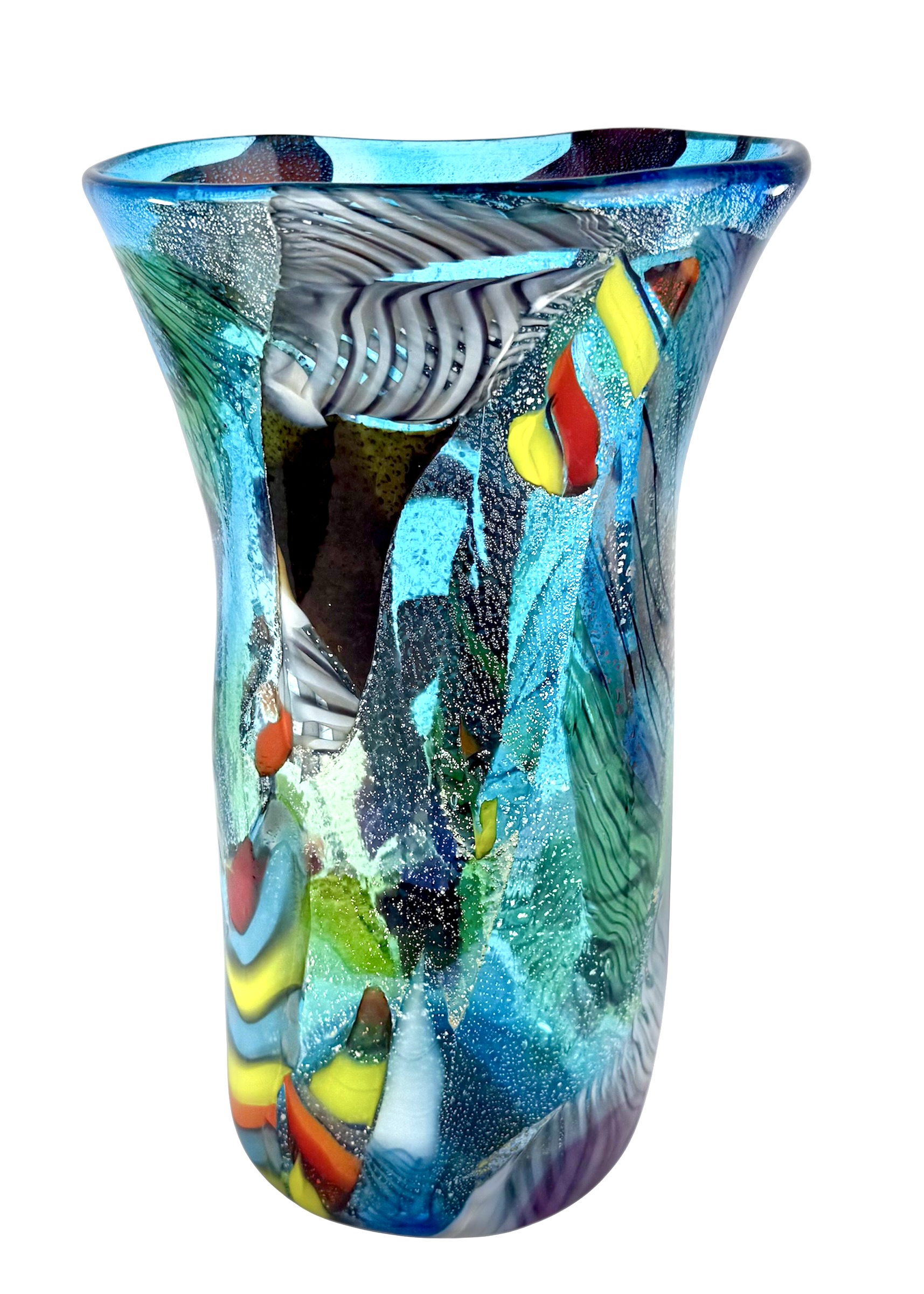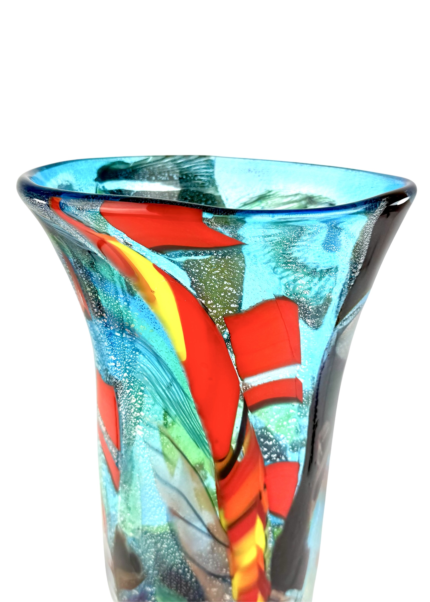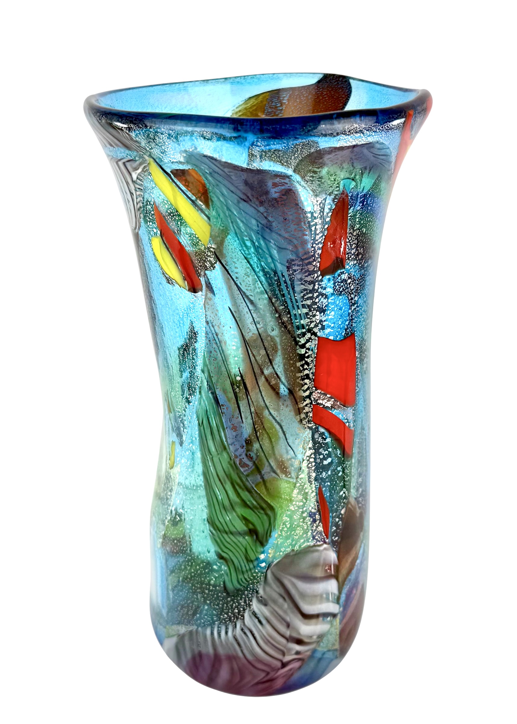 Vaso in vetro soffiato di Murano con decorazioni multicolori chiamate “Carnevale” e vera foglia d’argento.