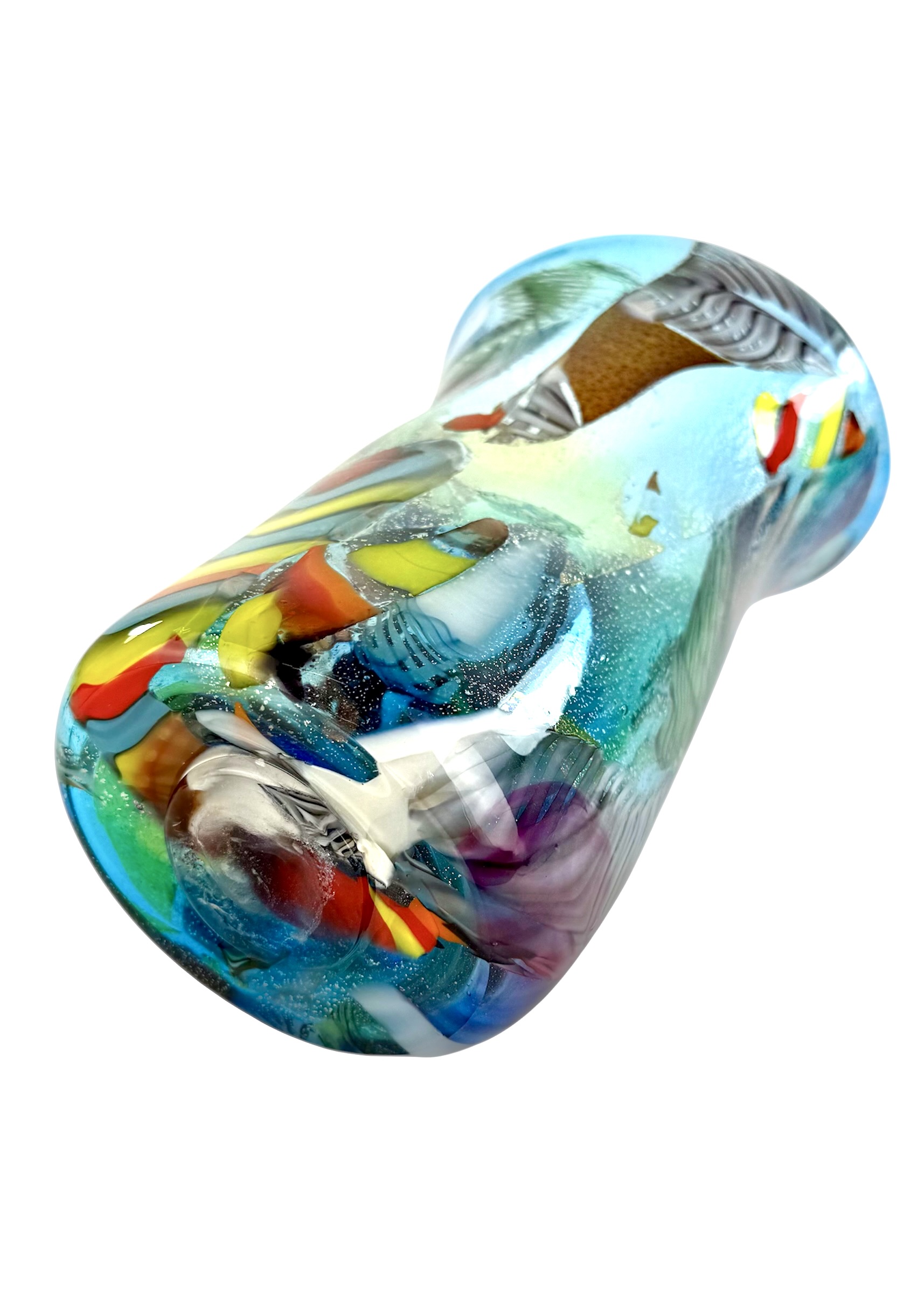 I pezzi Carnevale sono ritagli di varie lavorazioni in vetro di Murano multicolore che, fusi sul vaso, formano questa meravigliosa opera.