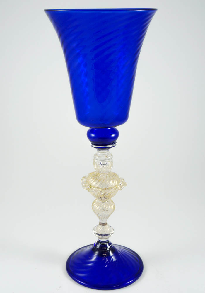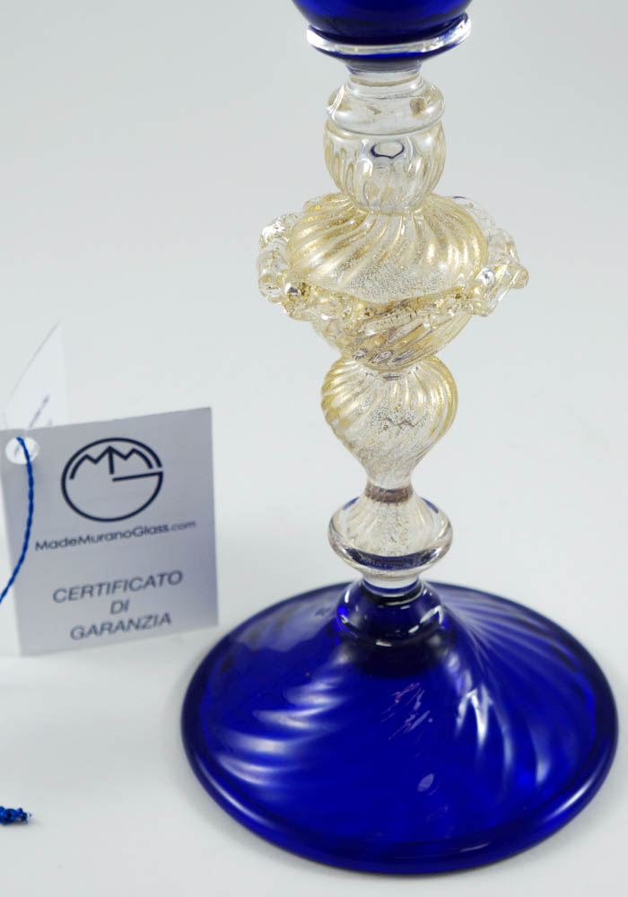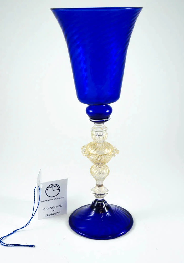 Magnifico calice in vetro Murano colore blu con decorazioni nel gambo in vera foglia oro 24 carati.
