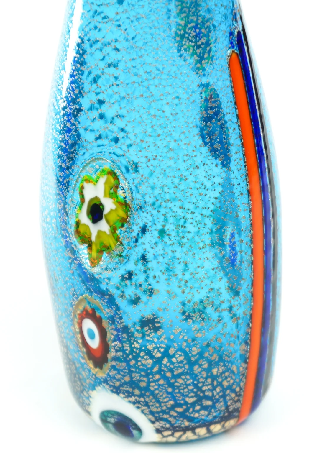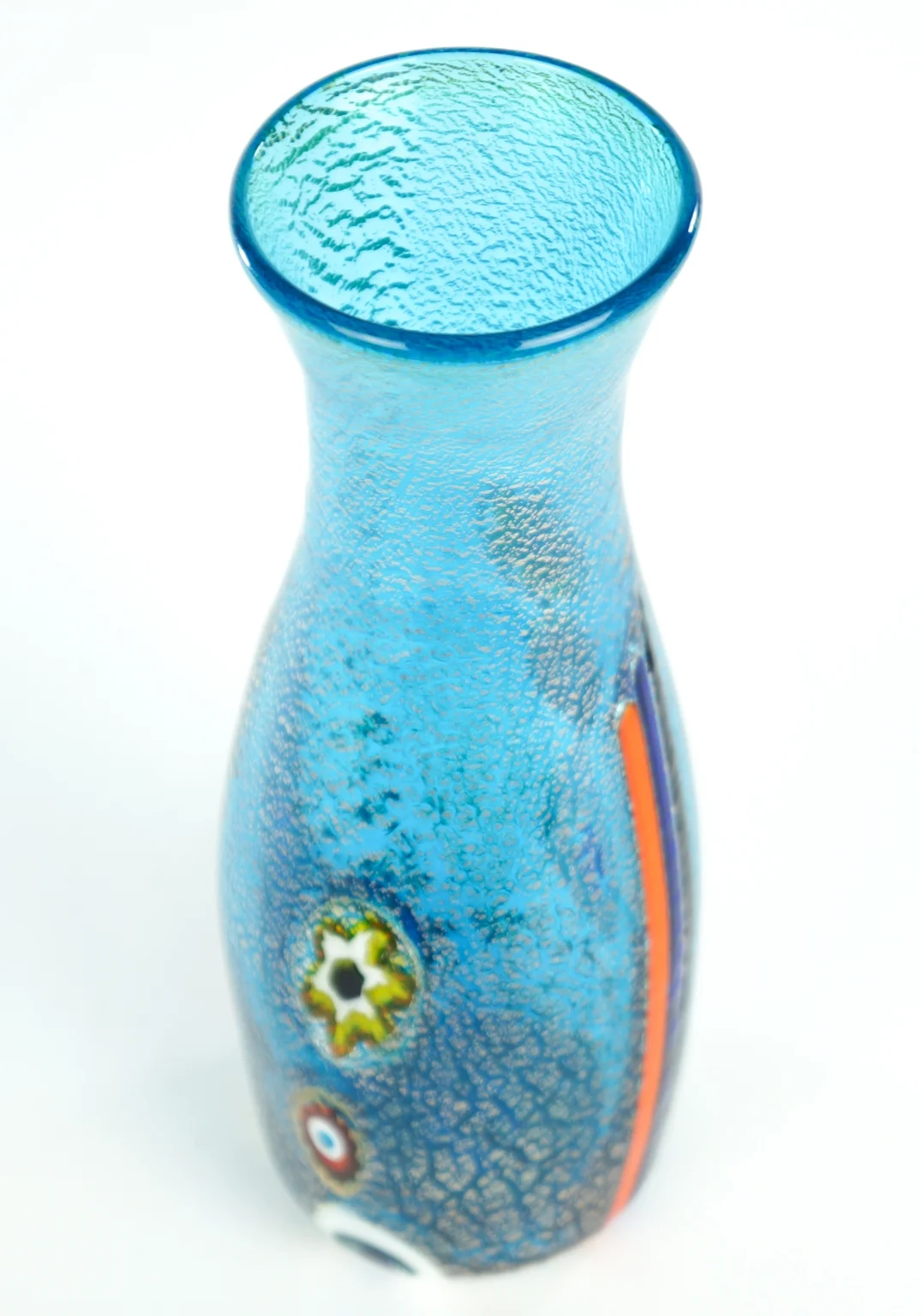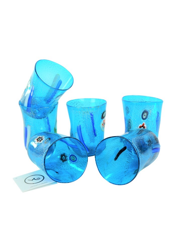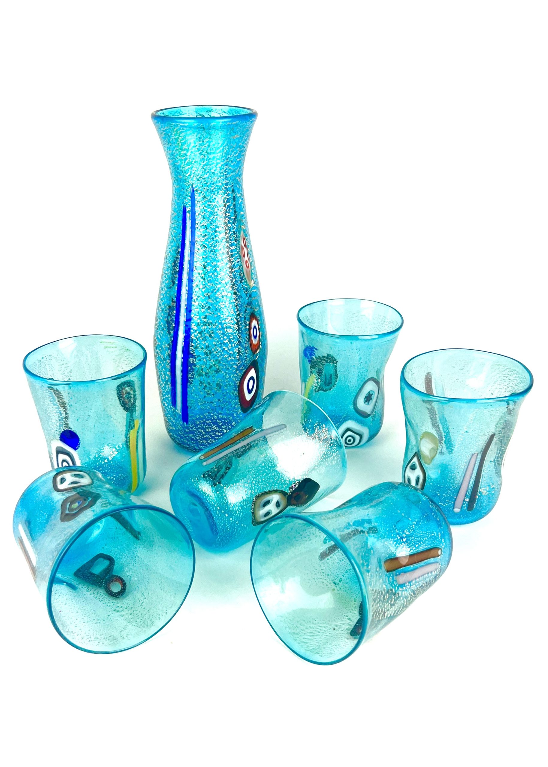 Il set comprende 6 Bicchieri e una Caraffa in Vetro Soffiato di Murano con decorazione in Murrina Millefiori e kanne di vetro.
