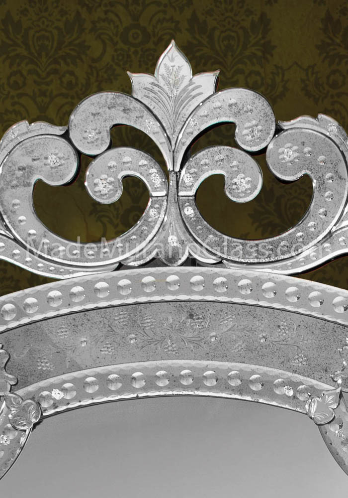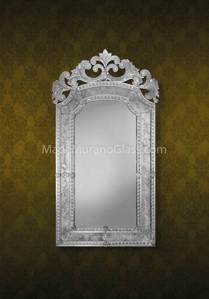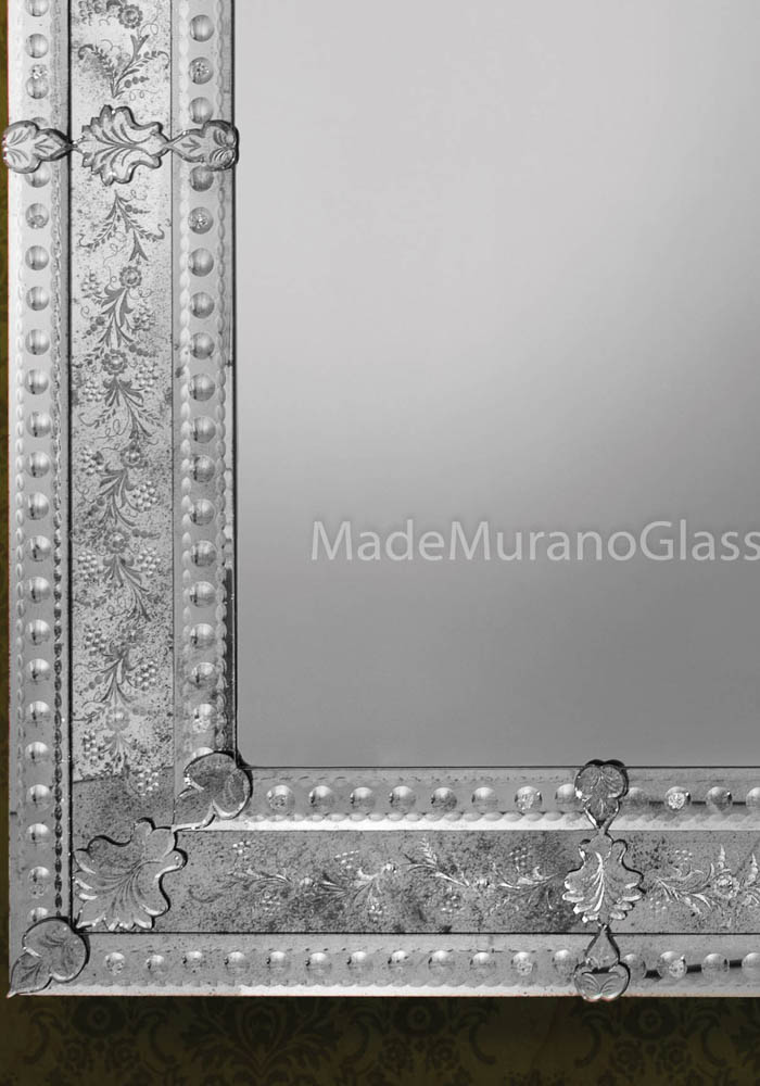 Fantastico specchio veneziano cm 170×93 in vetro Murano eseguito artigianalmente dai Maestri vetrai di Murano e da altrettanti artisti del montaggio gli specchieri veneziani che incidono a mano libera questa magnifica opera, rendendola unica e inimitabile