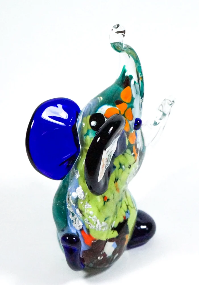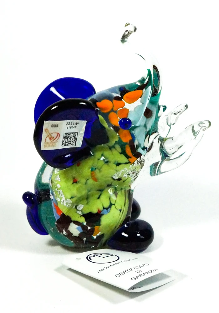 Simpatica ed esclusiva collezione di animali in vetro Murano eseguiti con tecnica di lavorazione chiamata dai Maestri vetrai di Murano “Sommerso”. Elefante con colori assortiti, Mace, Murrina e argento si mescolano tra di loro rendendo questa opera unica e inimitabile. Opera firmata con incisione a freddo Dal Maestro vetraio (Mario Costantini). Etichetta Vetro Artistico® Murano. Vedi foto dettagli.