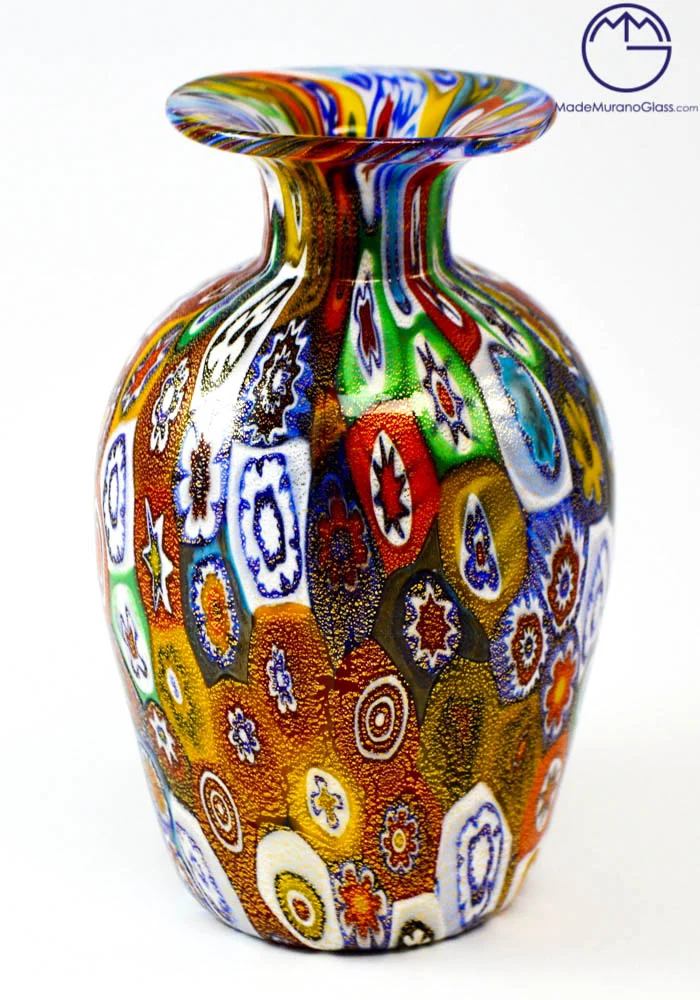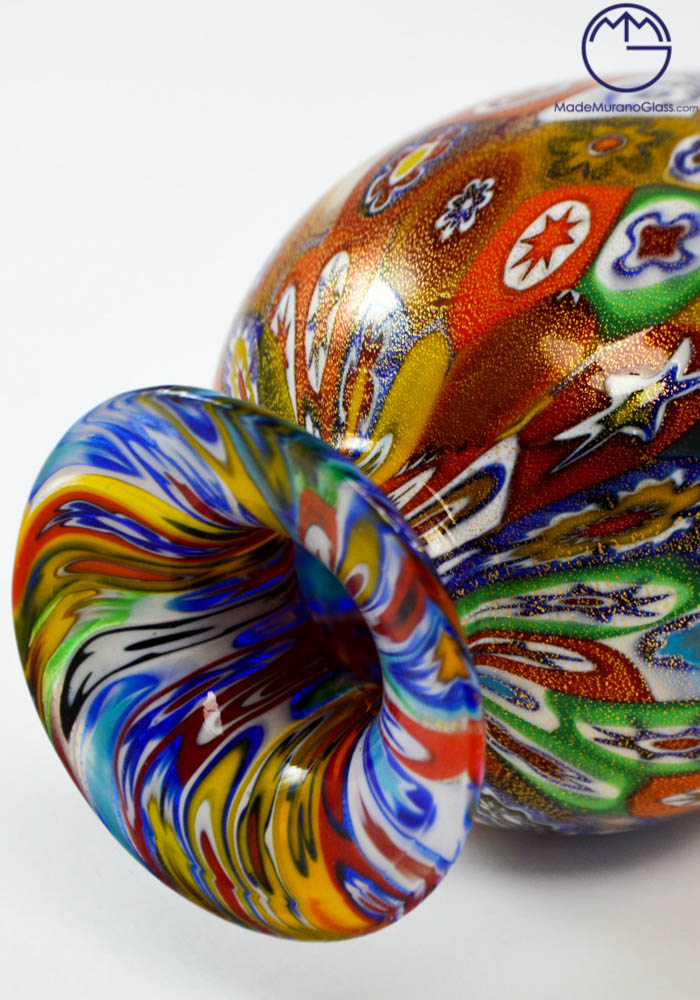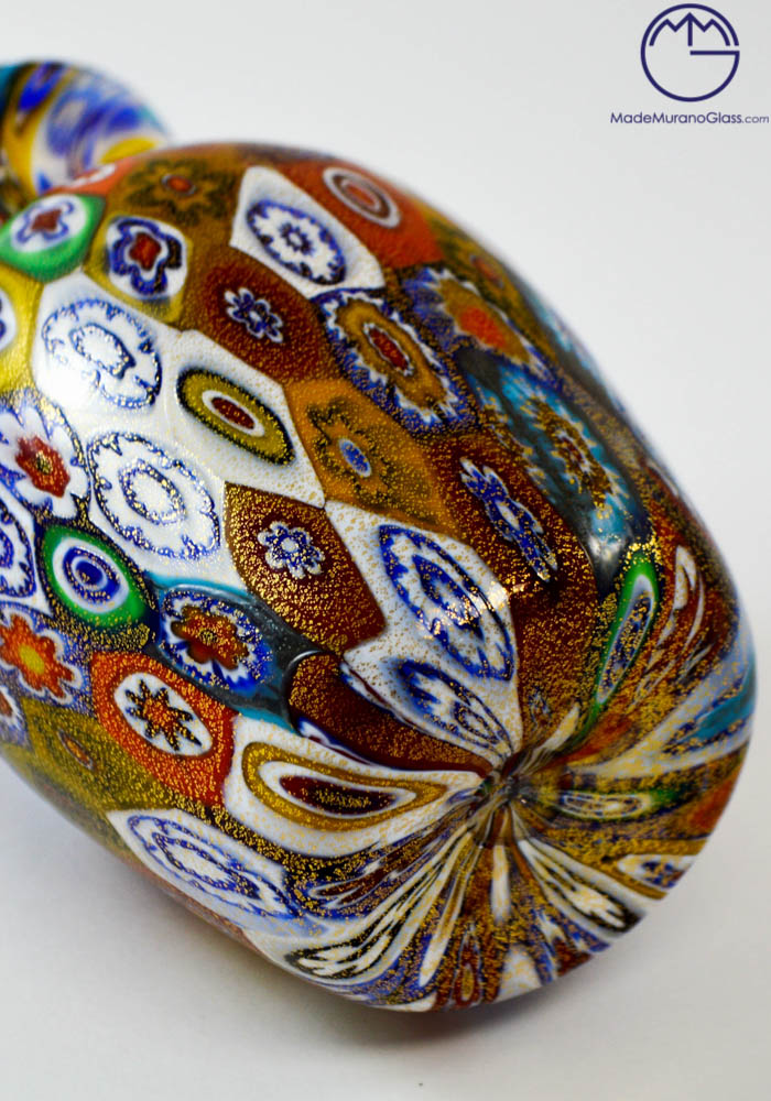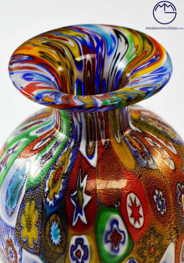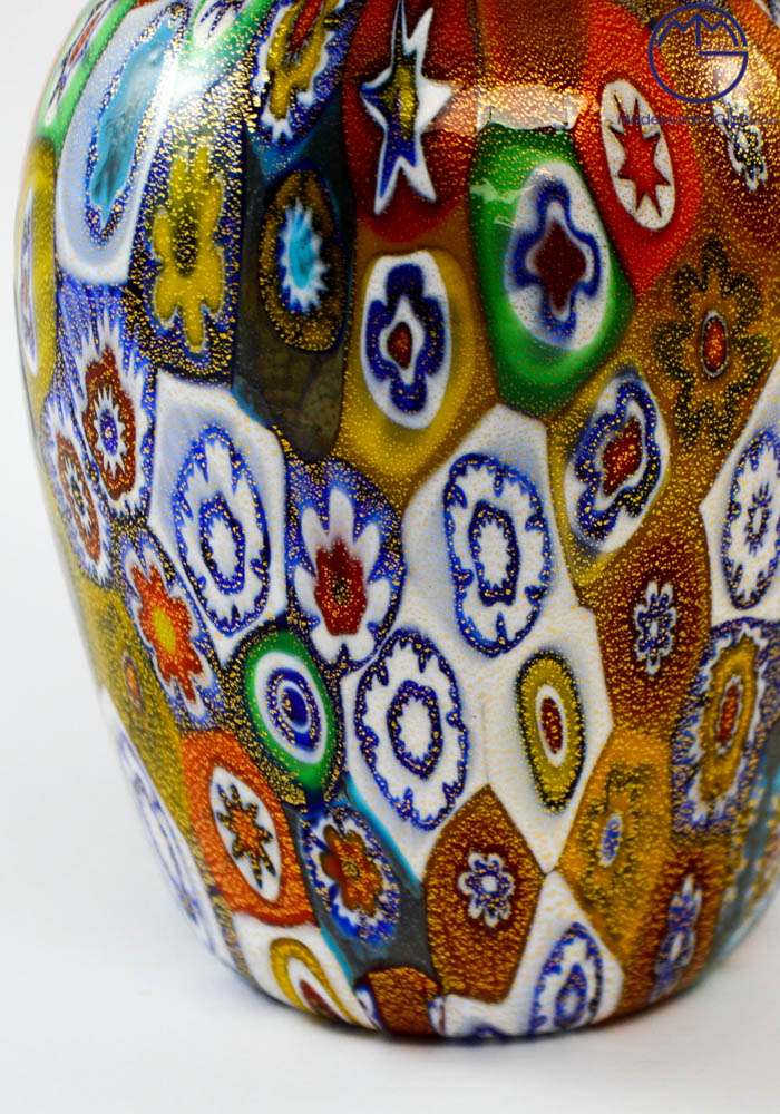 Esclusiva lavorazione del vetro soffiato di Murano eseguita per realizzare questo vaso moderno con murrine millefiori e ricoperto di foglia oro 24kt . Il posizionamento delle murrine viene effettuato con molta cura e precisione da abili artisti, essendo posti uno a uno i pezzettini di vetro (murrine) in una piastra per poi essere fusi assieme al cristallo formando un intrigante mosaico colorato. Ottima idea regalo per bomboniere o design.