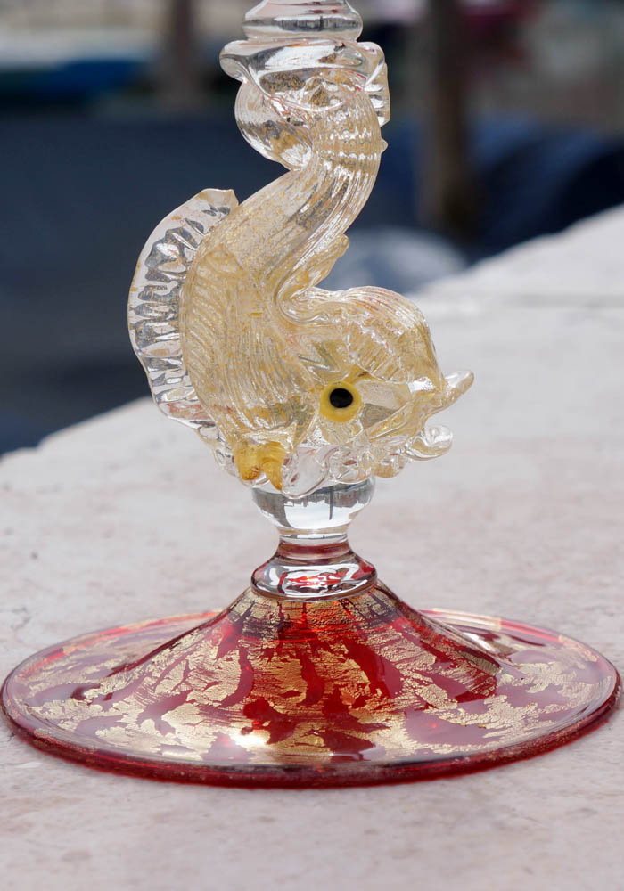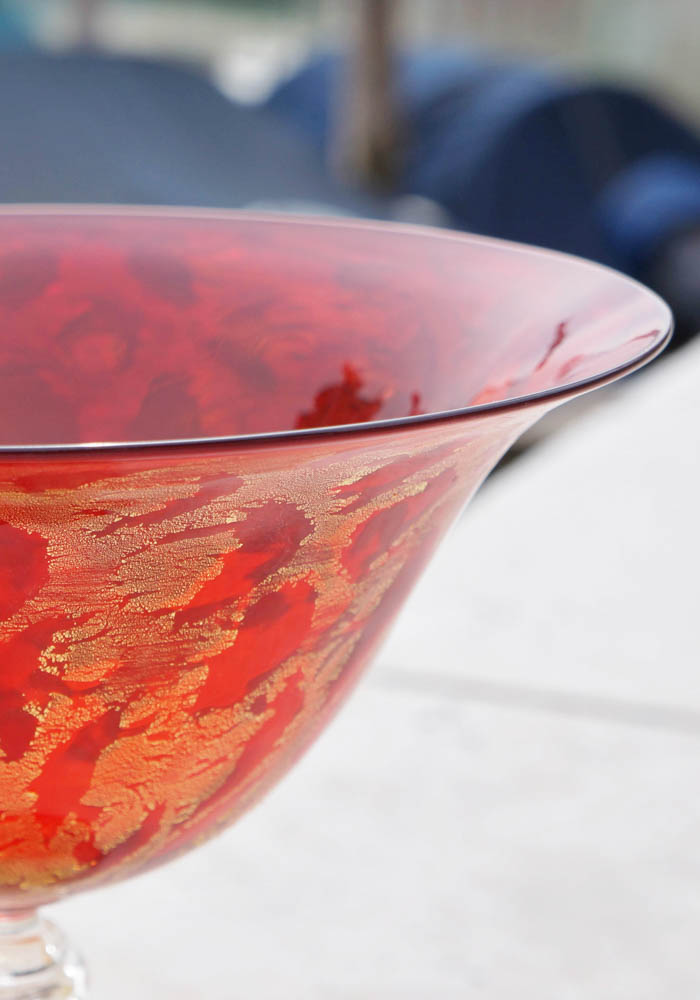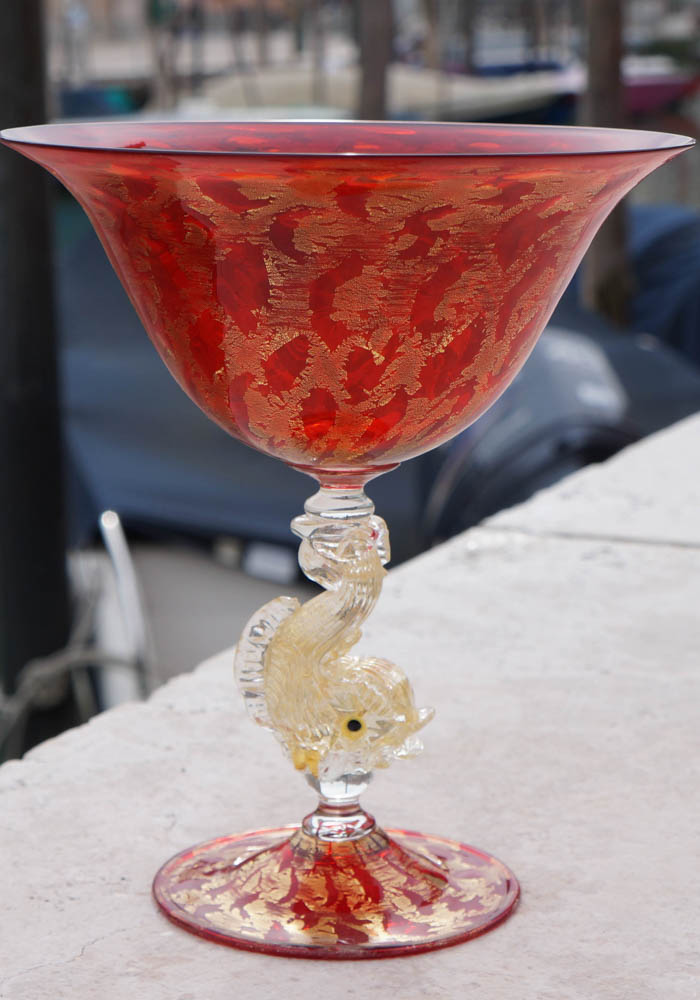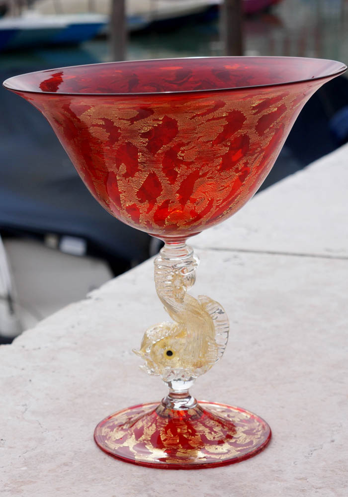 Elegantissima coppa in vetro Murano color rosso con delfino nel gambo, il tutto ricoperto in foglie oro 24kt. I nostri articoli di Made Murano Glass sono tutti eseguiti esclusivamente a mano dai nostri famosi Maestri vetrai dell’Isola, rendendo le nostre opere uniche e inimitabili. Per completare al meglio la nostra unicità il Maestro vetraio incide a freddo la propria firma nell’opera.