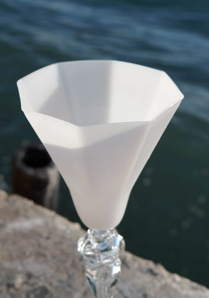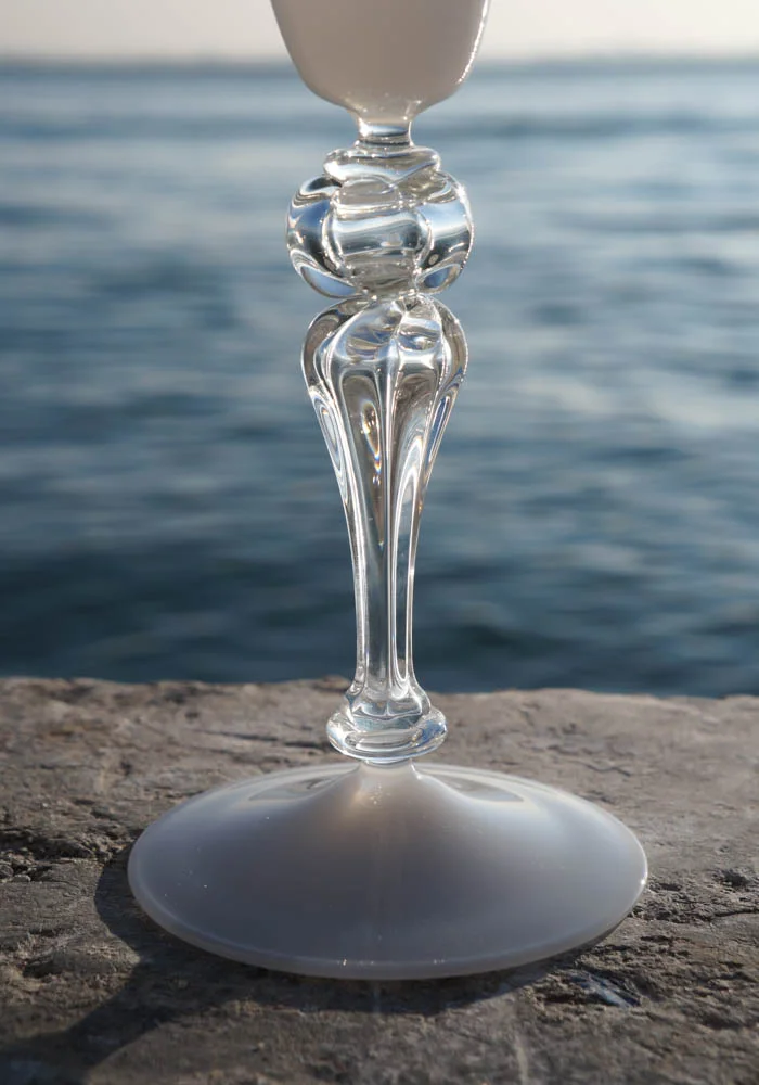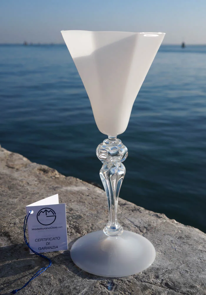 Cortina è un calice bianco con bevante a forma ottagonale e gambo in colore cristallo, eseguito interamente a mano in vetro soffiato di Murano. Elegante e raffinato, questa fantastica opera darà un tocco aggiuntivo di classe al vostro ambiente, creando una magica atmosfera. Il calice viene eseguito dai Maestri vetrai di Murano Cortella&Ballarin.