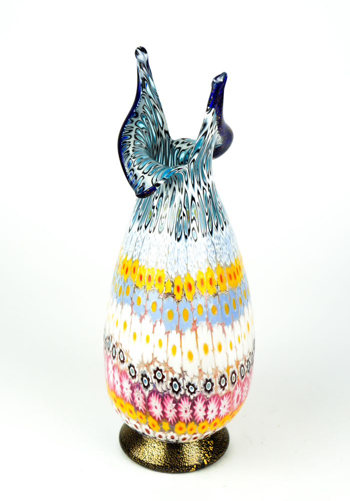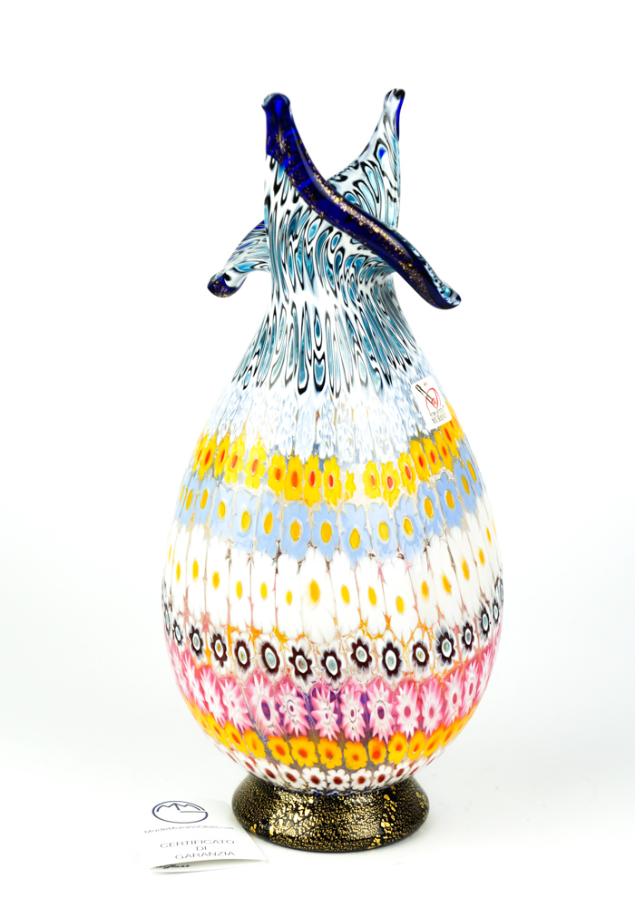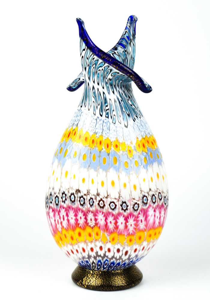 Dida fa parte della nostra collezione Mosaico ed è un fantastico vaso in vetro soffiato di Murano lavorato con murrina Millefiori e dettaglio in foglia oro 24 kt.