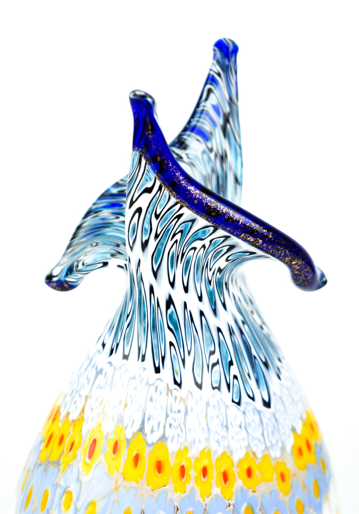 Il posizionamento delle murrine Millefiori viene effettuato con molta cura e precisione, essendo posti uno a uno i pezzettini di vetro (murrine) in una piastra per poi essere fusi assieme al cristallo formando un intrigante mosaico.