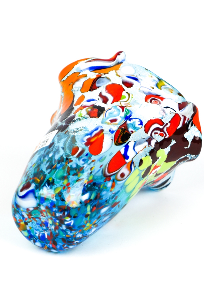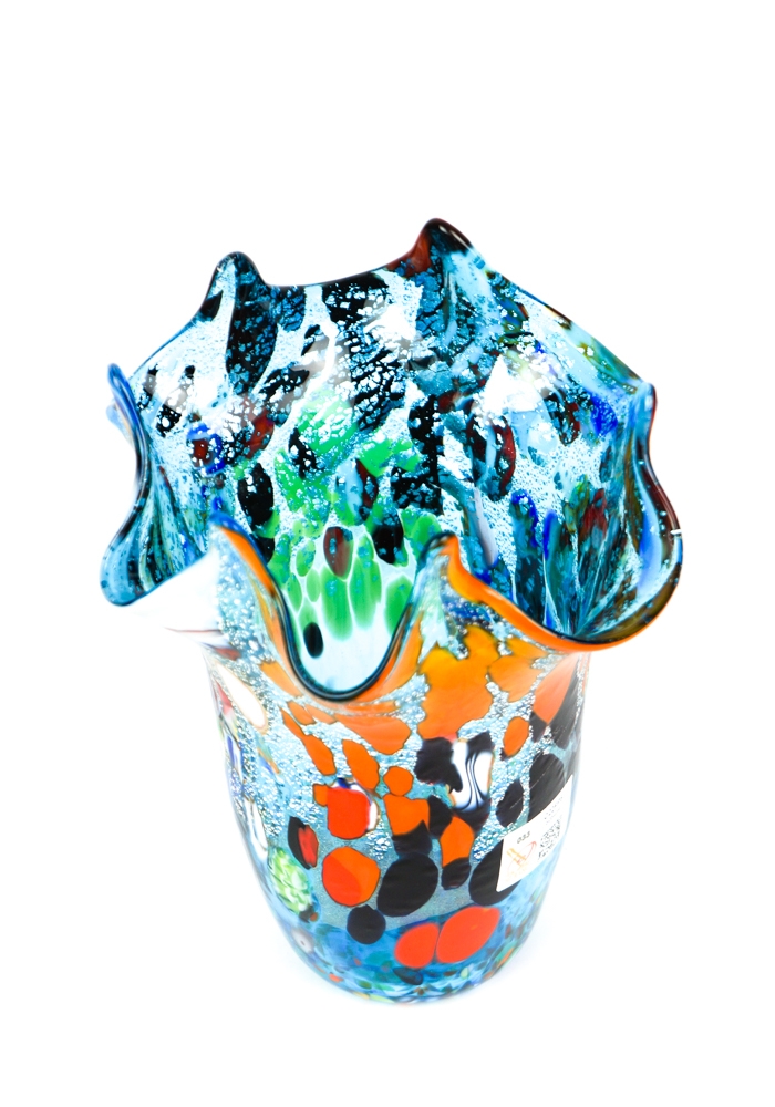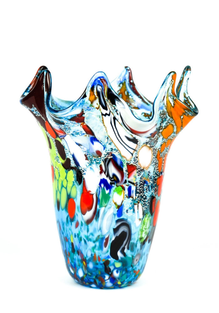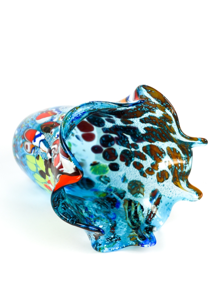 Divo è un vaso a forma di fazzoletto in vetro soffiato di Murano colore acquamarina con decorazioni assortite di filigrana, Murrine, avventurina, “Mace” di vetro e foglia di argento. Il Maestro vetraio di Murano “Imperio Rossi” mescola questi colori di volta in volta in maniera sempre differente, rendendo così le sue opere uniche e inimitabili. Opera firmata con incisione a freddo dall’artista (I. Rossi). Etichetta Vetro Artistico® Murano.