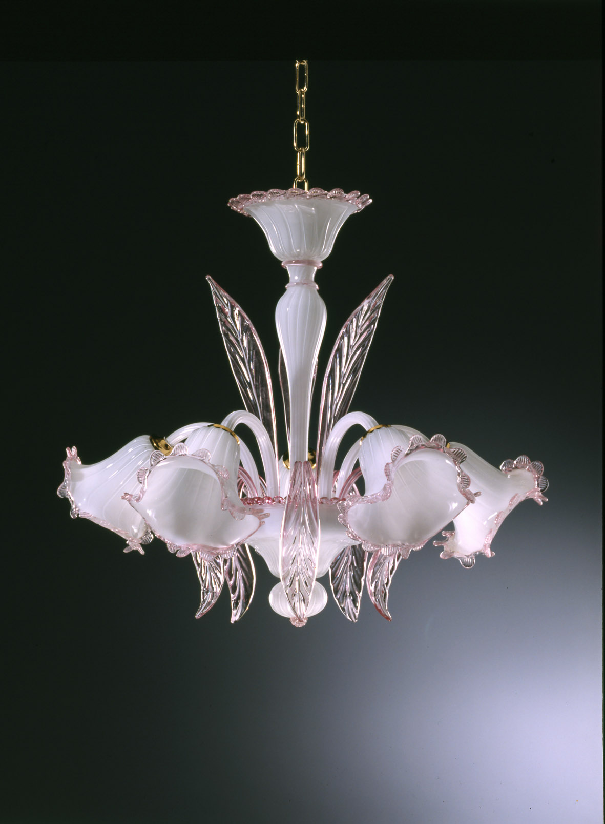 Elegantissimo lampadario Murano vetro artistico a 5 luci colore bianco con decorazioni rosa.