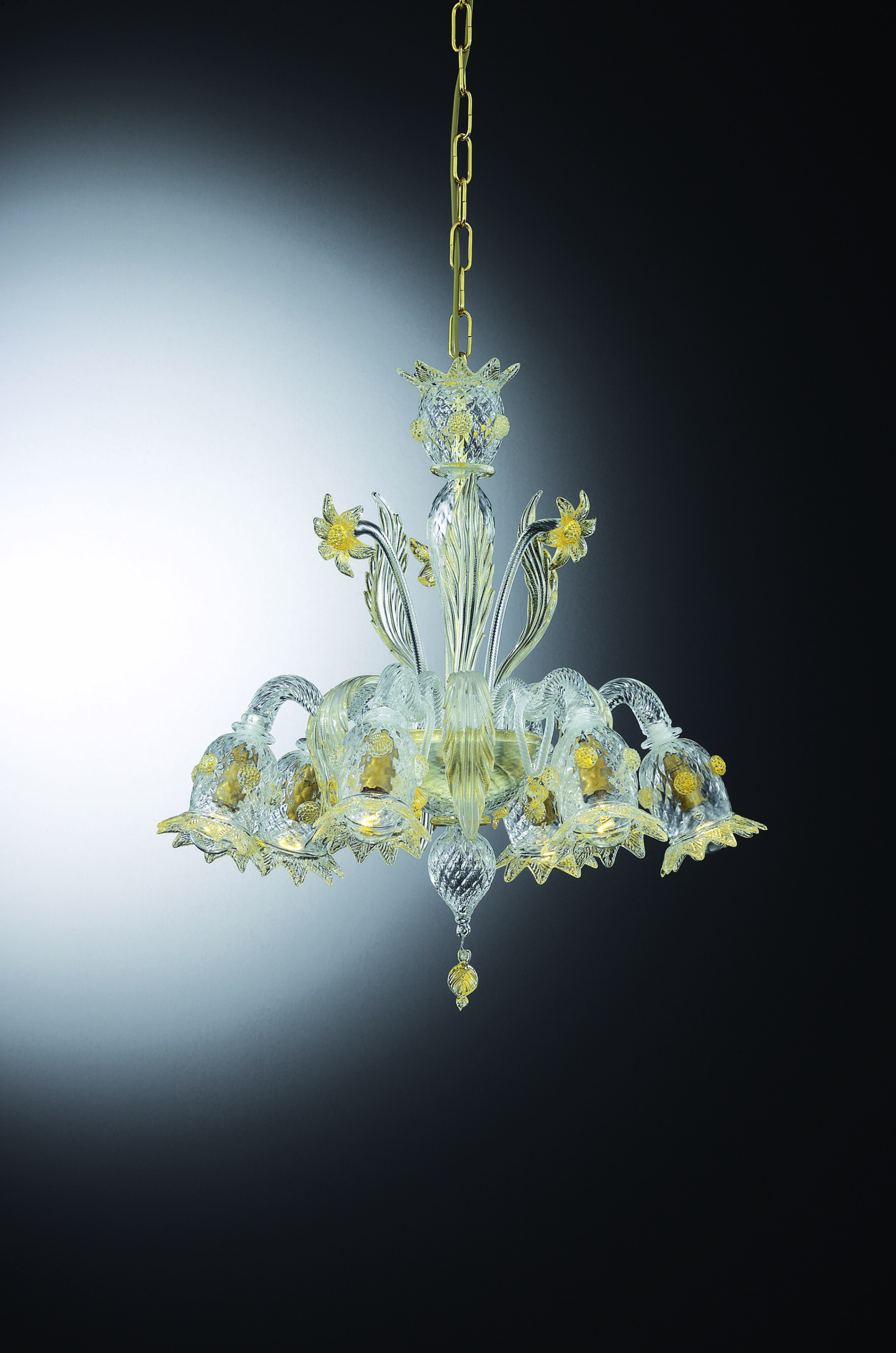 Elegantissimo lampadario Murano con 6 luci color cristallo con decoro in foglia oro 24 kt.
