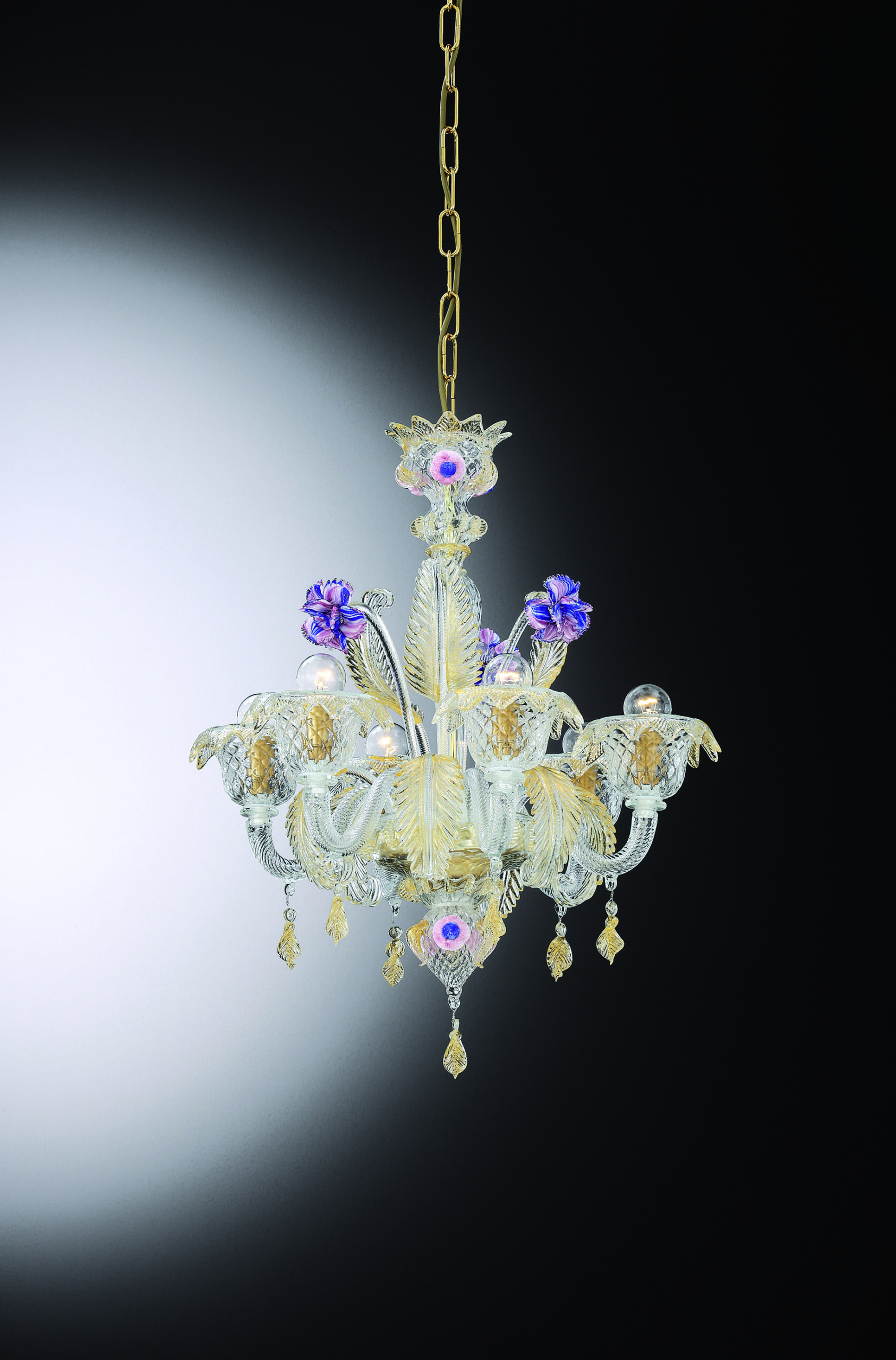 Elegantissimo lampadario Murano con 6 luci color cristallo con decoro in foglia oro 24kt e vetro in pasta colorata.