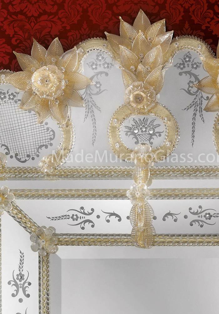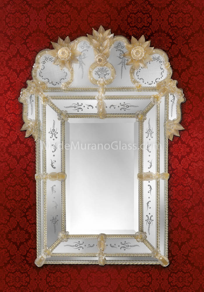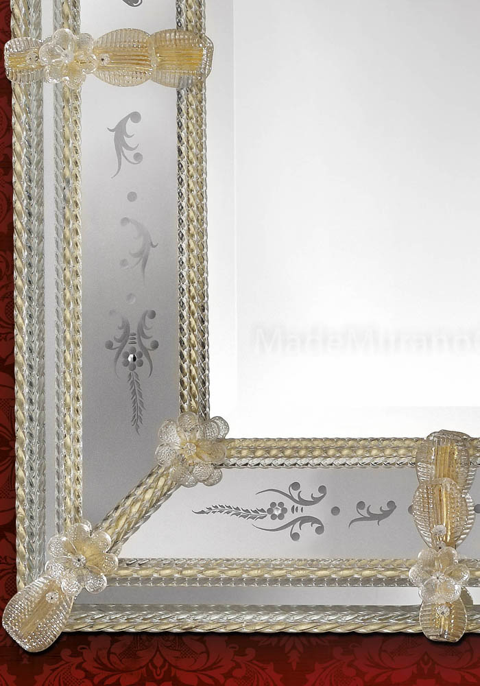 Torcello è un elegantissimo specchio veneziano in vetro Murano eseguito artigianalmente dai Maestri vetrai di Murano e da altrettanti artisti del montaggio gli specchieri veneziani che incidono a mano libera questa magnifica opera, rendendola unica e inimitabile