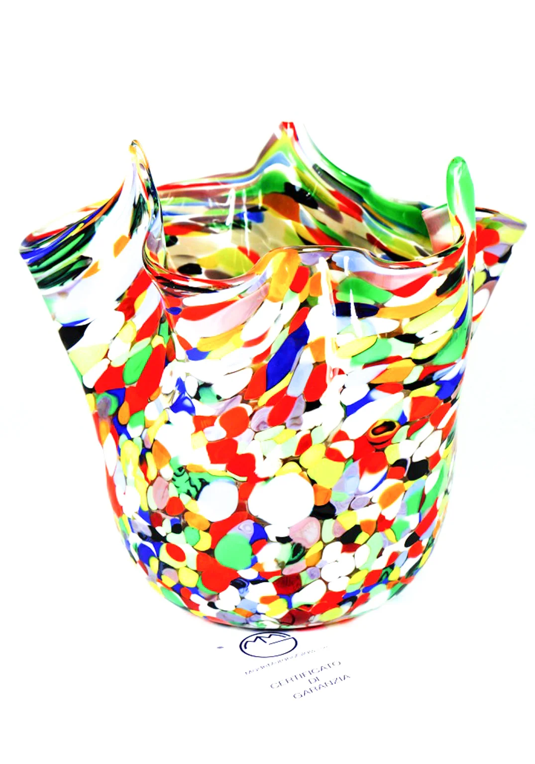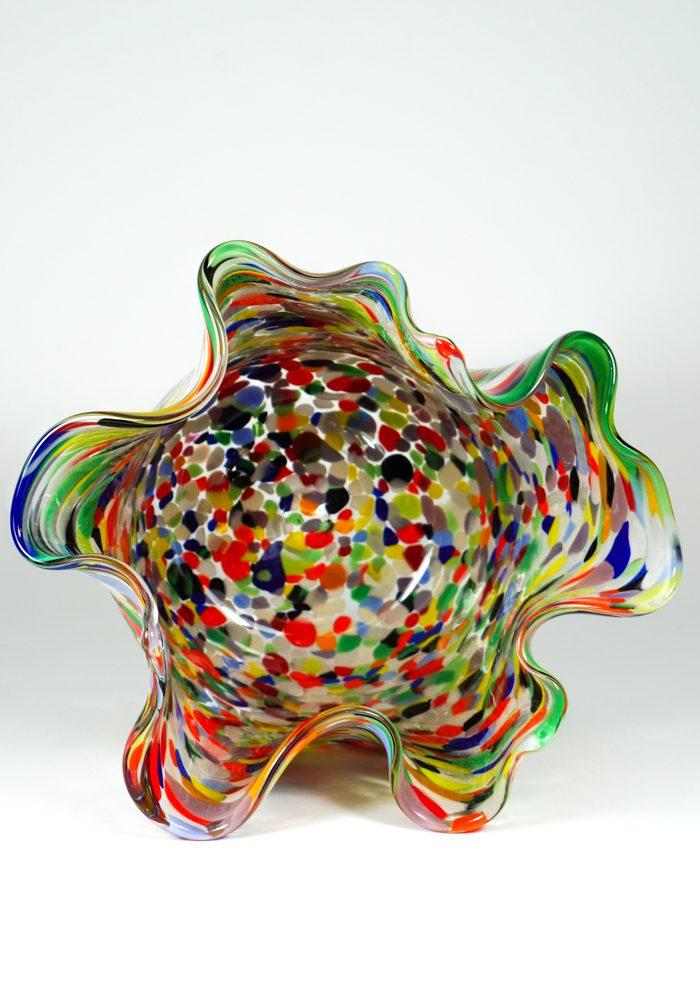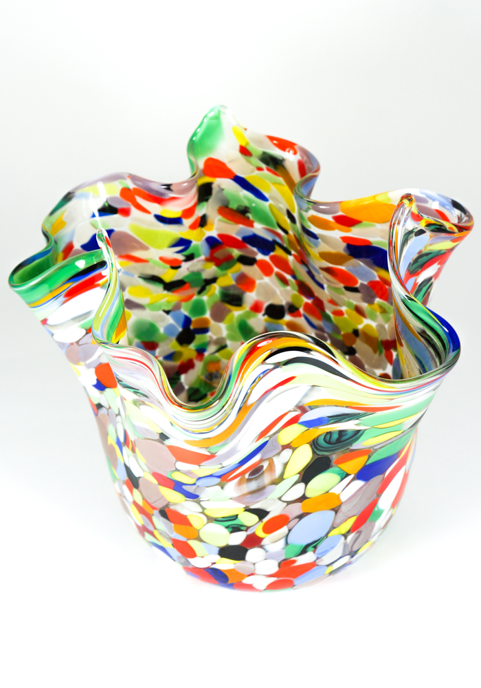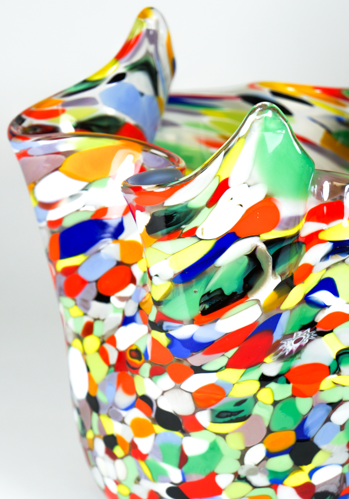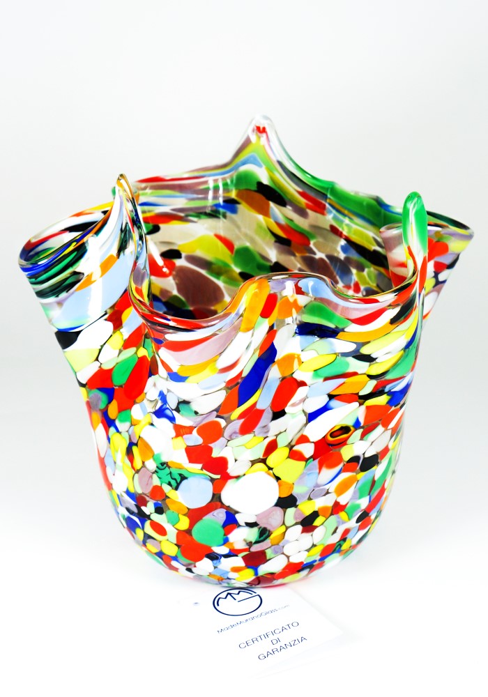 Vaso a forma di Fazzoletto in vetro soffiato di Murano eseguito interamente a mano con lavorazione a “Mace” di vetro multicolore.