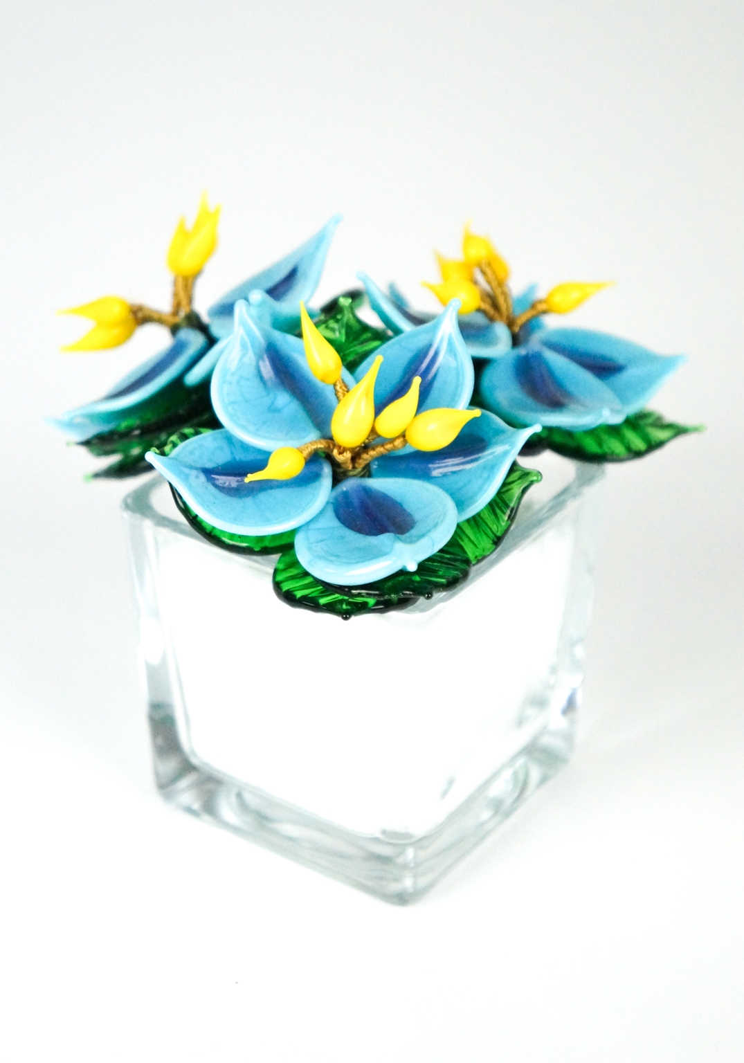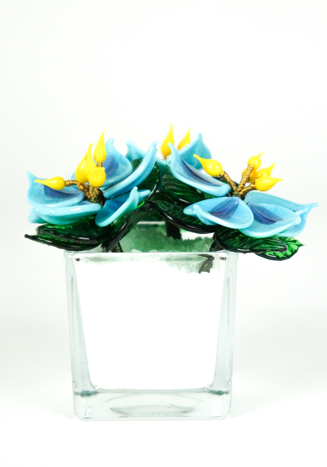 Fiore colore celeste blu giallo con foglie verdi e scaglie di vetro bianco per formare la terra.