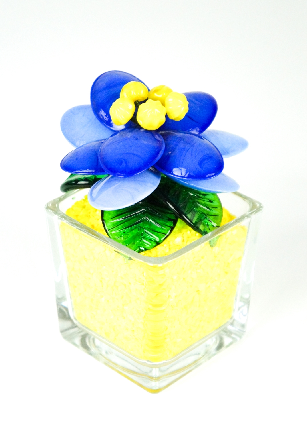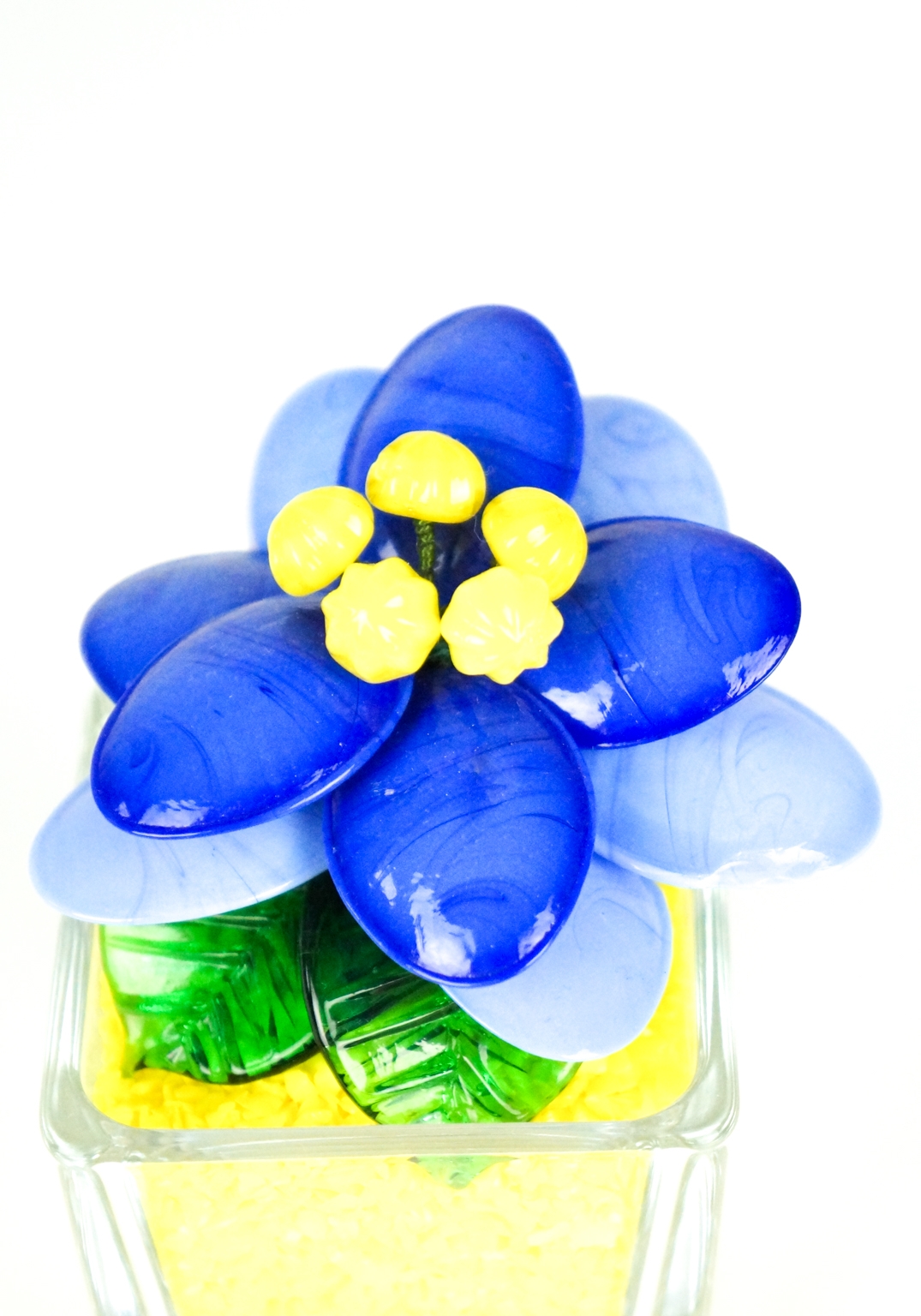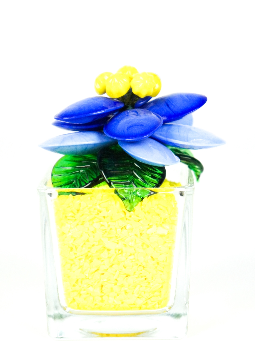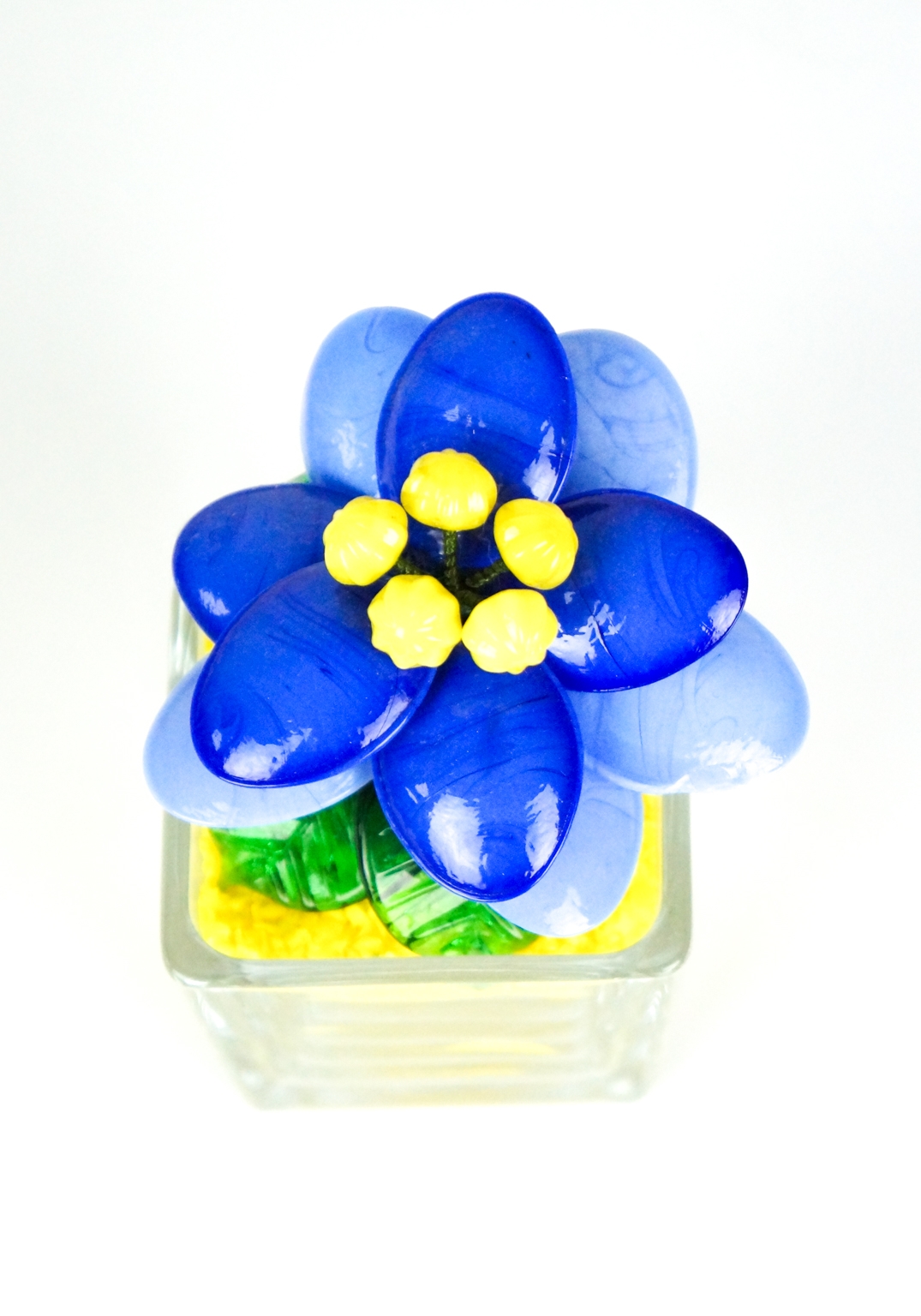 Fiore colore celeste blu giallo con foglie verdi e scaglie di vetro giallo per formare la terra.