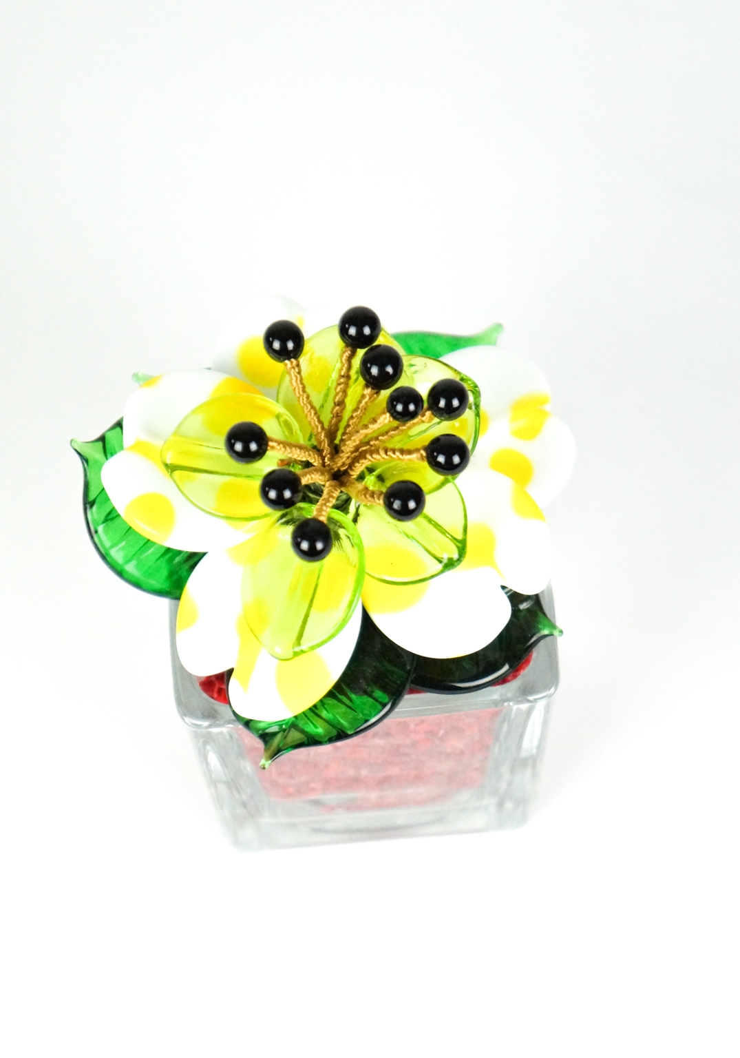 Fiore colore bianco, giallo, nero con foglie verdi e scaglie di vetro rosso per formare la terra.