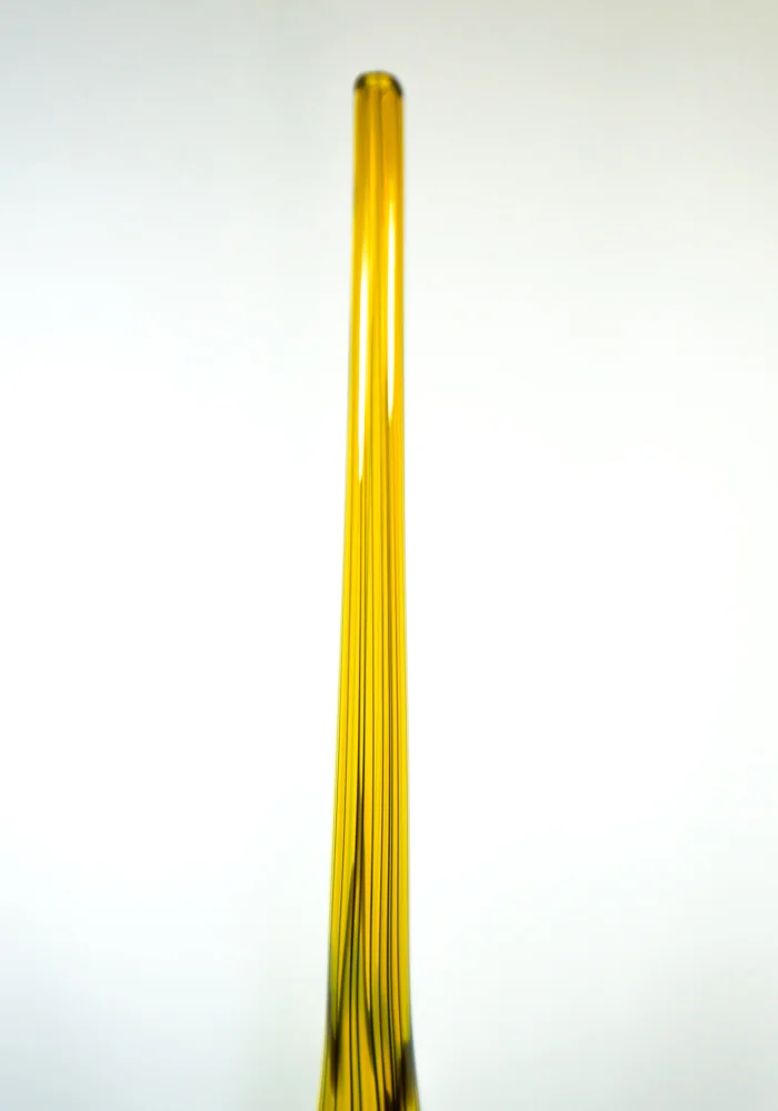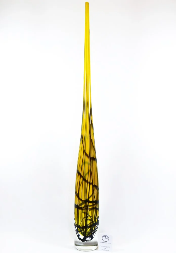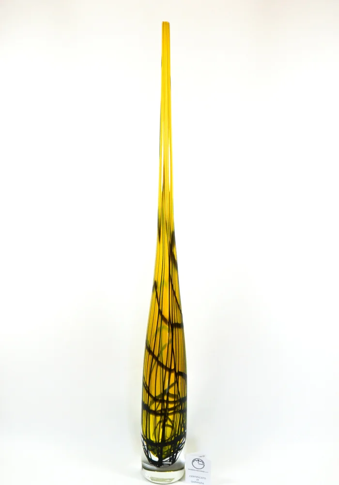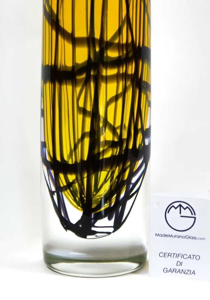 Flute fa parte di una collezione di vasi di Murano moderni, colore giallo con decoro a fili neri, interamente fatto a mano dal Maestro vetraio Beltrami.