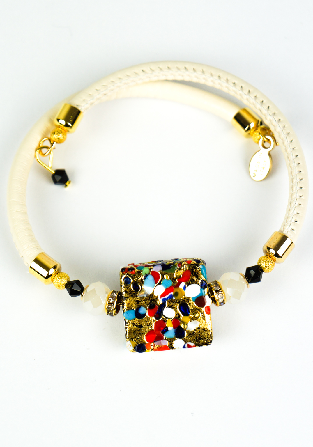 La perla di questo fantastico Bracciale è a forma quadrata, colore murrina Millefiori e foglia oro 24kt.
