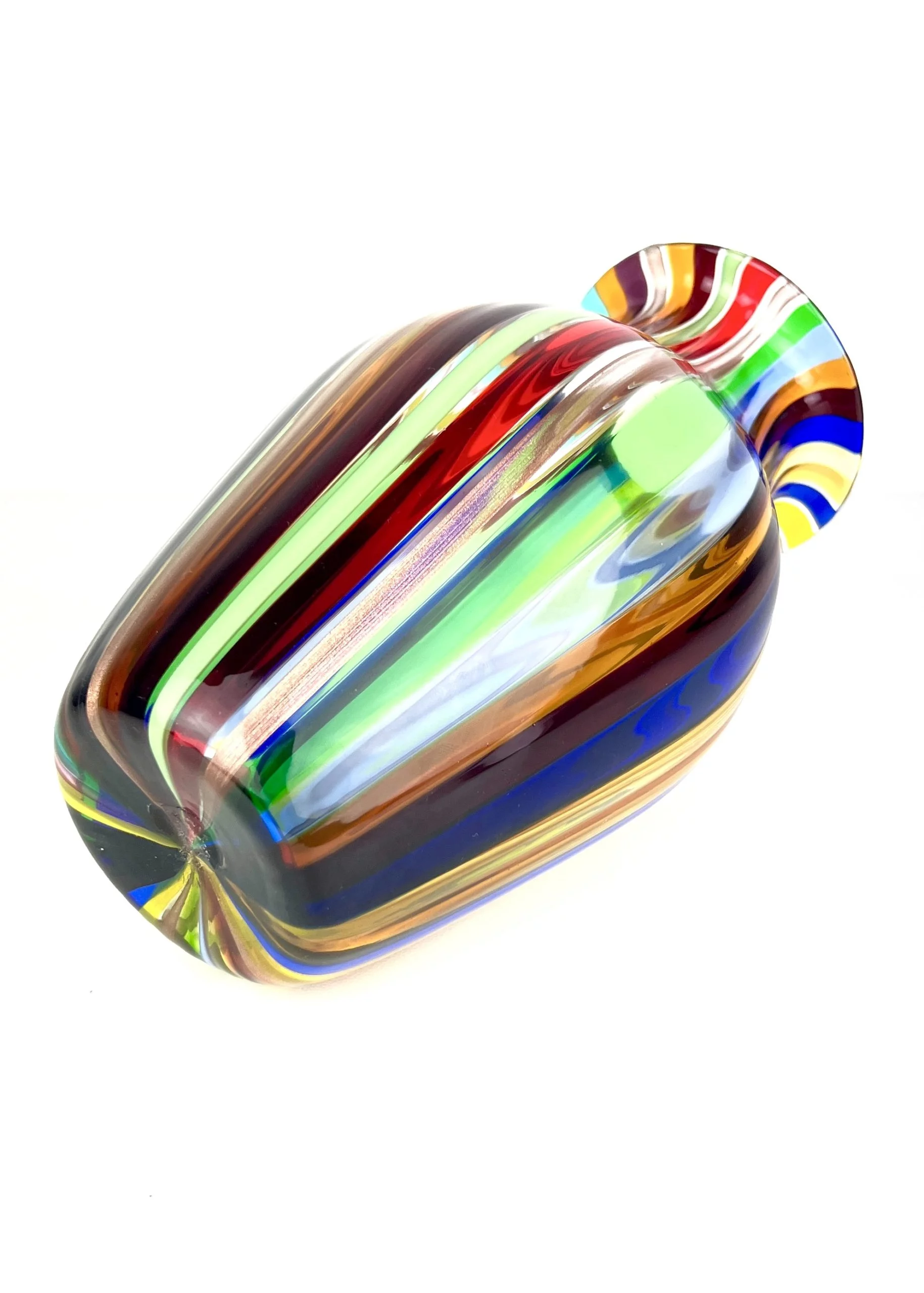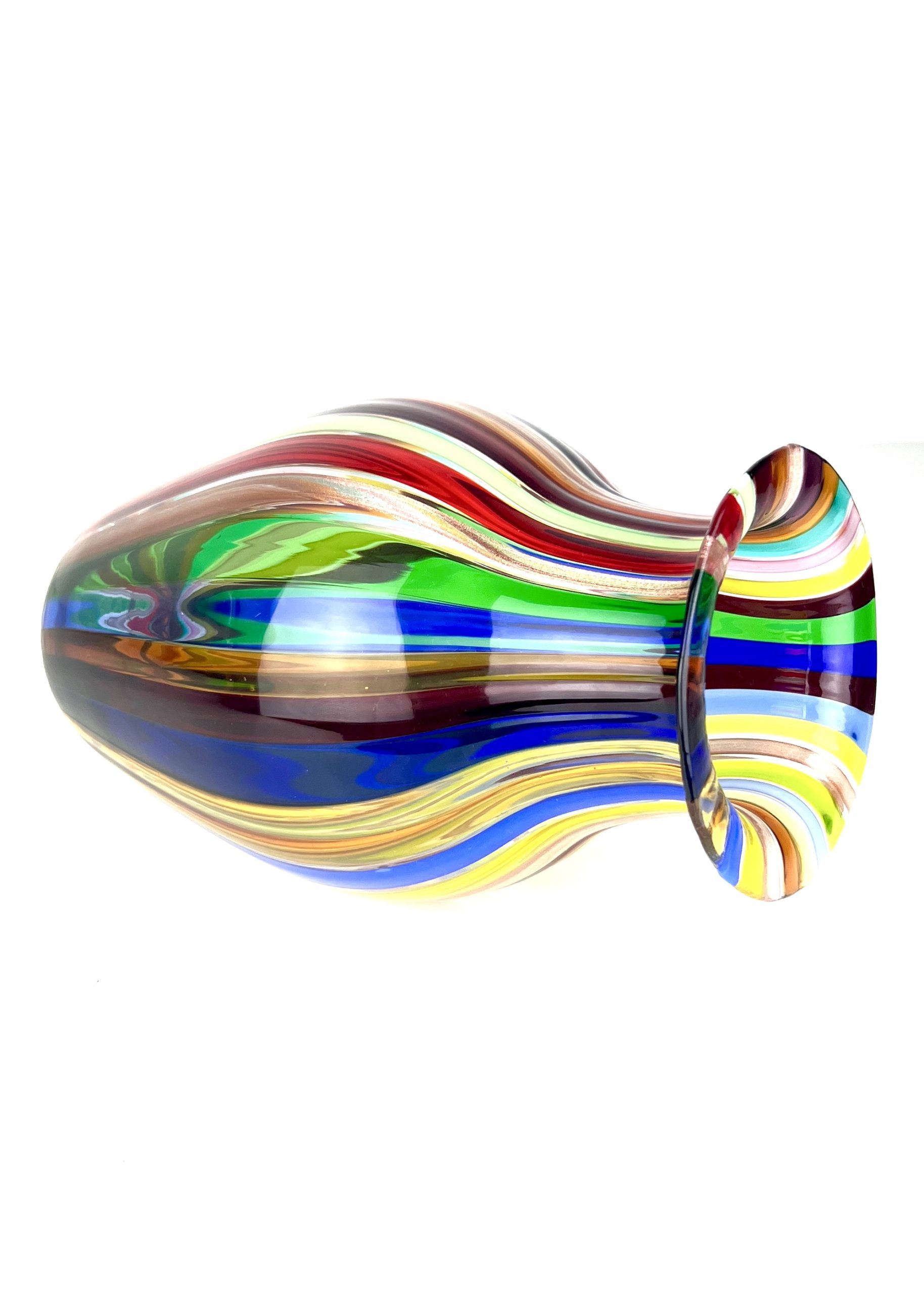 Vaso in vetro soffiato di Murano con kanne multicolore e avventurina.