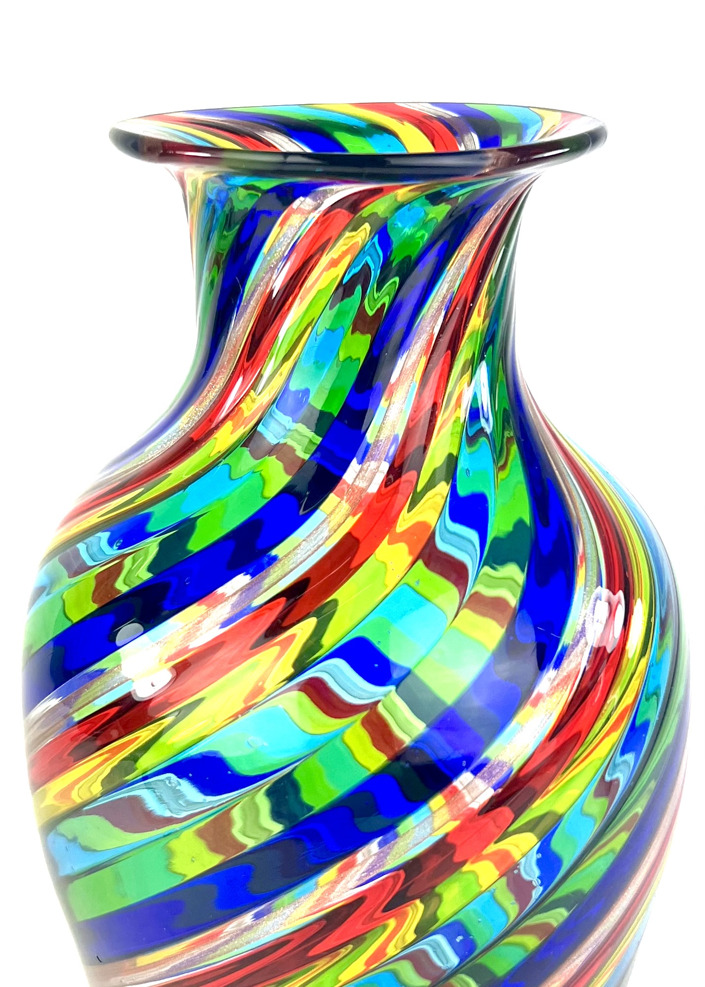 Vaso in vetro soffiato di Murano con kanne blu, acquamarina, gialle, ambra, rosse, arancio, verde e avventurina.