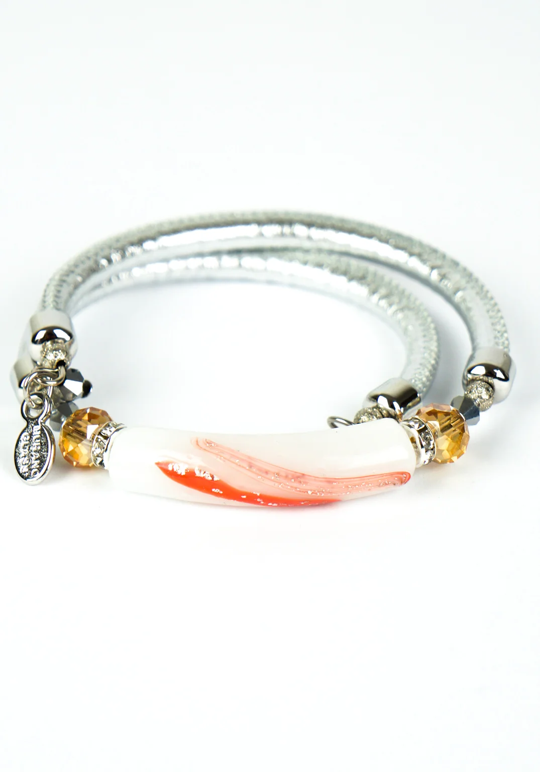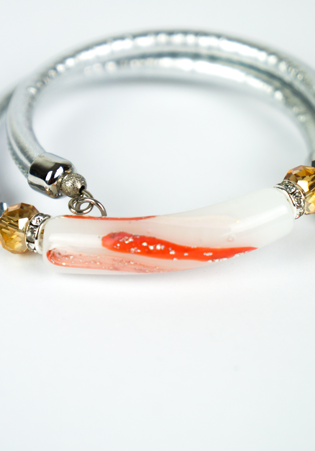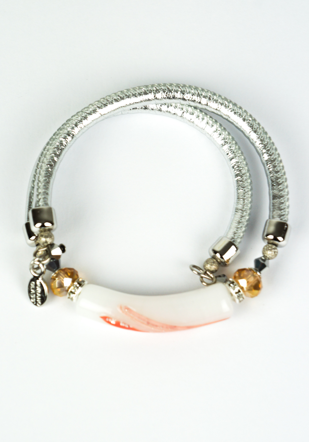 La perla di questo fantastico Bracciale è a forma allungata, colore bianco, foglia argento e dettaglio arancio.