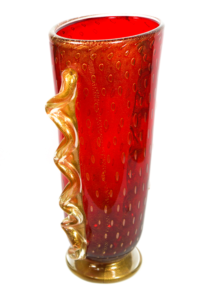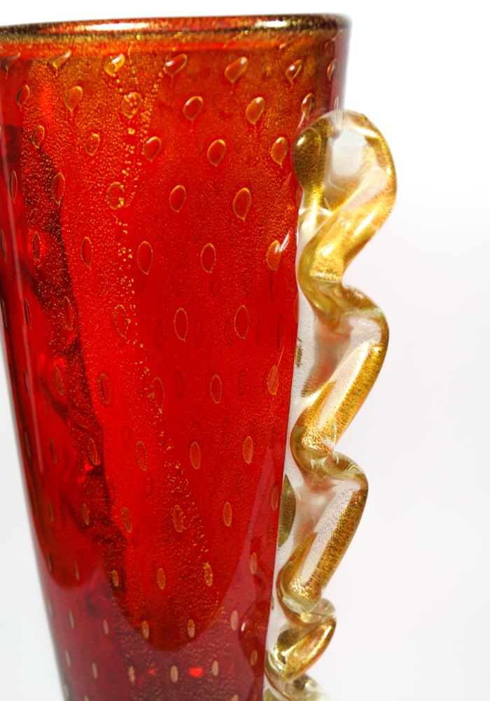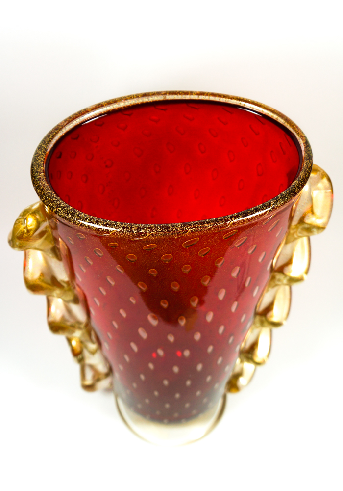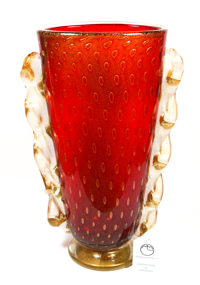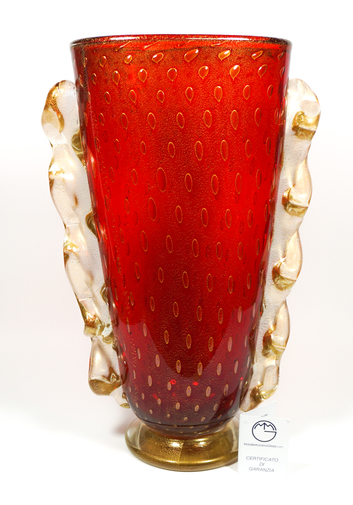 Vaso a balloton in vetro soffiato di Murano colore rosso con decorazioni a “morise” nei lati e base in foglia oro 24kt.